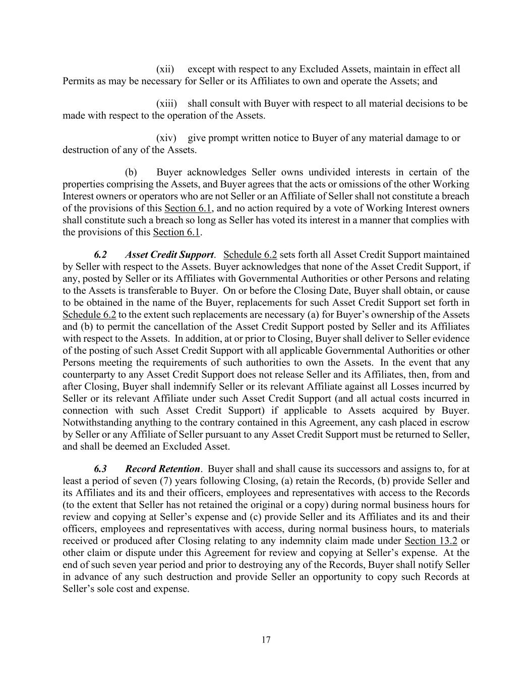 17 (xii) except with respect to any Excluded Assets, maintain in effect all Permits as may be necessary for Seller or its Affiliates to own and operate the Assets; and (xiii) shall consult with Buyer with respect to all material decisions to be made with respect to the operation of the Assets. (xiv) give prompt written notice to Buyer of any material damage to or destruction of any of the Assets. (b) Buyer acknowledges Seller owns undivided interests in certain of the properties comprising the Assets, and Buyer agrees that the acts or omissions of the other Working Interest owners or operators who are not Seller or an Affiliate of Seller shall not constitute a breach of the provisions of this Section 6.1, and no action required by a vote of Working Interest owners shall constitute such a breach so long as Seller has voted its interest in a manner that complies with the provisions of this Section 6.1. 6.2 Asset Credit Support. Schedule 6.2 sets forth all Asset Credit Support maintained by Seller with respect to the Assets. Buyer acknowledges that none of the Asset Credit Support, if any, posted by Seller or its Affiliates with Governmental Authorities or other Persons and relating to the Assets is transferable to Buyer. On or before the Closing Date, Buyer shall obtain, or cause to be obtained in the name of the Buyer, replacements for such Asset Credit Support set forth in Schedule 6.2 to the extent such replacements are necessary (a) for Buyer’s ownership of the Assets and (b) to permit the cancellation of the Asset Credit Support posted by Seller and its Affiliates with respect to the Assets. In addition, at or prior to Closing, Buyer shall deliver to Seller evidence of the posting of such Asset Credit Support with all applicable Governmental Authorities or other Persons meeting the requirements of such authorities to own the Assets. In the event that any counterparty to any Asset Credit Support does not release Seller and its Affiliates, then, from and after Closing, Buyer shall indemnify Seller or its relevant Affiliate against all Losses incurred by Seller or its relevant Affiliate under such Asset Credit Support (and all actual costs incurred in connection with such Asset Credit Support) if applicable to Assets acquired by Buyer. Notwithstanding anything to the contrary contained in this Agreement, any cash placed in escrow by Seller or any Affiliate of Seller pursuant to any Asset Credit Support must be returned to Seller, and shall be deemed an Excluded Asset. 6.3 Record Retention. Buyer shall and shall cause its successors and assigns to, for at least a period of seven (7) years following Closing, (a) retain the Records, (b) provide Seller and its Affiliates and its and their officers, employees and representatives with access to the Records (to the extent that Seller has not retained the original or a copy) during normal business hours for review and copying at Seller’s expense and (c) provide Seller and its Affiliates and its and their officers, employees and representatives with access, during normal business hours, to materials received or produced after Closing relating to any indemnity claim made under Section 13.2 or other claim or dispute under this Agreement for review and copying at Seller’s expense. At the end of such seven year period and prior to destroying any of the Records, Buyer shall notify Seller in advance of any such destruction and provide Seller an opportunity to copy such Records at Seller’s sole cost and expense.