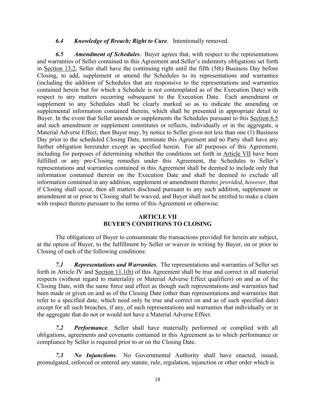 18 6.4 Knowledge of Breach; Right to Cure. Intentionally removed. 6.5 Amendment of Schedules. Buyer agrees that, with respect to the representations and warranties of Seller contained in this Agreement and Seller’s indemnity obligations set forth in Section 13.2, Seller shall have the continuing right until the fifth (5th) Business Day before Closing, to add, supplement or amend the Schedules to its representations and warranties (including the addition of Schedules that are responsive to the representations and warranties contained herein but for which a Schedule is not contemplated as of the Execution Date) with respect to any matters occurring subsequent to the Execution Date. Each amendment or supplement to any Schedules shall be clearly marked so as to indicate the amending or supplemental information contained therein, which shall be presented in appropriate detail to Buyer. In the event that Seller amends or supplements the Schedules pursuant to this Section 6.5 and such amendment or supplement constitutes or reflects, individually or in the aggregate, a Material Adverse Effect, then Buyer may, by notice to Seller given not less than one (1) Business Day prior to the scheduled Closing Date, terminate this Agreement and no Party shall have any further obligation hereunder except as specified herein. For all purposes of this Agreement, including for purposes of determining whether the conditions set forth in Article VII have been fulfilled or any pre-Closing remedies under this Agreement, the Schedules to Seller’s representations and warranties contained in this Agreement shall be deemed to include only that information contained therein on the Execution Date and shall be deemed to exclude all information contained in any addition, supplement or amendment thereto; provided, however, that if Closing shall occur, then all matters disclosed pursuant to any such addition, supplement or amendment at or prior to Closing shall be waived, and Buyer shall not be entitled to make a claim with respect thereto pursuant to the terms of this Agreement or otherwise. ARTICLE VII BUYER’S CONDITIONS TO CLOSING The obligations of Buyer to consummate the transactions provided for herein are subject, at the option of Buyer, to the fulfillment by Seller or waiver in writing by Buyer, on or prior to Closing of each of the following conditions: 7.1 Representations and Warranties. The representations and warranties of Seller set forth in Article IV and Section 11.1(b) of this Agreement shall be true and correct in all material respects (without regard to materiality or Material Adverse Effect qualifiers) on and as of the Closing Date, with the same force and effect as though such representations and warranties had been made or given on and as of the Closing Date (other than representations and warranties that refer to a specified date, which need only be true and correct on and as of such specified date) except for all such breaches, if any, of such representations and warranties that individually or in the aggregate that do not or would not have a Material Adverse Effect. 7.2 Performance. Seller shall have materially performed or complied with all obligations, agreements and covenants contained in this Agreement as to which performance or compliance by Seller is required prior to or on the Closing Date. 7.3 No Injunctions. No Governmental Authority shall have enacted, issued, promulgated, enforced or entered any statute, rule, regulation, injunction or other order which is