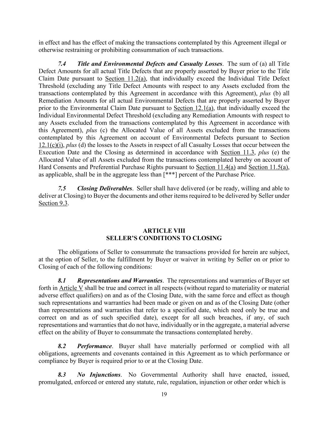 19 in effect and has the effect of making the transactions contemplated by this Agreement illegal or otherwise restraining or prohibiting consummation of such transactions. 7.4 Title and Environmental Defects and Casualty Losses. The sum of (a) all Title Defect Amounts for all actual Title Defects that are properly asserted by Buyer prior to the Title Claim Date pursuant to Section 11.2(a), that individually exceed the Individual Title Defect Threshold (excluding any Title Defect Amounts with respect to any Assets excluded from the transactions contemplated by this Agreement in accordance with this Agreement), plus (b) all Remediation Amounts for all actual Environmental Defects that are properly asserted by Buyer prior to the Environmental Claim Date pursuant to Section 12.1(a), that individually exceed the Individual Environmental Defect Threshold (excluding any Remediation Amounts with respect to any Assets excluded from the transactions contemplated by this Agreement in accordance with this Agreement), plus (c) the Allocated Value of all Assets excluded from the transactions contemplated by this Agreement on account of Environmental Defects pursuant to Section 12.1(c)(i), plus (d) the losses to the Assets in respect of all Casualty Losses that occur between the Execution Date and the Closing as determined in accordance with Section 11.3, plus (e) the Allocated Value of all Assets excluded from the transactions contemplated hereby on account of Hard Consents and Preferential Purchase Rights pursuant to Section 11.4(a) and Section 11.5(a), as applicable, shall be in the aggregate less than [***] percent of the Purchase Price. 7.5 Closing Deliverables. Seller shall have delivered (or be ready, willing and able to deliver at Closing) to Buyer the documents and other items required to be delivered by Seller under Section 9.3. ARTICLE VIII SELLER’S CONDITIONS TO CLOSING The obligations of Seller to consummate the transactions provided for herein are subject, at the option of Seller, to the fulfillment by Buyer or waiver in writing by Seller on or prior to Closing of each of the following conditions: 8.1 Representations and Warranties. The representations and warranties of Buyer set forth in Article V shall be true and correct in all respects (without regard to materiality or material adverse effect qualifiers) on and as of the Closing Date, with the same force and effect as though such representations and warranties had been made or given on and as of the Closing Date (other than representations and warranties that refer to a specified date, which need only be true and correct on and as of such specified date), except for all such breaches, if any, of such representations and warranties that do not have, individually or in the aggregate, a material adverse effect on the ability of Buyer to consummate the transactions contemplated hereby. 8.2 Performance. Buyer shall have materially performed or complied with all obligations, agreements and covenants contained in this Agreement as to which performance or compliance by Buyer is required prior to or at the Closing Date. 8.3 No Injunctions. No Governmental Authority shall have enacted, issued, promulgated, enforced or entered any statute, rule, regulation, injunction or other order which is