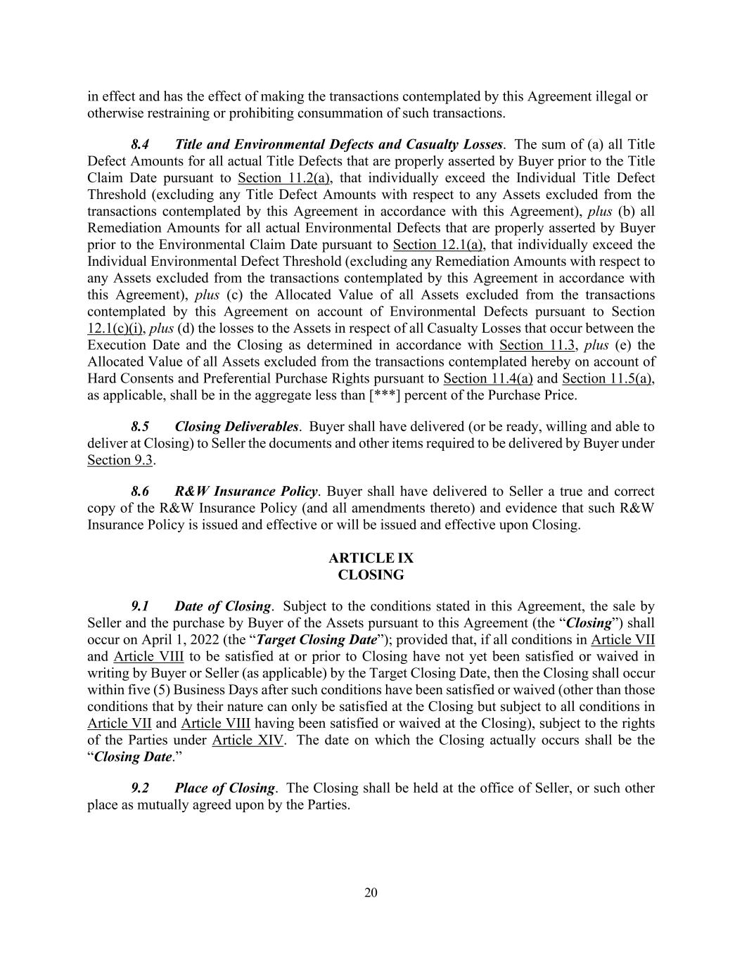 20 in effect and has the effect of making the transactions contemplated by this Agreement illegal or otherwise restraining or prohibiting consummation of such transactions. 8.4 Title and Environmental Defects and Casualty Losses. The sum of (a) all Title Defect Amounts for all actual Title Defects that are properly asserted by Buyer prior to the Title Claim Date pursuant to Section 11.2(a), that individually exceed the Individual Title Defect Threshold (excluding any Title Defect Amounts with respect to any Assets excluded from the transactions contemplated by this Agreement in accordance with this Agreement), plus (b) all Remediation Amounts for all actual Environmental Defects that are properly asserted by Buyer prior to the Environmental Claim Date pursuant to Section 12.1(a), that individually exceed the Individual Environmental Defect Threshold (excluding any Remediation Amounts with respect to any Assets excluded from the transactions contemplated by this Agreement in accordance with this Agreement), plus (c) the Allocated Value of all Assets excluded from the transactions contemplated by this Agreement on account of Environmental Defects pursuant to Section 12.1(c)(i), plus (d) the losses to the Assets in respect of all Casualty Losses that occur between the Execution Date and the Closing as determined in accordance with Section 11.3, plus (e) the Allocated Value of all Assets excluded from the transactions contemplated hereby on account of Hard Consents and Preferential Purchase Rights pursuant to Section 11.4(a) and Section 11.5(a), as applicable, shall be in the aggregate less than [***] percent of the Purchase Price. 8.5 Closing Deliverables. Buyer shall have delivered (or be ready, willing and able to deliver at Closing) to Seller the documents and other items required to be delivered by Buyer under Section 9.3. 8.6 R&W Insurance Policy. Buyer shall have delivered to Seller a true and correct copy of the R&W Insurance Policy (and all amendments thereto) and evidence that such R&W Insurance Policy is issued and effective or will be issued and effective upon Closing. ARTICLE IX CLOSING 9.1 Date of Closing. Subject to the conditions stated in this Agreement, the sale by Seller and the purchase by Buyer of the Assets pursuant to this Agreement (the “Closing”) shall occur on April 1, 2022 (the “Target Closing Date”); provided that, if all conditions in Article VII and Article VIII to be satisfied at or prior to Closing have not yet been satisfied or waived in writing by Buyer or Seller (as applicable) by the Target Closing Date, then the Closing shall occur within five (5) Business Days after such conditions have been satisfied or waived (other than those conditions that by their nature can only be satisfied at the Closing but subject to all conditions in Article VII and Article VIII having been satisfied or waived at the Closing), subject to the rights of the Parties under Article XIV. The date on which the Closing actually occurs shall be the “Closing Date.” 9.2 Place of Closing. The Closing shall be held at the office of Seller, or such other place as mutually agreed upon by the Parties.
