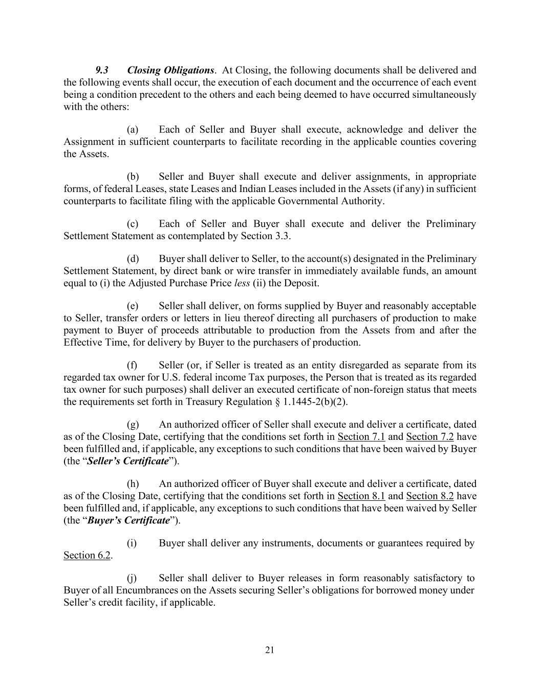 21 9.3 Closing Obligations. At Closing, the following documents shall be delivered and the following events shall occur, the execution of each document and the occurrence of each event being a condition precedent to the others and each being deemed to have occurred simultaneously with the others: (a) Each of Seller and Buyer shall execute, acknowledge and deliver the Assignment in sufficient counterparts to facilitate recording in the applicable counties covering the Assets. (b) Seller and Buyer shall execute and deliver assignments, in appropriate forms, of federal Leases, state Leases and Indian Leases included in the Assets (if any) in sufficient counterparts to facilitate filing with the applicable Governmental Authority. (c) Each of Seller and Buyer shall execute and deliver the Preliminary Settlement Statement as contemplated by Section 3.3. (d) Buyer shall deliver to Seller, to the account(s) designated in the Preliminary Settlement Statement, by direct bank or wire transfer in immediately available funds, an amount equal to (i) the Adjusted Purchase Price less (ii) the Deposit. (e) Seller shall deliver, on forms supplied by Buyer and reasonably acceptable to Seller, transfer orders or letters in lieu thereof directing all purchasers of production to make payment to Buyer of proceeds attributable to production from the Assets from and after the Effective Time, for delivery by Buyer to the purchasers of production. (f) Seller (or, if Seller is treated as an entity disregarded as separate from its regarded tax owner for U.S. federal income Tax purposes, the Person that is treated as its regarded tax owner for such purposes) shall deliver an executed certificate of non-foreign status that meets the requirements set forth in Treasury Regulation § 1.1445-2(b)(2). (g) An authorized officer of Seller shall execute and deliver a certificate, dated as of the Closing Date, certifying that the conditions set forth in Section 7.1 and Section 7.2 have been fulfilled and, if applicable, any exceptions to such conditions that have been waived by Buyer (the “Seller’s Certificate”). (h) An authorized officer of Buyer shall execute and deliver a certificate, dated as of the Closing Date, certifying that the conditions set forth in Section 8.1 and Section 8.2 have been fulfilled and, if applicable, any exceptions to such conditions that have been waived by Seller (the “Buyer’s Certificate”). (i) Buyer shall deliver any instruments, documents or guarantees required by Section 6.2. (j) Seller shall deliver to Buyer releases in form reasonably satisfactory to Buyer of all Encumbrances on the Assets securing Seller’s obligations for borrowed money under Seller’s credit facility, if applicable.