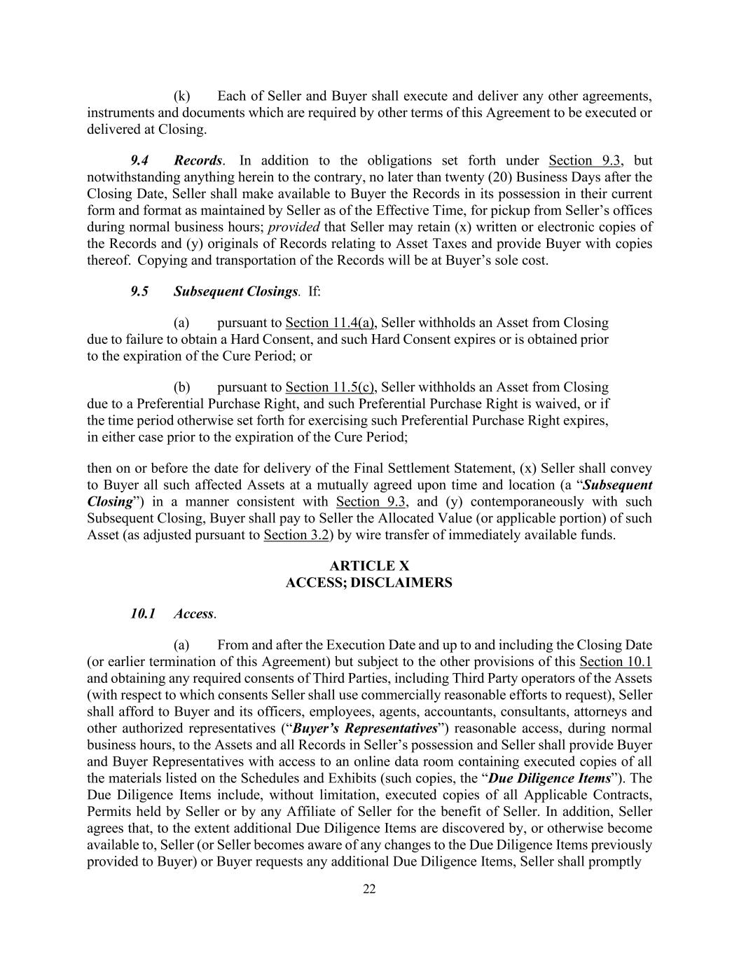 22 (k) Each of Seller and Buyer shall execute and deliver any other agreements, instruments and documents which are required by other terms of this Agreement to be executed or delivered at Closing. 9.4 Records. In addition to the obligations set forth under Section 9.3, but notwithstanding anything herein to the contrary, no later than twenty (20) Business Days after the Closing Date, Seller shall make available to Buyer the Records in its possession in their current form and format as maintained by Seller as of the Effective Time, for pickup from Seller’s offices during normal business hours; provided that Seller may retain (x) written or electronic copies of the Records and (y) originals of Records relating to Asset Taxes and provide Buyer with copies thereof. Copying and transportation of the Records will be at Buyer’s sole cost. 9.5 Subsequent Closings. If: (a) pursuant to Section 11.4(a), Seller withholds an Asset from Closing due to failure to obtain a Hard Consent, and such Hard Consent expires or is obtained prior to the expiration of the Cure Period; or (b) pursuant to Section 11.5(c), Seller withholds an Asset from Closing due to a Preferential Purchase Right, and such Preferential Purchase Right is waived, or if the time period otherwise set forth for exercising such Preferential Purchase Right expires, in either case prior to the expiration of the Cure Period; then on or before the date for delivery of the Final Settlement Statement, (x) Seller shall convey to Buyer all such affected Assets at a mutually agreed upon time and location (a “Subsequent Closing”) in a manner consistent with Section 9.3, and (y) contemporaneously with such Subsequent Closing, Buyer shall pay to Seller the Allocated Value (or applicable portion) of such Asset (as adjusted pursuant to Section 3.2) by wire transfer of immediately available funds. ARTICLE X ACCESS; DISCLAIMERS 10.1 Access. (a) From and after the Execution Date and up to and including the Closing Date (or earlier termination of this Agreement) but subject to the other provisions of this Section 10.1 and obtaining any required consents of Third Parties, including Third Party operators of the Assets (with respect to which consents Seller shall use commercially reasonable efforts to request), Seller shall afford to Buyer and its officers, employees, agents, accountants, consultants, attorneys and other authorized representatives (“Buyer’s Representatives”) reasonable access, during normal business hours, to the Assets and all Records in Seller’s possession and Seller shall provide Buyer and Buyer Representatives with access to an online data room containing executed copies of all the materials listed on the Schedules and Exhibits (such copies, the “Due Diligence Items”). The Due Diligence Items include, without limitation, executed copies of all Applicable Contracts, Permits held by Seller or by any Affiliate of Seller for the benefit of Seller. In addition, Seller agrees that, to the extent additional Due Diligence Items are discovered by, or otherwise become available to, Seller (or Seller becomes aware of any changes to the Due Diligence Items previously provided to Buyer) or Buyer requests any additional Due Diligence Items, Seller shall promptly