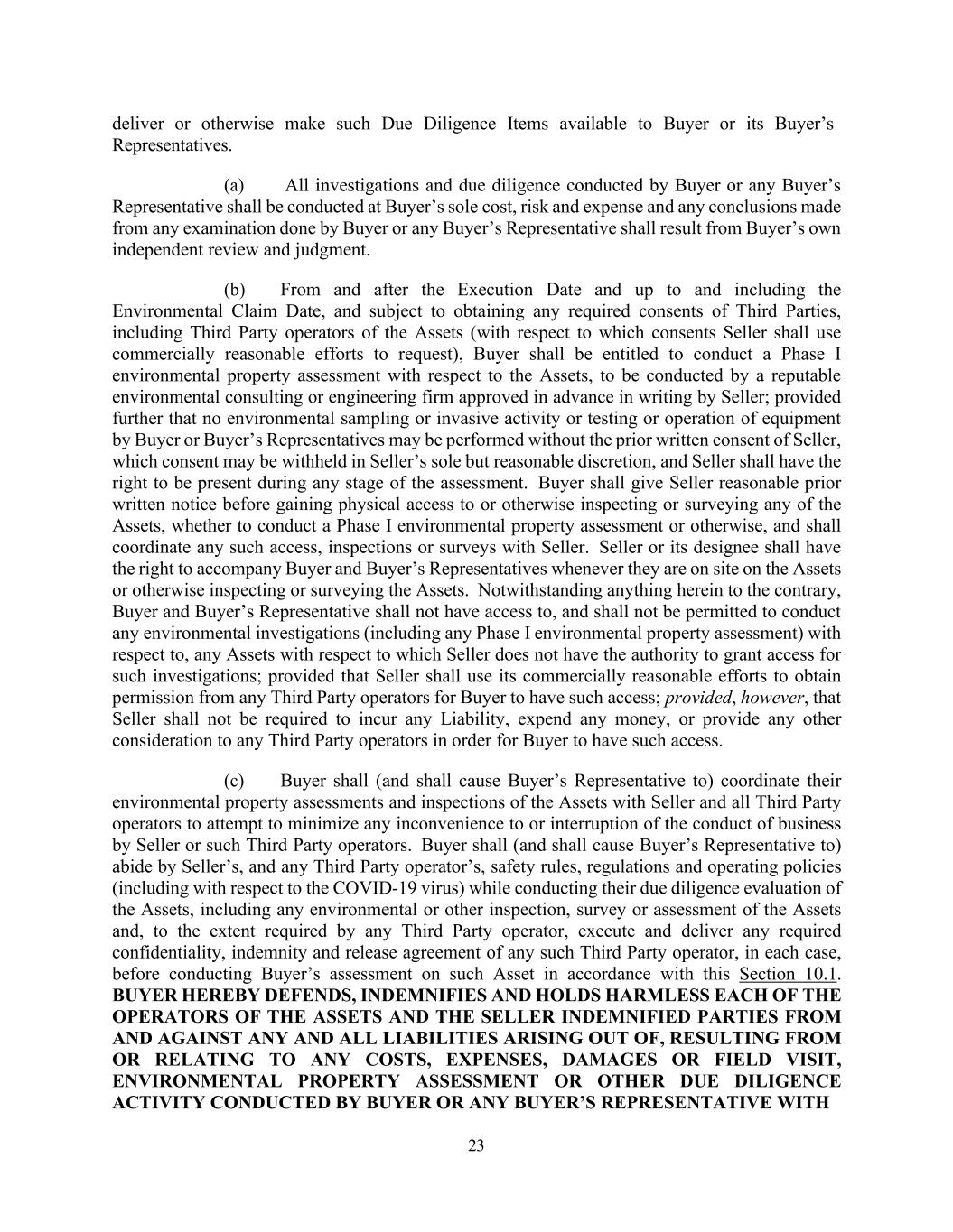 23 deliver or otherwise make such Due Diligence Items available to Buyer or its Buyer’s Representatives. (a) All investigations and due diligence conducted by Buyer or any Buyer’s Representative shall be conducted at Buyer’s sole cost, risk and expense and any conclusions made from any examination done by Buyer or any Buyer’s Representative shall result from Buyer’s own independent review and judgment. (b) From and after the Execution Date and up to and including the Environmental Claim Date, and subject to obtaining any required consents of Third Parties, including Third Party operators of the Assets (with respect to which consents Seller shall use commercially reasonable efforts to request), Buyer shall be entitled to conduct a Phase I environmental property assessment with respect to the Assets, to be conducted by a reputable environmental consulting or engineering firm approved in advance in writing by Seller; provided further that no environmental sampling or invasive activity or testing or operation of equipment by Buyer or Buyer’s Representatives may be performed without the prior written consent of Seller, which consent may be withheld in Seller’s sole but reasonable discretion, and Seller shall have the right to be present during any stage of the assessment. Buyer shall give Seller reasonable prior written notice before gaining physical access to or otherwise inspecting or surveying any of the Assets, whether to conduct a Phase I environmental property assessment or otherwise, and shall coordinate any such access, inspections or surveys with Seller. Seller or its designee shall have the right to accompany Buyer and Buyer’s Representatives whenever they are on site on the Assets or otherwise inspecting or surveying the Assets. Notwithstanding anything herein to the contrary, Buyer and Buyer’s Representative shall not have access to, and shall not be permitted to conduct any environmental investigations (including any Phase I environmental property assessment) with respect to, any Assets with respect to which Seller does not have the authority to grant access for such investigations; provided that Seller shall use its commercially reasonable efforts to obtain permission from any Third Party operators for Buyer to have such access; provided, however, that Seller shall not be required to incur any Liability, expend any money, or provide any other consideration to any Third Party operators in order for Buyer to have such access. (c) Buyer shall (and shall cause Buyer’s Representative to) coordinate their environmental property assessments and inspections of the Assets with Seller and all Third Party operators to attempt to minimize any inconvenience to or interruption of the conduct of business by Seller or such Third Party operators. Buyer shall (and shall cause Buyer’s Representative to) abide by Seller’s, and any Third Party operator’s, safety rules, regulations and operating policies (including with respect to the COVID-19 virus) while conducting their due diligence evaluation of the Assets, including any environmental or other inspection, survey or assessment of the Assets and, to the extent required by any Third Party operator, execute and deliver any required confidentiality, indemnity and release agreement of any such Third Party operator, in each case, before conducting Buyer’s assessment on such Asset in accordance with this Section 10.1. BUYER HEREBY DEFENDS, INDEMNIFIES AND HOLDS HARMLESS EACH OF THE OPERATORS OF THE ASSETS AND THE SELLER INDEMNIFIED PARTIES FROM AND AGAINST ANY AND ALL LIABILITIES ARISING OUT OF, RESULTING FROM OR RELATING TO ANY COSTS, EXPENSES, DAMAGES OR FIELD VISIT, ENVIRONMENTAL PROPERTY ASSESSMENT OR OTHER DUE DILIGENCE ACTIVITY CONDUCTED BY BUYER OR ANY BUYER’S REPRESENTATIVE WITH