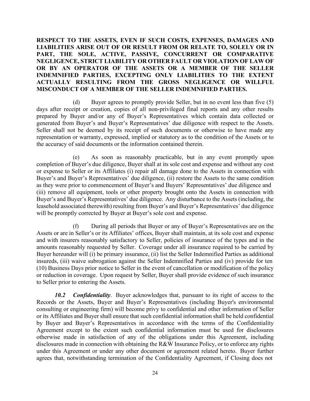 24 RESPECT TO THE ASSETS, EVEN IF SUCH COSTS, EXPENSES, DAMAGES AND LIABILITIES ARISE OUT OF OR RESULT FROM OR RELATE TO, SOLELY OR IN PART, THE SOLE, ACTIVE, PASSIVE, CONCURRENT OR COMPARATIVE NEGLIGENCE, STRICT LIABILITY OR OTHER FAULT OR VIOLATION OF LAW OF OR BY AN OPERATOR OF THE ASSETS OR A MEMBER OF THE SELLER INDEMNIFIED PARTIES, EXCEPTING ONLY LIABILITIES TO THE EXTENT ACTUALLY RESULTING FROM THE GROSS NEGLIGENCE OR WILLFUL MISCONDUCT OF A MEMBER OF THE SELLER INDEMNIFIED PARTIES. (d) Buyer agrees to promptly provide Seller, but in no event less than five (5) days after receipt or creation, copies of all non-privileged final reports and any other results prepared by Buyer and/or any of Buyer’s Representatives which contain data collected or generated from Buyer’s and Buyer’s Representatives’ due diligence with respect to the Assets. Seller shall not be deemed by its receipt of such documents or otherwise to have made any representation or warranty, expressed, implied or statutory as to the condition of the Assets or to the accuracy of said documents or the information contained therein. (e) As soon as reasonably practicable, but in any event promptly upon completion of Buyer’s due diligence, Buyer shall at its sole cost and expense and without any cost or expense to Seller or its Affiliates (i) repair all damage done to the Assets in connection with Buyer’s and Buyer’s Representatives’ due diligence, (ii) restore the Assets to the same condition as they were prior to commencement of Buyer’s and Buyers’ Representatives’ due diligence and (iii) remove all equipment, tools or other property brought onto the Assets in connection with Buyer’s and Buyer’s Representatives’ due diligence. Any disturbance to the Assets (including, the leasehold associated therewith) resulting from Buyer’s and Buyer’s Representatives’ due diligence will be promptly corrected by Buyer at Buyer’s sole cost and expense. (f) During all periods that Buyer or any of Buyer’s Representatives are on the Assets or are in Seller’s or its Affiliates’ offices, Buyer shall maintain, at its sole cost and expense and with insurers reasonably satisfactory to Seller, policies of insurance of the types and in the amounts reasonably requested by Seller. Coverage under all insurance required to be carried by Buyer hereunder will (i) be primary insurance, (ii) list the Seller Indemnified Parties as additional insureds, (iii) waive subrogation against the Seller Indemnified Parties and (iv) provide for ten (10) Business Days prior notice to Seller in the event of cancellation or modification of the policy or reduction in coverage. Upon request by Seller, Buyer shall provide evidence of such insurance to Seller prior to entering the Assets. 10.2 Confidentiality. Buyer acknowledges that, pursuant to its right of access to the Records or the Assets, Buyer and Buyer’s Representatives (including Buyer's environmental consulting or engineering firm) will become privy to confidential and other information of Seller or its Affiliates and Buyer shall ensure that such confidential information shall be held confidential by Buyer and Buyer’s Representatives in accordance with the terms of the Confidentiality Agreement except to the extent such confidential information must be used for disclosures otherwise made in satisfaction of any of the obligations under this Agreement, including disclosures made in connection with obtaining the R&W Insurance Policy, or to enforce any rights under this Agreement or under any other document or agreement related hereto. Buyer further agrees that, notwithstanding termination of the Confidentiality Agreement, if Closing does not