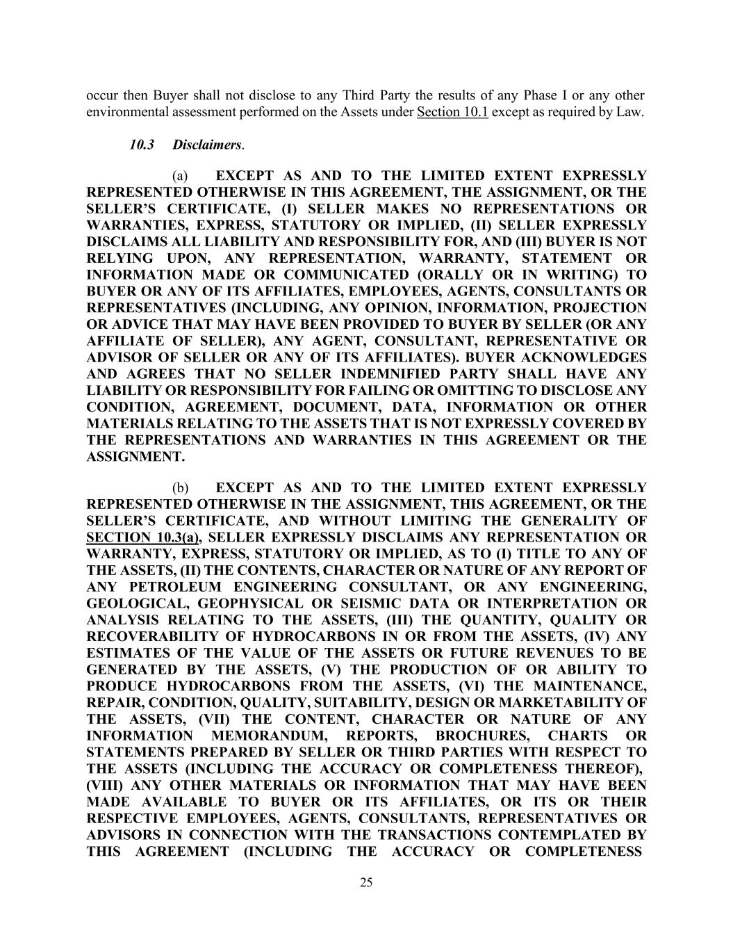 25 occur then Buyer shall not disclose to any Third Party the results of any Phase I or any other environmental assessment performed on the Assets under Section 10.1 except as required by Law. 10.3 Disclaimers. (a) EXCEPT AS AND TO THE LIMITED EXTENT EXPRESSLY REPRESENTED OTHERWISE IN THIS AGREEMENT, THE ASSIGNMENT, OR THE SELLER’S CERTIFICATE, (I) SELLER MAKES NO REPRESENTATIONS OR WARRANTIES, EXPRESS, STATUTORY OR IMPLIED, (II) SELLER EXPRESSLY DISCLAIMS ALL LIABILITY AND RESPONSIBILITY FOR, AND (III) BUYER IS NOT RELYING UPON, ANY REPRESENTATION, WARRANTY, STATEMENT OR INFORMATION MADE OR COMMUNICATED (ORALLY OR IN WRITING) TO BUYER OR ANY OF ITS AFFILIATES, EMPLOYEES, AGENTS, CONSULTANTS OR REPRESENTATIVES (INCLUDING, ANY OPINION, INFORMATION, PROJECTION OR ADVICE THAT MAY HAVE BEEN PROVIDED TO BUYER BY SELLER (OR ANY AFFILIATE OF SELLER), ANY AGENT, CONSULTANT, REPRESENTATIVE OR ADVISOR OF SELLER OR ANY OF ITS AFFILIATES). BUYER ACKNOWLEDGES AND AGREES THAT NO SELLER INDEMNIFIED PARTY SHALL HAVE ANY LIABILITY OR RESPONSIBILITY FOR FAILING OR OMITTING TO DISCLOSE ANY CONDITION, AGREEMENT, DOCUMENT, DATA, INFORMATION OR OTHER MATERIALS RELATING TO THE ASSETS THAT IS NOT EXPRESSLY COVERED BY THE REPRESENTATIONS AND WARRANTIES IN THIS AGREEMENT OR THE ASSIGNMENT. (b) EXCEPT AS AND TO THE LIMITED EXTENT EXPRESSLY REPRESENTED OTHERWISE IN THE ASSIGNMENT, THIS AGREEMENT, OR THE SELLER’S CERTIFICATE, AND WITHOUT LIMITING THE GENERALITY OF SECTION 10.3(a), SELLER EXPRESSLY DISCLAIMS ANY REPRESENTATION OR WARRANTY, EXPRESS, STATUTORY OR IMPLIED, AS TO (I) TITLE TO ANY OF THE ASSETS, (II) THE CONTENTS, CHARACTER OR NATURE OF ANY REPORT OF ANY PETROLEUM ENGINEERING CONSULTANT, OR ANY ENGINEERING, GEOLOGICAL, GEOPHYSICAL OR SEISMIC DATA OR INTERPRETATION OR ANALYSIS RELATING TO THE ASSETS, (III) THE QUANTITY, QUALITY OR RECOVERABILITY OF HYDROCARBONS IN OR FROM THE ASSETS, (IV) ANY ESTIMATES OF THE VALUE OF THE ASSETS OR FUTURE REVENUES TO BE GENERATED BY THE ASSETS, (V) THE PRODUCTION OF OR ABILITY TO PRODUCE HYDROCARBONS FROM THE ASSETS, (VI) THE MAINTENANCE, REPAIR, CONDITION, QUALITY, SUITABILITY, DESIGN OR MARKETABILITY OF THE ASSETS, (VII) THE CONTENT, CHARACTER OR NATURE OF ANY INFORMATION MEMORANDUM, REPORTS, BROCHURES, CHARTS OR STATEMENTS PREPARED BY SELLER OR THIRD PARTIES WITH RESPECT TO THE ASSETS (INCLUDING THE ACCURACY OR COMPLETENESS THEREOF), (VIII) ANY OTHER MATERIALS OR INFORMATION THAT MAY HAVE BEEN MADE AVAILABLE TO BUYER OR ITS AFFILIATES, OR ITS OR THEIR RESPECTIVE EMPLOYEES, AGENTS, CONSULTANTS, REPRESENTATIVES OR ADVISORS IN CONNECTION WITH THE TRANSACTIONS CONTEMPLATED BY THIS AGREEMENT (INCLUDING THE ACCURACY OR COMPLETENESS