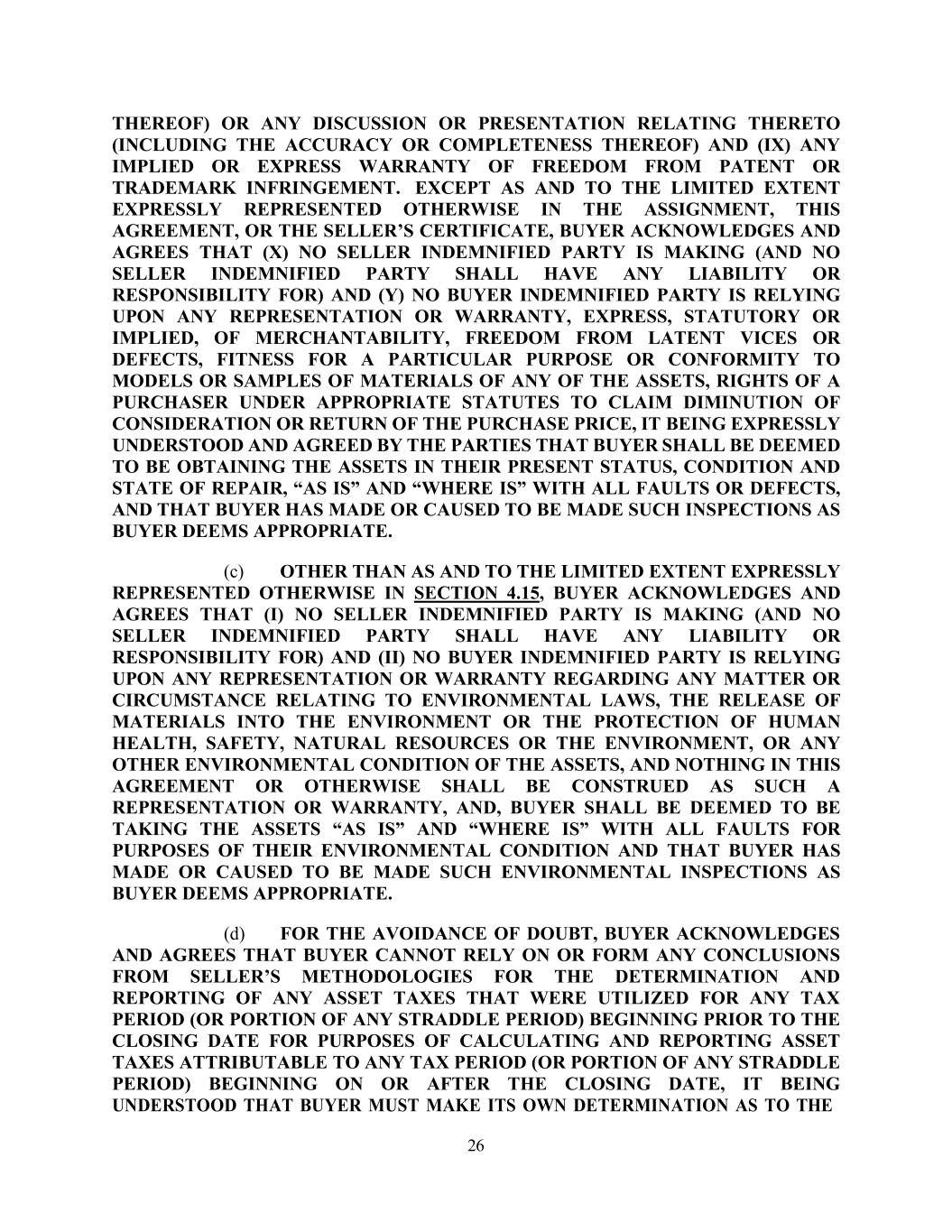 26 THEREOF) OR ANY DISCUSSION OR PRESENTATION RELATING THERETO (INCLUDING THE ACCURACY OR COMPLETENESS THEREOF) AND (IX) ANY IMPLIED OR EXPRESS WARRANTY OF FREEDOM FROM PATENT OR TRADEMARK INFRINGEMENT. EXCEPT AS AND TO THE LIMITED EXTENT EXPRESSLY REPRESENTED OTHERWISE IN THE ASSIGNMENT, THIS AGREEMENT, OR THE SELLER’S CERTIFICATE, BUYER ACKNOWLEDGES AND AGREES THAT (X) NO SELLER INDEMNIFIED PARTY IS MAKING (AND NO SELLER INDEMNIFIED PARTY SHALL HAVE ANY LIABILITY OR RESPONSIBILITY FOR) AND (Y) NO BUYER INDEMNIFIED PARTY IS RELYING UPON ANY REPRESENTATION OR WARRANTY, EXPRESS, STATUTORY OR IMPLIED, OF MERCHANTABILITY, FREEDOM FROM LATENT VICES OR DEFECTS, FITNESS FOR A PARTICULAR PURPOSE OR CONFORMITY TO MODELS OR SAMPLES OF MATERIALS OF ANY OF THE ASSETS, RIGHTS OF A PURCHASER UNDER APPROPRIATE STATUTES TO CLAIM DIMINUTION OF CONSIDERATION OR RETURN OF THE PURCHASE PRICE, IT BEING EXPRESSLY UNDERSTOOD AND AGREED BY THE PARTIES THAT BUYER SHALL BE DEEMED TO BE OBTAINING THE ASSETS IN THEIR PRESENT STATUS, CONDITION AND STATE OF REPAIR, “AS IS” AND “WHERE IS” WITH ALL FAULTS OR DEFECTS, AND THAT BUYER HAS MADE OR CAUSED TO BE MADE SUCH INSPECTIONS AS BUYER DEEMS APPROPRIATE. (c) OTHER THAN AS AND TO THE LIMITED EXTENT EXPRESSLY REPRESENTED OTHERWISE IN SECTION 4.15, BUYER ACKNOWLEDGES AND AGREES THAT (I) NO SELLER INDEMNIFIED PARTY IS MAKING (AND NO SELLER INDEMNIFIED PARTY SHALL HAVE ANY LIABILITY OR RESPONSIBILITY FOR) AND (II) NO BUYER INDEMNIFIED PARTY IS RELYING UPON ANY REPRESENTATION OR WARRANTY REGARDING ANY MATTER OR CIRCUMSTANCE RELATING TO ENVIRONMENTAL LAWS, THE RELEASE OF MATERIALS INTO THE ENVIRONMENT OR THE PROTECTION OF HUMAN HEALTH, SAFETY, NATURAL RESOURCES OR THE ENVIRONMENT, OR ANY OTHER ENVIRONMENTAL CONDITION OF THE ASSETS, AND NOTHING IN THIS AGREEMENT OR OTHERWISE SHALL BE CONSTRUED AS SUCH A REPRESENTATION OR WARRANTY, AND, BUYER SHALL BE DEEMED TO BE TAKING THE ASSETS “AS IS” AND “WHERE IS” WITH ALL FAULTS FOR PURPOSES OF THEIR ENVIRONMENTAL CONDITION AND THAT BUYER HAS MADE OR CAUSED TO BE MADE SUCH ENVIRONMENTAL INSPECTIONS AS BUYER DEEMS APPROPRIATE. (d) FOR THE AVOIDANCE OF DOUBT, BUYER ACKNOWLEDGES AND AGREES THAT BUYER CANNOT RELY ON OR FORM ANY CONCLUSIONS FROM SELLER’S METHODOLOGIES FOR THE DETERMINATION AND REPORTING OF ANY ASSET TAXES THAT WERE UTILIZED FOR ANY TAX PERIOD (OR PORTION OF ANY STRADDLE PERIOD) BEGINNING PRIOR TO THE CLOSING DATE FOR PURPOSES OF CALCULATING AND REPORTING ASSET TAXES ATTRIBUTABLE TO ANY TAX PERIOD (OR PORTION OF ANY STRADDLE PERIOD) BEGINNING ON OR AFTER THE CLOSING DATE, IT BEING UNDERSTOOD THAT BUYER MUST MAKE ITS OWN DETERMINATION AS TO THE