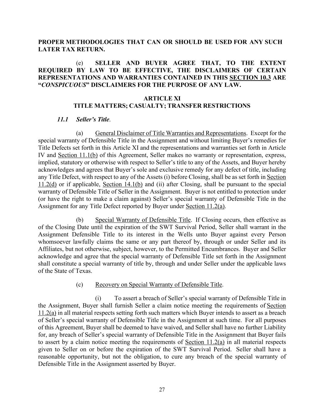 27 PROPER METHODOLOGIES THAT CAN OR SHOULD BE USED FOR ANY SUCH LATER TAX RETURN. (e) SELLER AND BUYER AGREE THAT, TO THE EXTENT REQUIRED BY LAW TO BE EFFECTIVE, THE DISCLAIMERS OF CERTAIN REPRESENTATIONS AND WARRANTIES CONTAINED IN THIS SECTION 10.3 ARE “CONSPICUOUS” DISCLAIMERS FOR THE PURPOSE OF ANY LAW. ARTICLE XI TITLE MATTERS; CASUALTY; TRANSFER RESTRICTIONS 11.1 Seller’s Title. (a) General Disclaimer of Title Warranties and Representations. Except for the special warranty of Defensible Title in the Assignment and without limiting Buyer’s remedies for Title Defects set forth in this Article XI and the representations and warranties set forth in Article IV and Section 11.1(b) of this Agreement, Seller makes no warranty or representation, express, implied, statutory or otherwise with respect to Seller’s title to any of the Assets, and Buyer hereby acknowledges and agrees that Buyer’s sole and exclusive remedy for any defect of title, including any Title Defect, with respect to any of the Assets (i) before Closing, shall be as set forth in Section 11.2(d) or if applicable, Section 14.1(b) and (ii) after Closing, shall be pursuant to the special warranty of Defensible Title of Seller in the Assignment. Buyer is not entitled to protection under (or have the right to make a claim against) Seller’s special warranty of Defensible Title in the Assignment for any Title Defect reported by Buyer under Section 11.2(a). (b) Special Warranty of Defensible Title. If Closing occurs, then effective as of the Closing Date until the expiration of the SWT Survival Period, Seller shall warrant in the Assignment Defensible Title to its interest in the Wells unto Buyer against every Person whomsoever lawfully claims the same or any part thereof by, through or under Seller and its Affiliates, but not otherwise, subject, however, to the Permitted Encumbrances. Buyer and Seller acknowledge and agree that the special warranty of Defensible Title set forth in the Assignment shall constitute a special warranty of title by, through and under Seller under the applicable laws of the State of Texas. (c) Recovery on Special Warranty of Defensible Title. (i) To assert a breach of Seller’s special warranty of Defensible Title in the Assignment, Buyer shall furnish Seller a claim notice meeting the requirements of Section 11.2(a) in all material respects setting forth such matters which Buyer intends to assert as a breach of Seller’s special warranty of Defensible Title in the Assignment at such time. For all purposes of this Agreement, Buyer shall be deemed to have waived, and Seller shall have no further Liability for, any breach of Seller’s special warranty of Defensible Title in the Assignment that Buyer fails to assert by a claim notice meeting the requirements of Section 11.2(a) in all material respects given to Seller on or before the expiration of the SWT Survival Period. Seller shall have a reasonable opportunity, but not the obligation, to cure any breach of the special warranty of Defensible Title in the Assignment asserted by Buyer.