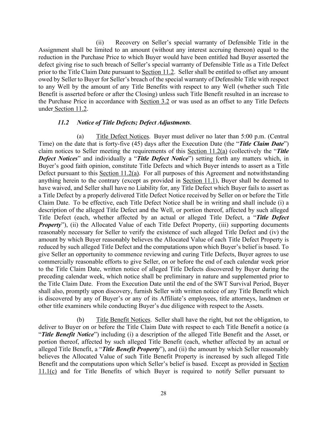 28 (ii) Recovery on Seller’s special warranty of Defensible Title in the Assignment shall be limited to an amount (without any interest accruing thereon) equal to the reduction in the Purchase Price to which Buyer would have been entitled had Buyer asserted the defect giving rise to such breach of Seller’s special warranty of Defensible Title as a Title Defect prior to the Title Claim Date pursuant to Section 11.2. Seller shall be entitled to offset any amount owed by Seller to Buyer for Seller’s breach of the special warranty of Defensible Title with respect to any Well by the amount of any Title Benefits with respect to any Well (whether such Title Benefit is asserted before or after the Closing) unless such Title Benefit resulted in an increase to the Purchase Price in accordance with Section 3.2 or was used as an offset to any Title Defects under Section 11.2. 11.2 Notice of Title Defects; Defect Adjustments. (a) Title Defect Notices. Buyer must deliver no later than 5:00 p.m. (Central Time) on the date that is forty-five (45) days after the Execution Date (the “Title Claim Date”) claim notices to Seller meeting the requirements of this Section 11.2(a) (collectively the “Title Defect Notices” and individually a “Title Defect Notice”) setting forth any matters which, in Buyer’s good faith opinion, constitute Title Defects and which Buyer intends to assert as a Title Defect pursuant to this Section 11.2(a). For all purposes of this Agreement and notwithstanding anything herein to the contrary (except as provided in Section 11.1), Buyer shall be deemed to have waived, and Seller shall have no Liability for, any Title Defect which Buyer fails to assert as a Title Defect by a properly delivered Title Defect Notice received by Seller on or before the Title Claim Date. To be effective, each Title Defect Notice shall be in writing and shall include (i) a description of the alleged Title Defect and the Well, or portion thereof, affected by such alleged Title Defect (each, whether affected by an actual or alleged Title Defect, a “Title Defect Property”), (ii) the Allocated Value of each Title Defect Property, (iii) supporting documents reasonably necessary for Seller to verify the existence of such alleged Title Defect and (iv) the amount by which Buyer reasonably believes the Allocated Value of each Title Defect Property is reduced by such alleged Title Defect and the computations upon which Buyer’s belief is based. To give Seller an opportunity to commence reviewing and curing Title Defects, Buyer agrees to use commercially reasonable efforts to give Seller, on or before the end of each calendar week prior to the Title Claim Date, written notice of alleged Title Defects discovered by Buyer during the preceding calendar week, which notice shall be preliminary in nature and supplemented prior to the Title Claim Date. From the Execution Date until the end of the SWT Survival Period, Buyer shall also, promptly upon discovery, furnish Seller with written notice of any Title Benefit which is discovered by any of Buyer’s or any of its Affiliate’s employees, title attorneys, landmen or other title examiners while conducting Buyer’s due diligence with respect to the Assets. (b) Title Benefit Notices. Seller shall have the right, but not the obligation, to deliver to Buyer on or before the Title Claim Date with respect to each Title Benefit a notice (a “Title Benefit Notice”) including (i) a description of the alleged Title Benefit and the Asset, or portion thereof, affected by such alleged Title Benefit (each, whether affected by an actual or alleged Title Benefit, a “Title Benefit Property”), and (ii) the amount by which Seller reasonably believes the Allocated Value of such Title Benefit Property is increased by such alleged Title Benefit and the computations upon which Seller’s belief is based. Except as provided in Section 11.1(c) and for Title Benefits of which Buyer is required to notify Seller pursuant to
