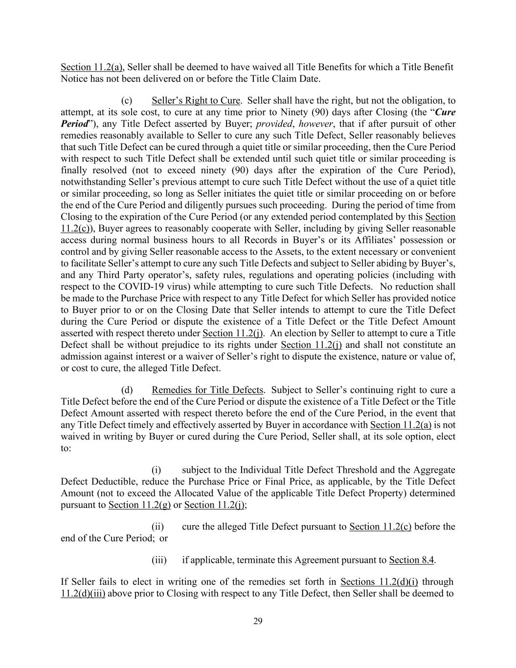 29 Section 11.2(a), Seller shall be deemed to have waived all Title Benefits for which a Title Benefit Notice has not been delivered on or before the Title Claim Date. (c) Seller’s Right to Cure. Seller shall have the right, but not the obligation, to attempt, at its sole cost, to cure at any time prior to Ninety (90) days after Closing (the “Cure Period”), any Title Defect asserted by Buyer; provided, however, that if after pursuit of other remedies reasonably available to Seller to cure any such Title Defect, Seller reasonably believes that such Title Defect can be cured through a quiet title or similar proceeding, then the Cure Period with respect to such Title Defect shall be extended until such quiet title or similar proceeding is finally resolved (not to exceed ninety (90) days after the expiration of the Cure Period), notwithstanding Seller’s previous attempt to cure such Title Defect without the use of a quiet title or similar proceeding, so long as Seller initiates the quiet title or similar proceeding on or before the end of the Cure Period and diligently pursues such proceeding. During the period of time from Closing to the expiration of the Cure Period (or any extended period contemplated by this Section 11.2(c)), Buyer agrees to reasonably cooperate with Seller, including by giving Seller reasonable access during normal business hours to all Records in Buyer’s or its Affiliates’ possession or control and by giving Seller reasonable access to the Assets, to the extent necessary or convenient to facilitate Seller’s attempt to cure any such Title Defects and subject to Seller abiding by Buyer’s, and any Third Party operator’s, safety rules, regulations and operating policies (including with respect to the COVID-19 virus) while attempting to cure such Title Defects. No reduction shall be made to the Purchase Price with respect to any Title Defect for which Seller has provided notice to Buyer prior to or on the Closing Date that Seller intends to attempt to cure the Title Defect during the Cure Period or dispute the existence of a Title Defect or the Title Defect Amount asserted with respect thereto under Section 11.2(j). An election by Seller to attempt to cure a Title Defect shall be without prejudice to its rights under Section 11.2(j) and shall not constitute an admission against interest or a waiver of Seller’s right to dispute the existence, nature or value of, or cost to cure, the alleged Title Defect. (d) Remedies for Title Defects. Subject to Seller’s continuing right to cure a Title Defect before the end of the Cure Period or dispute the existence of a Title Defect or the Title Defect Amount asserted with respect thereto before the end of the Cure Period, in the event that any Title Defect timely and effectively asserted by Buyer in accordance with Section 11.2(a) is not waived in writing by Buyer or cured during the Cure Period, Seller shall, at its sole option, elect to: (i) subject to the Individual Title Defect Threshold and the Aggregate Defect Deductible, reduce the Purchase Price or Final Price, as applicable, by the Title Defect Amount (not to exceed the Allocated Value of the applicable Title Defect Property) determined pursuant to Section 11.2(g) or Section 11.2(j); (ii) cure the alleged Title Defect pursuant to Section 11.2(c) before the end of the Cure Period; or (iii) if applicable, terminate this Agreement pursuant to Section 8.4. If Seller fails to elect in writing one of the remedies set forth in Sections 11.2(d)(i) through 11.2(d)(iii) above prior to Closing with respect to any Title Defect, then Seller shall be deemed to