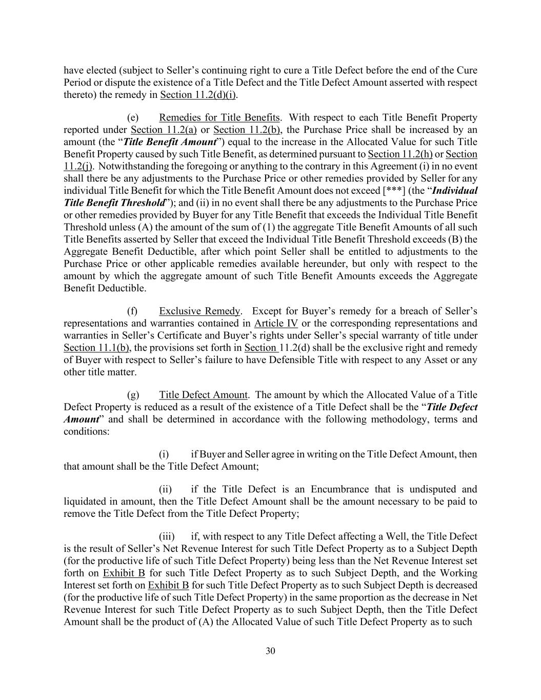 30 have elected (subject to Seller’s continuing right to cure a Title Defect before the end of the Cure Period or dispute the existence of a Title Defect and the Title Defect Amount asserted with respect thereto) the remedy in Section 11.2(d)(i). (e) Remedies for Title Benefits. With respect to each Title Benefit Property reported under Section 11.2(a) or Section 11.2(b), the Purchase Price shall be increased by an amount (the “Title Benefit Amount”) equal to the increase in the Allocated Value for such Title Benefit Property caused by such Title Benefit, as determined pursuant to Section 11.2(h) or Section 11.2(j). Notwithstanding the foregoing or anything to the contrary in this Agreement (i) in no event shall there be any adjustments to the Purchase Price or other remedies provided by Seller for any individual Title Benefit for which the Title Benefit Amount does not exceed [***] (the “Individual Title Benefit Threshold”); and (ii) in no event shall there be any adjustments to the Purchase Price or other remedies provided by Buyer for any Title Benefit that exceeds the Individual Title Benefit Threshold unless (A) the amount of the sum of (1) the aggregate Title Benefit Amounts of all such Title Benefits asserted by Seller that exceed the Individual Title Benefit Threshold exceeds (B) the Aggregate Benefit Deductible, after which point Seller shall be entitled to adjustments to the Purchase Price or other applicable remedies available hereunder, but only with respect to the amount by which the aggregate amount of such Title Benefit Amounts exceeds the Aggregate Benefit Deductible. (f) Exclusive Remedy. Except for Buyer’s remedy for a breach of Seller’s representations and warranties contained in Article IV or the corresponding representations and warranties in Seller’s Certificate and Buyer’s rights under Seller’s special warranty of title under Section 11.1(b), the provisions set forth in Section 11.2(d) shall be the exclusive right and remedy of Buyer with respect to Seller’s failure to have Defensible Title with respect to any Asset or any other title matter. (g) Title Defect Amount. The amount by which the Allocated Value of a Title Defect Property is reduced as a result of the existence of a Title Defect shall be the “Title Defect Amount” and shall be determined in accordance with the following methodology, terms and conditions: (i) if Buyer and Seller agree in writing on the Title Defect Amount, then that amount shall be the Title Defect Amount; (ii) if the Title Defect is an Encumbrance that is undisputed and liquidated in amount, then the Title Defect Amount shall be the amount necessary to be paid to remove the Title Defect from the Title Defect Property; (iii) if, with respect to any Title Defect affecting a Well, the Title Defect is the result of Seller’s Net Revenue Interest for such Title Defect Property as to a Subject Depth (for the productive life of such Title Defect Property) being less than the Net Revenue Interest set forth on Exhibit B for such Title Defect Property as to such Subject Depth, and the Working Interest set forth on Exhibit B for such Title Defect Property as to such Subject Depth is decreased (for the productive life of such Title Defect Property) in the same proportion as the decrease in Net Revenue Interest for such Title Defect Property as to such Subject Depth, then the Title Defect Amount shall be the product of (A) the Allocated Value of such Title Defect Property as to such
