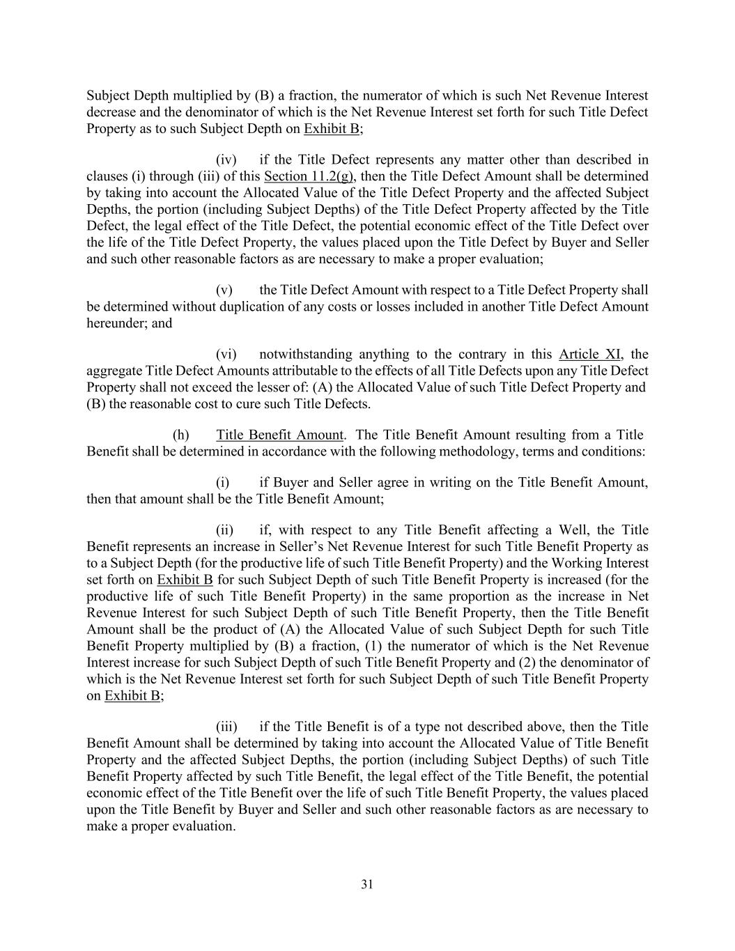 31 Subject Depth multiplied by (B) a fraction, the numerator of which is such Net Revenue Interest decrease and the denominator of which is the Net Revenue Interest set forth for such Title Defect Property as to such Subject Depth on Exhibit B; (iv) if the Title Defect represents any matter other than described in clauses (i) through (iii) of this Section 11.2(g), then the Title Defect Amount shall be determined by taking into account the Allocated Value of the Title Defect Property and the affected Subject Depths, the portion (including Subject Depths) of the Title Defect Property affected by the Title Defect, the legal effect of the Title Defect, the potential economic effect of the Title Defect over the life of the Title Defect Property, the values placed upon the Title Defect by Buyer and Seller and such other reasonable factors as are necessary to make a proper evaluation; (v) the Title Defect Amount with respect to a Title Defect Property shall be determined without duplication of any costs or losses included in another Title Defect Amount hereunder; and (vi) notwithstanding anything to the contrary in this Article XI, the aggregate Title Defect Amounts attributable to the effects of all Title Defects upon any Title Defect Property shall not exceed the lesser of: (A) the Allocated Value of such Title Defect Property and (B) the reasonable cost to cure such Title Defects. (h) Title Benefit Amount. The Title Benefit Amount resulting from a Title Benefit shall be determined in accordance with the following methodology, terms and conditions: (i) if Buyer and Seller agree in writing on the Title Benefit Amount, then that amount shall be the Title Benefit Amount; (ii) if, with respect to any Title Benefit affecting a Well, the Title Benefit represents an increase in Seller’s Net Revenue Interest for such Title Benefit Property as to a Subject Depth (for the productive life of such Title Benefit Property) and the Working Interest set forth on Exhibit B for such Subject Depth of such Title Benefit Property is increased (for the productive life of such Title Benefit Property) in the same proportion as the increase in Net Revenue Interest for such Subject Depth of such Title Benefit Property, then the Title Benefit Amount shall be the product of (A) the Allocated Value of such Subject Depth for such Title Benefit Property multiplied by (B) a fraction, (1) the numerator of which is the Net Revenue Interest increase for such Subject Depth of such Title Benefit Property and (2) the denominator of which is the Net Revenue Interest set forth for such Subject Depth of such Title Benefit Property on Exhibit B; (iii) if the Title Benefit is of a type not described above, then the Title Benefit Amount shall be determined by taking into account the Allocated Value of Title Benefit Property and the affected Subject Depths, the portion (including Subject Depths) of such Title Benefit Property affected by such Title Benefit, the legal effect of the Title Benefit, the potential economic effect of the Title Benefit over the life of such Title Benefit Property, the values placed upon the Title Benefit by Buyer and Seller and such other reasonable factors as are necessary to make a proper evaluation.