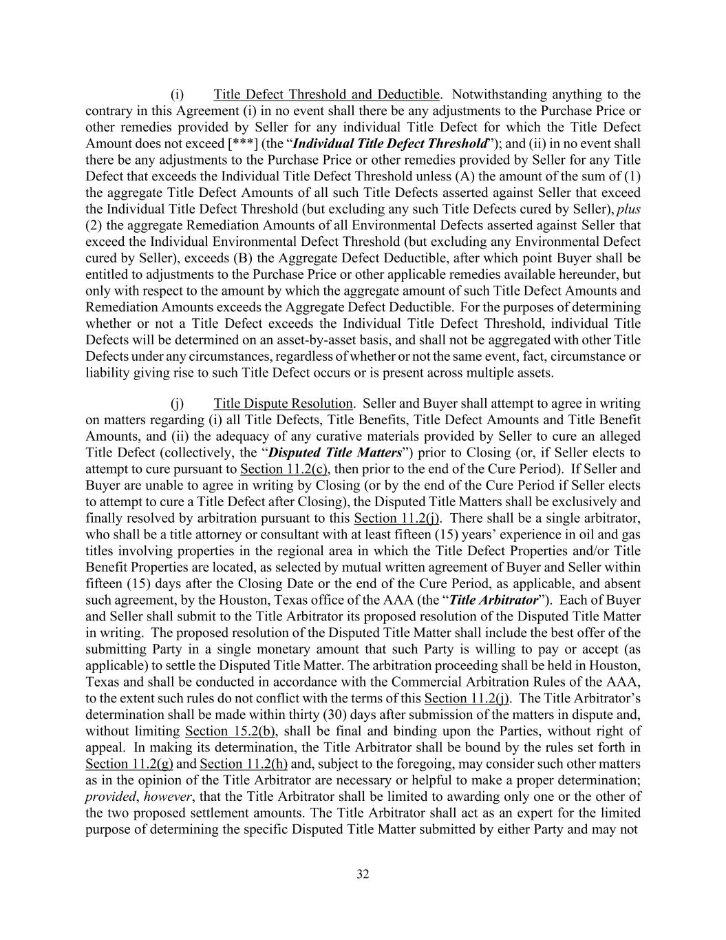32 (i) Title Defect Threshold and Deductible. Notwithstanding anything to the contrary in this Agreement (i) in no event shall there be any adjustments to the Purchase Price or other remedies provided by Seller for any individual Title Defect for which the Title Defect Amount does not exceed [***] (the “Individual Title Defect Threshold”); and (ii) in no event shall there be any adjustments to the Purchase Price or other remedies provided by Seller for any Title Defect that exceeds the Individual Title Defect Threshold unless (A) the amount of the sum of (1) the aggregate Title Defect Amounts of all such Title Defects asserted against Seller that exceed the Individual Title Defect Threshold (but excluding any such Title Defects cured by Seller), plus (2) the aggregate Remediation Amounts of all Environmental Defects asserted against Seller that exceed the Individual Environmental Defect Threshold (but excluding any Environmental Defect cured by Seller), exceeds (B) the Aggregate Defect Deductible, after which point Buyer shall be entitled to adjustments to the Purchase Price or other applicable remedies available hereunder, but only with respect to the amount by which the aggregate amount of such Title Defect Amounts and Remediation Amounts exceeds the Aggregate Defect Deductible. For the purposes of determining whether or not a Title Defect exceeds the Individual Title Defect Threshold, individual Title Defects will be determined on an asset-by-asset basis, and shall not be aggregated with other Title Defects under any circumstances, regardless of whether or not the same event, fact, circumstance or liability giving rise to such Title Defect occurs or is present across multiple assets. (j) Title Dispute Resolution. Seller and Buyer shall attempt to agree in writing on matters regarding (i) all Title Defects, Title Benefits, Title Defect Amounts and Title Benefit Amounts, and (ii) the adequacy of any curative materials provided by Seller to cure an alleged Title Defect (collectively, the “Disputed Title Matters”) prior to Closing (or, if Seller elects to attempt to cure pursuant to Section 11.2(c), then prior to the end of the Cure Period). If Seller and Buyer are unable to agree in writing by Closing (or by the end of the Cure Period if Seller elects to attempt to cure a Title Defect after Closing), the Disputed Title Matters shall be exclusively and finally resolved by arbitration pursuant to this Section 11.2(j). There shall be a single arbitrator, who shall be a title attorney or consultant with at least fifteen (15) years’ experience in oil and gas titles involving properties in the regional area in which the Title Defect Properties and/or Title Benefit Properties are located, as selected by mutual written agreement of Buyer and Seller within fifteen (15) days after the Closing Date or the end of the Cure Period, as applicable, and absent such agreement, by the Houston, Texas office of the AAA (the “Title Arbitrator”). Each of Buyer and Seller shall submit to the Title Arbitrator its proposed resolution of the Disputed Title Matter in writing. The proposed resolution of the Disputed Title Matter shall include the best offer of the submitting Party in a single monetary amount that such Party is willing to pay or accept (as applicable) to settle the Disputed Title Matter. The arbitration proceeding shall be held in Houston, Texas and shall be conducted in accordance with the Commercial Arbitration Rules of the AAA, to the extent such rules do not conflict with the terms of this Section 11.2(j). The Title Arbitrator’s determination shall be made within thirty (30) days after submission of the matters in dispute and, without limiting Section 15.2(b), shall be final and binding upon the Parties, without right of appeal. In making its determination, the Title Arbitrator shall be bound by the rules set forth in Section 11.2(g) and Section 11.2(h) and, subject to the foregoing, may consider such other matters as in the opinion of the Title Arbitrator are necessary or helpful to make a proper determination; provided, however, that the Title Arbitrator shall be limited to awarding only one or the other of the two proposed settlement amounts. The Title Arbitrator shall act as an expert for the limited purpose of determining the specific Disputed Title Matter submitted by either Party and may not