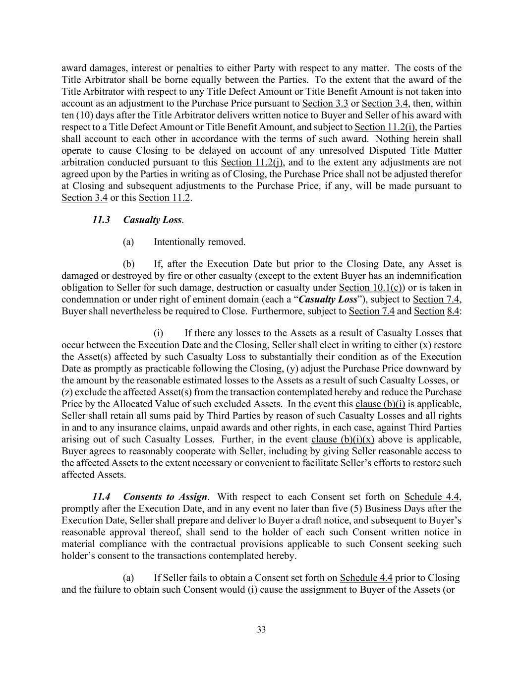 33 award damages, interest or penalties to either Party with respect to any matter. The costs of the Title Arbitrator shall be borne equally between the Parties. To the extent that the award of the Title Arbitrator with respect to any Title Defect Amount or Title Benefit Amount is not taken into account as an adjustment to the Purchase Price pursuant to Section 3.3 or Section 3.4, then, within ten (10) days after the Title Arbitrator delivers written notice to Buyer and Seller of his award with respect to a Title Defect Amount or Title Benefit Amount, and subject to Section 11.2(i), the Parties shall account to each other in accordance with the terms of such award. Nothing herein shall operate to cause Closing to be delayed on account of any unresolved Disputed Title Matter arbitration conducted pursuant to this Section 11.2(j), and to the extent any adjustments are not agreed upon by the Parties in writing as of Closing, the Purchase Price shall not be adjusted therefor at Closing and subsequent adjustments to the Purchase Price, if any, will be made pursuant to Section 3.4 or this Section 11.2. 11.3 Casualty Loss. (a) Intentionally removed. (b) If, after the Execution Date but prior to the Closing Date, any Asset is damaged or destroyed by fire or other casualty (except to the extent Buyer has an indemnification obligation to Seller for such damage, destruction or casualty under Section 10.1(c)) or is taken in condemnation or under right of eminent domain (each a “Casualty Loss”), subject to Section 7.4, Buyer shall nevertheless be required to Close. Furthermore, subject to Section 7.4 and Section 8.4: (i) If there any losses to the Assets as a result of Casualty Losses that occur between the Execution Date and the Closing, Seller shall elect in writing to either (x) restore the Asset(s) affected by such Casualty Loss to substantially their condition as of the Execution Date as promptly as practicable following the Closing, (y) adjust the Purchase Price downward by the amount by the reasonable estimated losses to the Assets as a result of such Casualty Losses, or (z) exclude the affected Asset(s) from the transaction contemplated hereby and reduce the Purchase Price by the Allocated Value of such excluded Assets. In the event this clause (b)(i) is applicable, Seller shall retain all sums paid by Third Parties by reason of such Casualty Losses and all rights in and to any insurance claims, unpaid awards and other rights, in each case, against Third Parties arising out of such Casualty Losses. Further, in the event clause (b)(i)(x) above is applicable, Buyer agrees to reasonably cooperate with Seller, including by giving Seller reasonable access to the affected Assets to the extent necessary or convenient to facilitate Seller’s efforts to restore such affected Assets. 11.4 Consents to Assign. With respect to each Consent set forth on Schedule 4.4, promptly after the Execution Date, and in any event no later than five (5) Business Days after the Execution Date, Seller shall prepare and deliver to Buyer a draft notice, and subsequent to Buyer’s reasonable approval thereof, shall send to the holder of each such Consent written notice in material compliance with the contractual provisions applicable to such Consent seeking such holder’s consent to the transactions contemplated hereby. (a) If Seller fails to obtain a Consent set forth on Schedule 4.4 prior to Closing and the failure to obtain such Consent would (i) cause the assignment to Buyer of the Assets (or