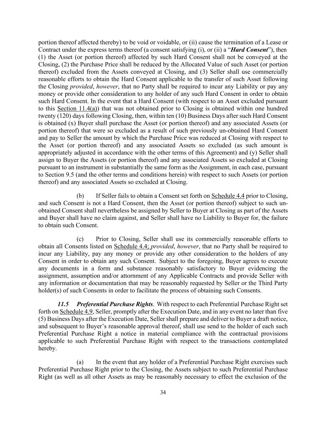 34 portion thereof affected thereby) to be void or voidable, or (ii) cause the termination of a Lease or Contract under the express terms thereof (a consent satisfying (i), or (ii) a “Hard Consent”), then (1) the Asset (or portion thereof) affected by such Hard Consent shall not be conveyed at the Closing, (2) the Purchase Price shall be reduced by the Allocated Value of such Asset (or portion thereof) excluded from the Assets conveyed at Closing, and (3) Seller shall use commercially reasonable efforts to obtain the Hard Consent applicable to the transfer of such Asset following the Closing provided, however, that no Party shall be required to incur any Liability or pay any money or provide other consideration to any holder of any such Hard Consent in order to obtain such Hard Consent. In the event that a Hard Consent (with respect to an Asset excluded pursuant to this Section 11.4(a)) that was not obtained prior to Closing is obtained within one hundred twenty (120) days following Closing, then, within ten (10) Business Days after such Hard Consent is obtained (x) Buyer shall purchase the Asset (or portion thereof) and any associated Assets (or portion thereof) that were so excluded as a result of such previously un-obtained Hard Consent and pay to Seller the amount by which the Purchase Price was reduced at Closing with respect to the Asset (or portion thereof) and any associated Assets so excluded (as such amount is appropriately adjusted in accordance with the other terms of this Agreement) and (y) Seller shall assign to Buyer the Assets (or portion thereof) and any associated Assets so excluded at Closing pursuant to an instrument in substantially the same form as the Assignment, in each case, pursuant to Section 9.5 (and the other terms and conditions herein) with respect to such Assets (or portion thereof) and any associated Assets so excluded at Closing. (b) If Seller fails to obtain a Consent set forth on Schedule 4.4 prior to Closing, and such Consent is not a Hard Consent, then the Asset (or portion thereof) subject to such un- obtained Consent shall nevertheless be assigned by Seller to Buyer at Closing as part of the Assets and Buyer shall have no claim against, and Seller shall have no Liability to Buyer for, the failure to obtain such Consent. (c) Prior to Closing, Seller shall use its commercially reasonable efforts to obtain all Consents listed on Schedule 4.4; provided, however, that no Party shall be required to incur any Liability, pay any money or provide any other consideration to the holders of any Consent in order to obtain any such Consent. Subject to the foregoing, Buyer agrees to execute any documents in a form and substance reasonably satisfactory to Buyer evidencing the assignment, assumption and/or attornment of any Applicable Contracts and provide Seller with any information or documentation that may be reasonably requested by Seller or the Third Party holder(s) of such Consents in order to facilitate the process of obtaining such Consents. 11.5 Preferential Purchase Rights. With respect to each Preferential Purchase Right set forth on Schedule 4.9, Seller, promptly after the Execution Date, and in any event no later than five (5) Business Days after the Execution Date, Seller shall prepare and deliver to Buyer a draft notice, and subsequent to Buyer’s reasonable approval thereof, shall use send to the holder of each such Preferential Purchase Right a notice in material compliance with the contractual provisions applicable to such Preferential Purchase Right with respect to the transactions contemplated hereby. (a) In the event that any holder of a Preferential Purchase Right exercises such Preferential Purchase Right prior to the Closing, the Assets subject to such Preferential Purchase Right (as well as all other Assets as may be reasonably necessary to effect the exclusion of the