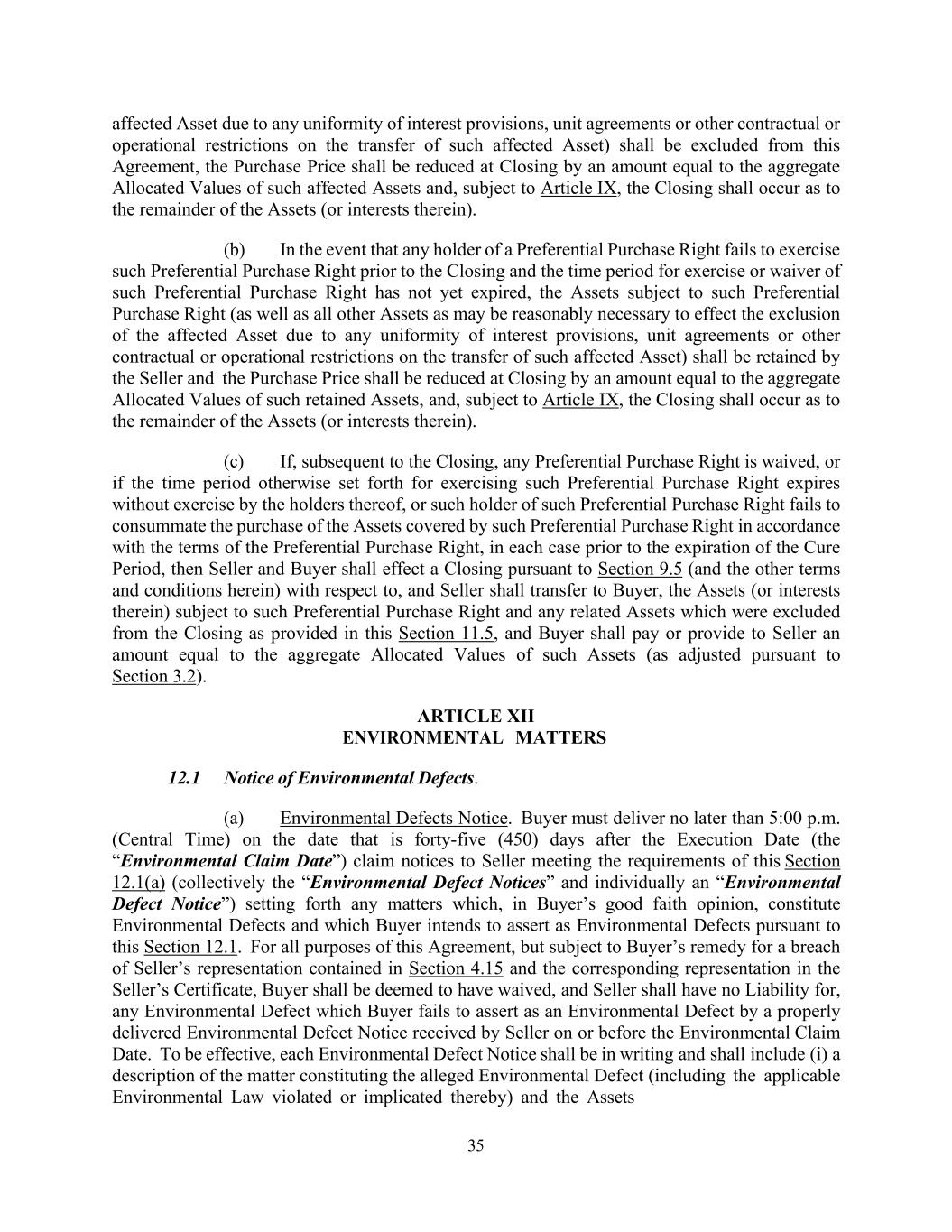 35 affected Asset due to any uniformity of interest provisions, unit agreements or other contractual or operational restrictions on the transfer of such affected Asset) shall be excluded from this Agreement, the Purchase Price shall be reduced at Closing by an amount equal to the aggregate Allocated Values of such affected Assets and, subject to Article IX, the Closing shall occur as to the remainder of the Assets (or interests therein). (b) In the event that any holder of a Preferential Purchase Right fails to exercise such Preferential Purchase Right prior to the Closing and the time period for exercise or waiver of such Preferential Purchase Right has not yet expired, the Assets subject to such Preferential Purchase Right (as well as all other Assets as may be reasonably necessary to effect the exclusion of the affected Asset due to any uniformity of interest provisions, unit agreements or other contractual or operational restrictions on the transfer of such affected Asset) shall be retained by the Seller and the Purchase Price shall be reduced at Closing by an amount equal to the aggregate Allocated Values of such retained Assets, and, subject to Article IX, the Closing shall occur as to the remainder of the Assets (or interests therein). (c) If, subsequent to the Closing, any Preferential Purchase Right is waived, or if the time period otherwise set forth for exercising such Preferential Purchase Right expires without exercise by the holders thereof, or such holder of such Preferential Purchase Right fails to consummate the purchase of the Assets covered by such Preferential Purchase Right in accordance with the terms of the Preferential Purchase Right, in each case prior to the expiration of the Cure Period, then Seller and Buyer shall effect a Closing pursuant to Section 9.5 (and the other terms and conditions herein) with respect to, and Seller shall transfer to Buyer, the Assets (or interests therein) subject to such Preferential Purchase Right and any related Assets which were excluded from the Closing as provided in this Section 11.5, and Buyer shall pay or provide to Seller an amount equal to the aggregate Allocated Values of such Assets (as adjusted pursuant to Section 3.2). ARTICLE XII ENVIRONMENTAL MATTERS 12.1 Notice of Environmental Defects. (a) Environmental Defects Notice. Buyer must deliver no later than 5:00 p.m. (Central Time) on the date that is forty-five (450) days after the Execution Date (the “Environmental Claim Date”) claim notices to Seller meeting the requirements of this Section 12.1(a) (collectively the “Environmental Defect Notices” and individually an “Environmental Defect Notice”) setting forth any matters which, in Buyer’s good faith opinion, constitute Environmental Defects and which Buyer intends to assert as Environmental Defects pursuant to this Section 12.1. For all purposes of this Agreement, but subject to Buyer’s remedy for a breach of Seller’s representation contained in Section 4.15 and the corresponding representation in the Seller’s Certificate, Buyer shall be deemed to have waived, and Seller shall have no Liability for, any Environmental Defect which Buyer fails to assert as an Environmental Defect by a properly delivered Environmental Defect Notice received by Seller on or before the Environmental Claim Date. To be effective, each Environmental Defect Notice shall be in writing and shall include (i) a description of the matter constituting the alleged Environmental Defect (including the applicable Environmental Law violated or implicated thereby) and the Assets