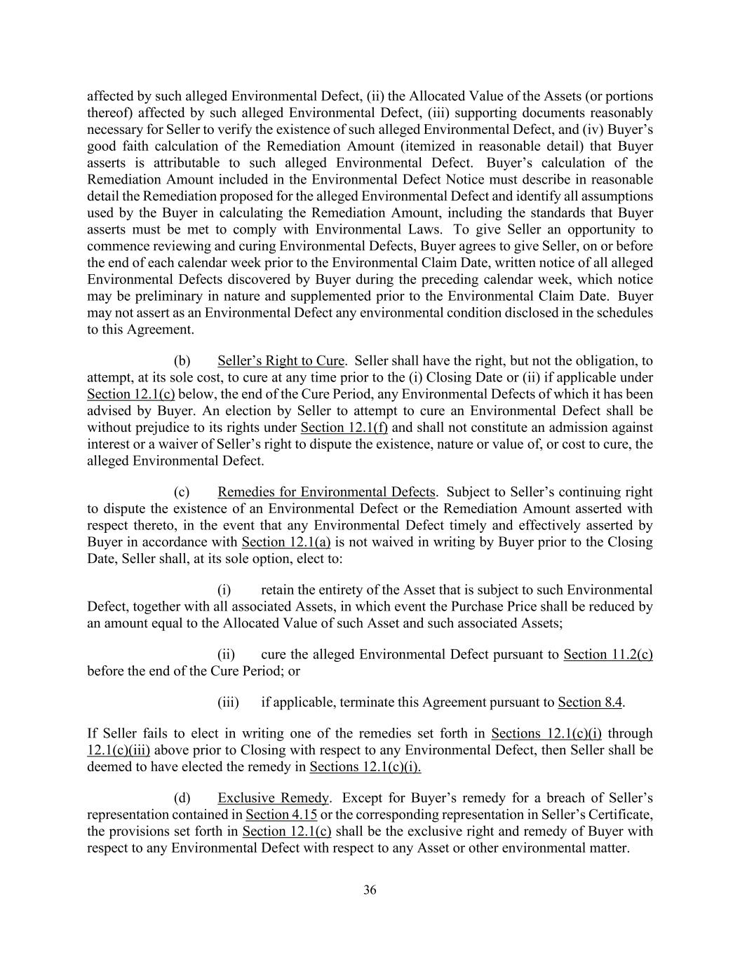 36 affected by such alleged Environmental Defect, (ii) the Allocated Value of the Assets (or portions thereof) affected by such alleged Environmental Defect, (iii) supporting documents reasonably necessary for Seller to verify the existence of such alleged Environmental Defect, and (iv) Buyer’s good faith calculation of the Remediation Amount (itemized in reasonable detail) that Buyer asserts is attributable to such alleged Environmental Defect. Buyer’s calculation of the Remediation Amount included in the Environmental Defect Notice must describe in reasonable detail the Remediation proposed for the alleged Environmental Defect and identify all assumptions used by the Buyer in calculating the Remediation Amount, including the standards that Buyer asserts must be met to comply with Environmental Laws. To give Seller an opportunity to commence reviewing and curing Environmental Defects, Buyer agrees to give Seller, on or before the end of each calendar week prior to the Environmental Claim Date, written notice of all alleged Environmental Defects discovered by Buyer during the preceding calendar week, which notice may be preliminary in nature and supplemented prior to the Environmental Claim Date. Buyer may not assert as an Environmental Defect any environmental condition disclosed in the schedules to this Agreement. (b) Seller’s Right to Cure. Seller shall have the right, but not the obligation, to attempt, at its sole cost, to cure at any time prior to the (i) Closing Date or (ii) if applicable under Section 12.1(c) below, the end of the Cure Period, any Environmental Defects of which it has been advised by Buyer. An election by Seller to attempt to cure an Environmental Defect shall be without prejudice to its rights under Section 12.1(f) and shall not constitute an admission against interest or a waiver of Seller’s right to dispute the existence, nature or value of, or cost to cure, the alleged Environmental Defect. (c) Remedies for Environmental Defects. Subject to Seller’s continuing right to dispute the existence of an Environmental Defect or the Remediation Amount asserted with respect thereto, in the event that any Environmental Defect timely and effectively asserted by Buyer in accordance with Section 12.1(a) is not waived in writing by Buyer prior to the Closing Date, Seller shall, at its sole option, elect to: (i) retain the entirety of the Asset that is subject to such Environmental Defect, together with all associated Assets, in which event the Purchase Price shall be reduced by an amount equal to the Allocated Value of such Asset and such associated Assets; (ii) cure the alleged Environmental Defect pursuant to Section 11.2(c) before the end of the Cure Period; or (iii) if applicable, terminate this Agreement pursuant to Section 8.4. If Seller fails to elect in writing one of the remedies set forth in Sections 12.1(c)(i) through 12.1(c)(iii) above prior to Closing with respect to any Environmental Defect, then Seller shall be deemed to have elected the remedy in Sections 12.1(c)(i). (d) Exclusive Remedy. Except for Buyer’s remedy for a breach of Seller’s representation contained in Section 4.15 or the corresponding representation in Seller’s Certificate, the provisions set forth in Section 12.1(c) shall be the exclusive right and remedy of Buyer with respect to any Environmental Defect with respect to any Asset or other environmental matter.