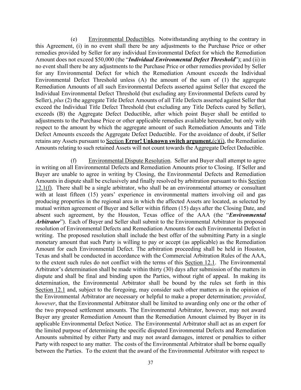 37 (e) Environmental Deductibles. Notwithstanding anything to the contrary in this Agreement, (i) in no event shall there be any adjustments to the Purchase Price or other remedies provided by Seller for any individual Environmental Defect for which the Remediation Amount does not exceed $50,000 (the “Individual Environmental Defect Threshold”); and (ii) in no event shall there be any adjustments to the Purchase Price or other remedies provided by Seller for any Environmental Defect for which the Remediation Amount exceeds the Individual Environmental Defect Threshold unless (A) the amount of the sum of (1) the aggregate Remediation Amounts of all such Environmental Defects asserted against Seller that exceed the Individual Environmental Defect Threshold (but excluding any Environmental Defects cured by Seller), plus (2) the aggregate Title Defect Amounts of all Title Defects asserted against Seller that exceed the Individual Title Defect Threshold (but excluding any Title Defects cured by Seller), exceeds (B) the Aggregate Defect Deductible, after which point Buyer shall be entitled to adjustments to the Purchase Price or other applicable remedies available hereunder, but only with respect to the amount by which the aggregate amount of such Remediation Amounts and Title Defect Amounts exceeds the Aggregate Defect Deductible. For the avoidance of doubt, if Seller retains any Assets pursuant to Section Error! Unknown switch argument.(c)(i), the Remediation Amounts relating to such retained Assets will not count towards the Aggregate Defect Deductible. (f) Environmental Dispute Resolution. Seller and Buyer shall attempt to agree in writing on all Environmental Defects and Remediation Amounts prior to Closing. If Seller and Buyer are unable to agree in writing by Closing, the Environmental Defects and Remediation Amounts in dispute shall be exclusively and finally resolved by arbitration pursuant to this Section 12.1(f). There shall be a single arbitrator, who shall be an environmental attorney or consultant with at least fifteen (15) years’ experience in environmental matters involving oil and gas producing properties in the regional area in which the affected Assets are located, as selected by mutual written agreement of Buyer and Seller within fifteen (15) days after the Closing Date, and absent such agreement, by the Houston, Texas office of the AAA (the “Environmental Arbitrator”). Each of Buyer and Seller shall submit to the Environmental Arbitrator its proposed resolution of Environmental Defects and Remediation Amounts for each Environmental Defect in writing. The proposed resolution shall include the best offer of the submitting Party in a single monetary amount that such Party is willing to pay or accept (as applicable) as the Remediation Amount for each Environmental Defect. The arbitration proceeding shall be held in Houston, Texas and shall be conducted in accordance with the Commercial Arbitration Rules of the AAA, to the extent such rules do not conflict with the terms of this Section 12.1. The Environmental Arbitrator’s determination shall be made within thirty (30) days after submission of the matters in dispute and shall be final and binding upon the Parties, without right of appeal. In making its determination, the Environmental Arbitrator shall be bound by the rules set forth in this Section 12.1 and, subject to the foregoing, may consider such other matters as in the opinion of the Environmental Arbitrator are necessary or helpful to make a proper determination; provided, however, that the Environmental Arbitrator shall be limited to awarding only one or the other of the two proposed settlement amounts. The Environmental Arbitrator, however, may not award Buyer any greater Remediation Amount than the Remediation Amount claimed by Buyer in its applicable Environmental Defect Notice. The Environmental Arbitrator shall act as an expert for the limited purpose of determining the specific disputed Environmental Defects and Remediation Amounts submitted by either Party and may not award damages, interest or penalties to either Party with respect to any matter. The costs of the Environmental Arbitrator shall be borne equally between the Parties. To the extent that the award of the Environmental Arbitrator with respect to