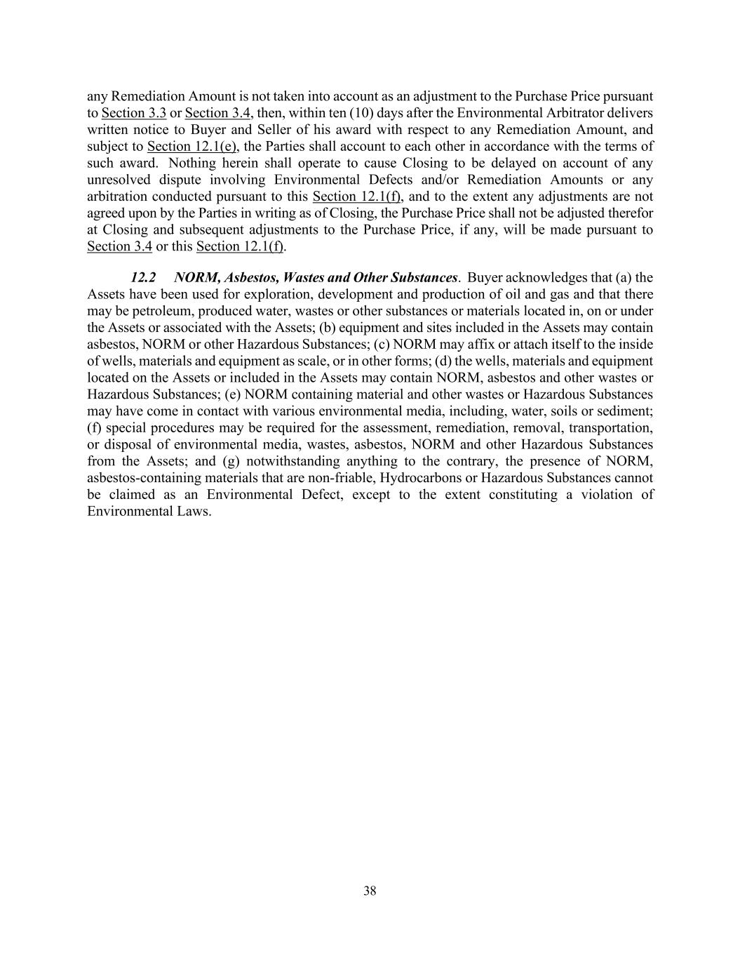 38 any Remediation Amount is not taken into account as an adjustment to the Purchase Price pursuant to Section 3.3 or Section 3.4, then, within ten (10) days after the Environmental Arbitrator delivers written notice to Buyer and Seller of his award with respect to any Remediation Amount, and subject to Section 12.1(e), the Parties shall account to each other in accordance with the terms of such award. Nothing herein shall operate to cause Closing to be delayed on account of any unresolved dispute involving Environmental Defects and/or Remediation Amounts or any arbitration conducted pursuant to this Section 12.1(f), and to the extent any adjustments are not agreed upon by the Parties in writing as of Closing, the Purchase Price shall not be adjusted therefor at Closing and subsequent adjustments to the Purchase Price, if any, will be made pursuant to Section 3.4 or this Section 12.1(f). 12.2 NORM, Asbestos, Wastes and Other Substances. Buyer acknowledges that (a) the Assets have been used for exploration, development and production of oil and gas and that there may be petroleum, produced water, wastes or other substances or materials located in, on or under the Assets or associated with the Assets; (b) equipment and sites included in the Assets may contain asbestos, NORM or other Hazardous Substances; (c) NORM may affix or attach itself to the inside of wells, materials and equipment as scale, or in other forms; (d) the wells, materials and equipment located on the Assets or included in the Assets may contain NORM, asbestos and other wastes or Hazardous Substances; (e) NORM containing material and other wastes or Hazardous Substances may have come in contact with various environmental media, including, water, soils or sediment; (f) special procedures may be required for the assessment, remediation, removal, transportation, or disposal of environmental media, wastes, asbestos, NORM and other Hazardous Substances from the Assets; and (g) notwithstanding anything to the contrary, the presence of NORM, asbestos-containing materials that are non-friable, Hydrocarbons or Hazardous Substances cannot be claimed as an Environmental Defect, except to the extent constituting a violation of Environmental Laws.