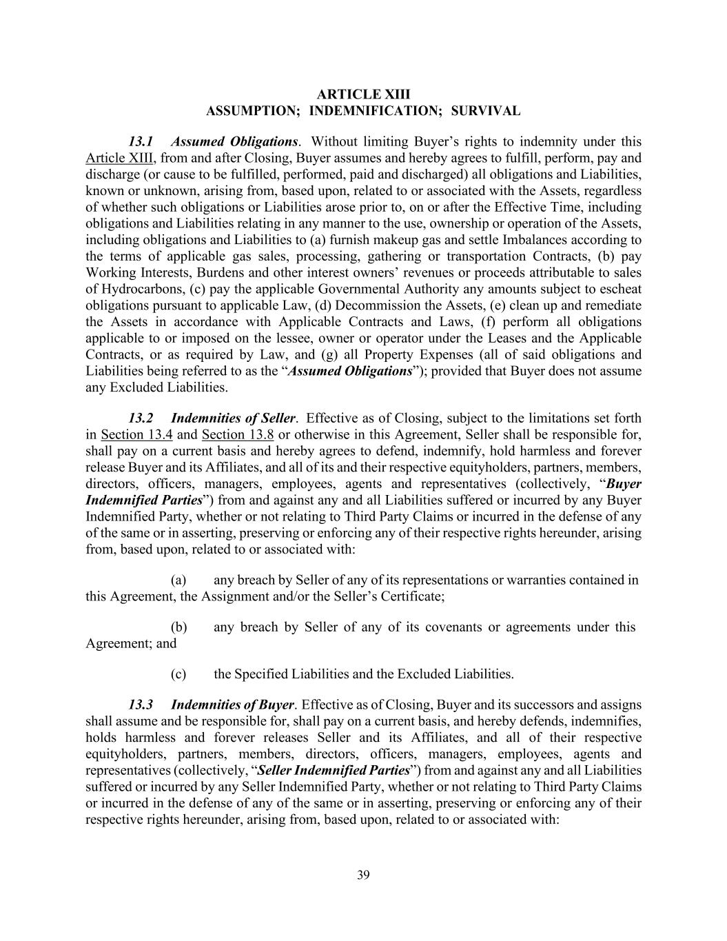 39 ARTICLE XIII ASSUMPTION; INDEMNIFICATION; SURVIVAL 13.1 Assumed Obligations. Without limiting Buyer’s rights to indemnity under this Article XIII, from and after Closing, Buyer assumes and hereby agrees to fulfill, perform, pay and discharge (or cause to be fulfilled, performed, paid and discharged) all obligations and Liabilities, known or unknown, arising from, based upon, related to or associated with the Assets, regardless of whether such obligations or Liabilities arose prior to, on or after the Effective Time, including obligations and Liabilities relating in any manner to the use, ownership or operation of the Assets, including obligations and Liabilities to (a) furnish makeup gas and settle Imbalances according to the terms of applicable gas sales, processing, gathering or transportation Contracts, (b) pay Working Interests, Burdens and other interest owners’ revenues or proceeds attributable to sales of Hydrocarbons, (c) pay the applicable Governmental Authority any amounts subject to escheat obligations pursuant to applicable Law, (d) Decommission the Assets, (e) clean up and remediate the Assets in accordance with Applicable Contracts and Laws, (f) perform all obligations applicable to or imposed on the lessee, owner or operator under the Leases and the Applicable Contracts, or as required by Law, and (g) all Property Expenses (all of said obligations and Liabilities being referred to as the “Assumed Obligations”); provided that Buyer does not assume any Excluded Liabilities. 13.2 Indemnities of Seller. Effective as of Closing, subject to the limitations set forth in Section 13.4 and Section 13.8 or otherwise in this Agreement, Seller shall be responsible for, shall pay on a current basis and hereby agrees to defend, indemnify, hold harmless and forever release Buyer and its Affiliates, and all of its and their respective equityholders, partners, members, directors, officers, managers, employees, agents and representatives (collectively, “Buyer Indemnified Parties”) from and against any and all Liabilities suffered or incurred by any Buyer Indemnified Party, whether or not relating to Third Party Claims or incurred in the defense of any of the same or in asserting, preserving or enforcing any of their respective rights hereunder, arising from, based upon, related to or associated with: (a) any breach by Seller of any of its representations or warranties contained in this Agreement, the Assignment and/or the Seller’s Certificate; (b) any breach by Seller of any of its covenants or agreements under this Agreement; and (c) the Specified Liabilities and the Excluded Liabilities. 13.3 Indemnities of Buyer. Effective as of Closing, Buyer and its successors and assigns shall assume and be responsible for, shall pay on a current basis, and hereby defends, indemnifies, holds harmless and forever releases Seller and its Affiliates, and all of their respective equityholders, partners, members, directors, officers, managers, employees, agents and representatives (collectively, “Seller Indemnified Parties”) from and against any and all Liabilities suffered or incurred by any Seller Indemnified Party, whether or not relating to Third Party Claims or incurred in the defense of any of the same or in asserting, preserving or enforcing any of their respective rights hereunder, arising from, based upon, related to or associated with: