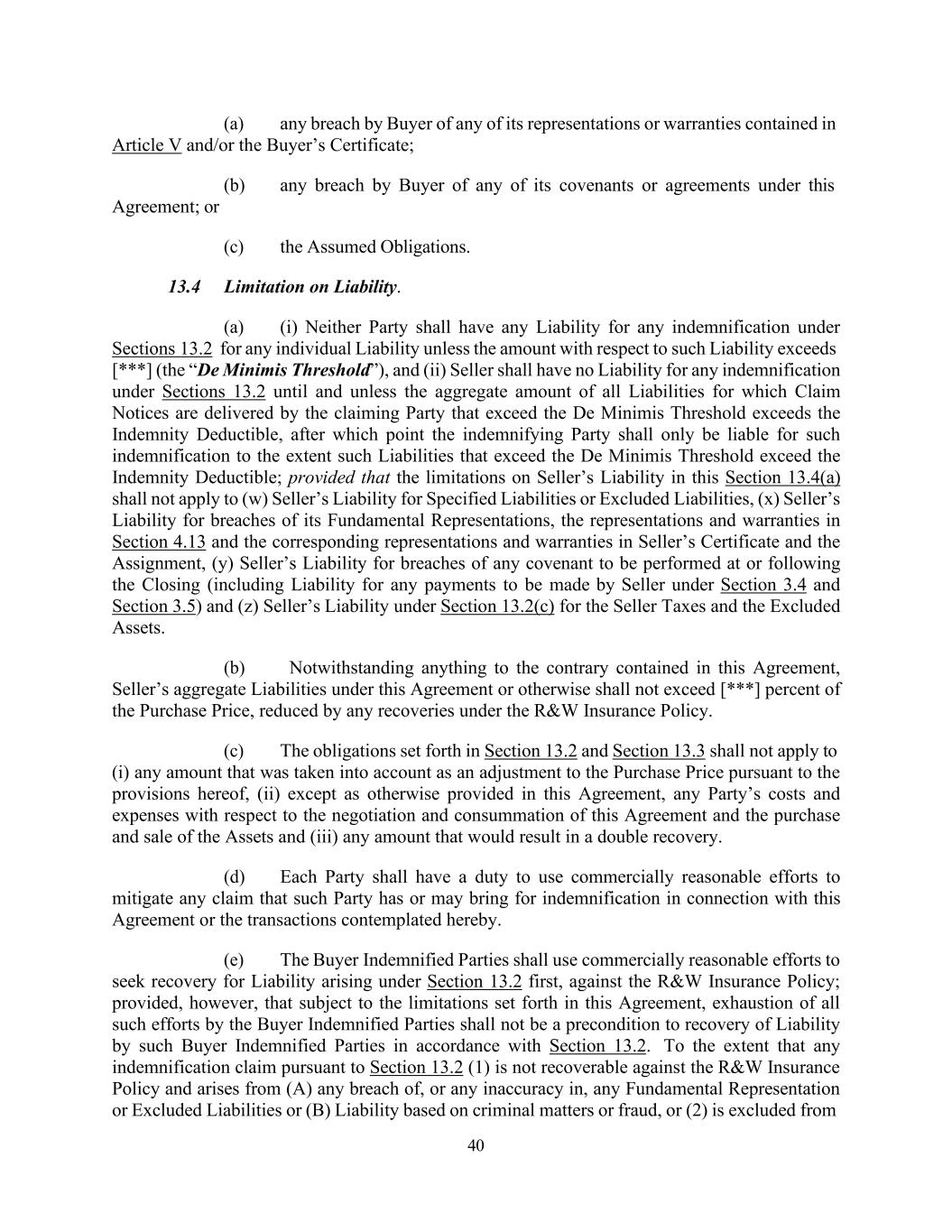 40 (a) any breach by Buyer of any of its representations or warranties contained in Article V and/or the Buyer’s Certificate; (b) any breach by Buyer of any of its covenants or agreements under this Agreement; or (c) the Assumed Obligations. 13.4 Limitation on Liability. (a) (i) Neither Party shall have any Liability for any indemnification under Sections 13.2 for any individual Liability unless the amount with respect to such Liability exceeds [***] (the “De Minimis Threshold”), and (ii) Seller shall have no Liability for any indemnification under Sections 13.2 until and unless the aggregate amount of all Liabilities for which Claim Notices are delivered by the claiming Party that exceed the De Minimis Threshold exceeds the Indemnity Deductible, after which point the indemnifying Party shall only be liable for such indemnification to the extent such Liabilities that exceed the De Minimis Threshold exceed the Indemnity Deductible; provided that the limitations on Seller’s Liability in this Section 13.4(a) shall not apply to (w) Seller’s Liability for Specified Liabilities or Excluded Liabilities, (x) Seller’s Liability for breaches of its Fundamental Representations, the representations and warranties in Section 4.13 and the corresponding representations and warranties in Seller’s Certificate and the Assignment, (y) Seller’s Liability for breaches of any covenant to be performed at or following the Closing (including Liability for any payments to be made by Seller under Section 3.4 and Section 3.5) and (z) Seller’s Liability under Section 13.2(c) for the Seller Taxes and the Excluded Assets. (b) Notwithstanding anything to the contrary contained in this Agreement, Seller’s aggregate Liabilities under this Agreement or otherwise shall not exceed [***] percent of the Purchase Price, reduced by any recoveries under the R&W Insurance Policy. (c) The obligations set forth in Section 13.2 and Section 13.3 shall not apply to (i) any amount that was taken into account as an adjustment to the Purchase Price pursuant to the provisions hereof, (ii) except as otherwise provided in this Agreement, any Party’s costs and expenses with respect to the negotiation and consummation of this Agreement and the purchase and sale of the Assets and (iii) any amount that would result in a double recovery. (d) Each Party shall have a duty to use commercially reasonable efforts to mitigate any claim that such Party has or may bring for indemnification in connection with this Agreement or the transactions contemplated hereby. (e) The Buyer Indemnified Parties shall use commercially reasonable efforts to seek recovery for Liability arising under Section 13.2 first, against the R&W Insurance Policy; provided, however, that subject to the limitations set forth in this Agreement, exhaustion of all such efforts by the Buyer Indemnified Parties shall not be a precondition to recovery of Liability by such Buyer Indemnified Parties in accordance with Section 13.2. To the extent that any indemnification claim pursuant to Section 13.2 (1) is not recoverable against the R&W Insurance Policy and arises from (A) any breach of, or any inaccuracy in, any Fundamental Representation or Excluded Liabilities or (B) Liability based on criminal matters or fraud, or (2) is excluded from