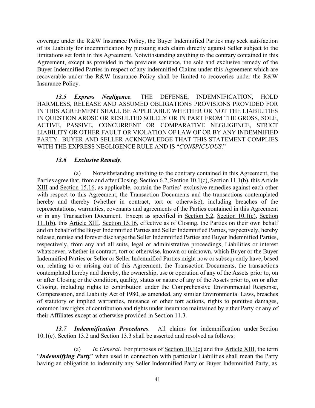 41 coverage under the R&W Insurance Policy, the Buyer Indemnified Parties may seek satisfaction of its Liability for indemnification by pursuing such claim directly against Seller subject to the limitations set forth in this Agreement. Notwithstanding anything to the contrary contained in this Agreement, except as provided in the previous sentence, the sole and exclusive remedy of the Buyer Indemnified Parties in respect of any indemnified Claims under this Agreement which are recoverable under the R&W Insurance Policy shall be limited to recoveries under the R&W Insurance Policy. 13.5 Express Negligence. THE DEFENSE, INDEMNIFICATION, HOLD HARMLESS, RELEASE AND ASSUMED OBLIGATIONS PROVISIONS PROVIDED FOR IN THIS AGREEMENT SHALL BE APPLICABLE WHETHER OR NOT THE LIABILITIES IN QUESTION AROSE OR RESULTED SOLELY OR IN PART FROM THE GROSS, SOLE, ACTIVE, PASSIVE, CONCURRENT OR COMPARATIVE NEGLIGENCE, STRICT LIABILITY OR OTHER FAULT OR VIOLATION OF LAW OF OR BY ANY INDEMNIFIED PARTY. BUYER AND SELLER ACKNOWLEDGE THAT THIS STATEMENT COMPLIES WITH THE EXPRESS NEGLIGENCE RULE AND IS “CONSPICUOUS.” 13.6 Exclusive Remedy. (a) Notwithstanding anything to the contrary contained in this Agreement, the Parties agree that, from and after Closing, Section 6.2, Section 10.1(c), Section 11.1(b), this Article XIII and Section 15.16, as applicable, contain the Parties’ exclusive remedies against each other with respect to this Agreement, the Transaction Documents and the transactions contemplated hereby and thereby (whether in contract, tort or otherwise), including breaches of the representations, warranties, covenants and agreements of the Parties contained in this Agreement or in any Transaction Document. Except as specified in Section 6.2, Section 10.1(c), Section 11.1(b), this Article XIII, Section 15.16, effective as of Closing, the Parties on their own behalf and on behalf of the Buyer Indemnified Parties and Seller Indemnified Parties, respectively, hereby release, remise and forever discharge the Seller Indemnified Parties and Buyer Indemnified Parties, respectively, from any and all suits, legal or administrative proceedings, Liabilities or interest whatsoever, whether in contract, tort or otherwise, known or unknown, which Buyer or the Buyer Indemnified Parties or Seller or Seller Indemnified Parties might now or subsequently have, based on, relating to or arising out of this Agreement, the Transaction Documents, the transactions contemplated hereby and thereby, the ownership, use or operation of any of the Assets prior to, on or after Closing or the condition, quality, status or nature of any of the Assets prior to, on or after Closing, including rights to contribution under the Comprehensive Environmental Response, Compensation, and Liability Act of 1980, as amended, any similar Environmental Laws, breaches of statutory or implied warranties, nuisance or other tort actions, rights to punitive damages, common law rights of contribution and rights under insurance maintained by either Party or any of their Affiliates except as otherwise provided in Section 11.3. 13.7 Indemnification Procedures. All claims for indemnification under Section 10.1(c), Section 13.2 and Section 13.3 shall be asserted and resolved as follows: (a) In General. For purposes of Section 10.1(c) and this Article XIII, the term “Indemnifying Party” when used in connection with particular Liabilities shall mean the Party having an obligation to indemnify any Seller Indemnified Party or Buyer Indemnified Party, as