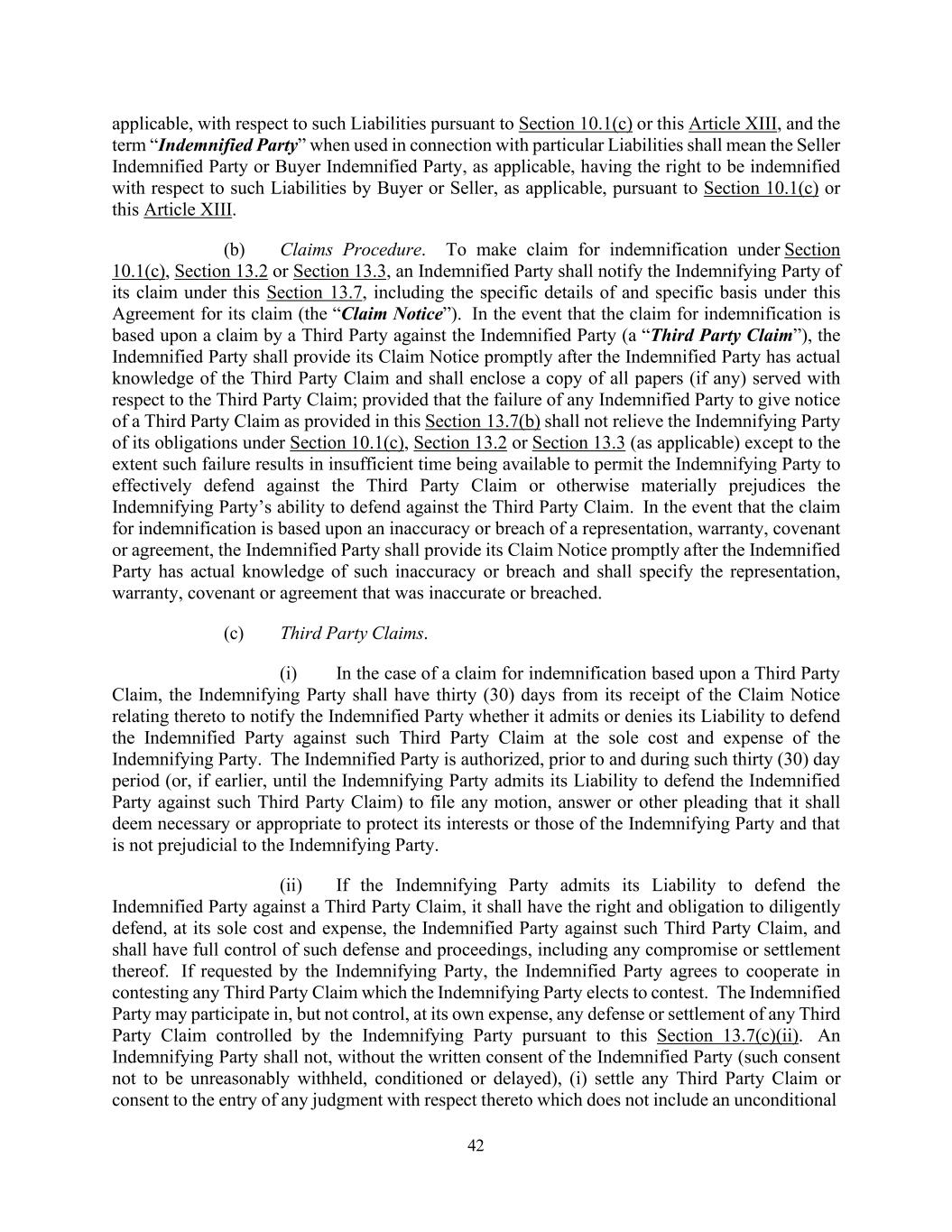 42 applicable, with respect to such Liabilities pursuant to Section 10.1(c) or this Article XIII, and the term “Indemnified Party” when used in connection with particular Liabilities shall mean the Seller Indemnified Party or Buyer Indemnified Party, as applicable, having the right to be indemnified with respect to such Liabilities by Buyer or Seller, as applicable, pursuant to Section 10.1(c) or this Article XIII. (b) Claims Procedure. To make claim for indemnification under Section 10.1(c), Section 13.2 or Section 13.3, an Indemnified Party shall notify the Indemnifying Party of its claim under this Section 13.7, including the specific details of and specific basis under this Agreement for its claim (the “Claim Notice”). In the event that the claim for indemnification is based upon a claim by a Third Party against the Indemnified Party (a “Third Party Claim”), the Indemnified Party shall provide its Claim Notice promptly after the Indemnified Party has actual knowledge of the Third Party Claim and shall enclose a copy of all papers (if any) served with respect to the Third Party Claim; provided that the failure of any Indemnified Party to give notice of a Third Party Claim as provided in this Section 13.7(b) shall not relieve the Indemnifying Party of its obligations under Section 10.1(c), Section 13.2 or Section 13.3 (as applicable) except to the extent such failure results in insufficient time being available to permit the Indemnifying Party to effectively defend against the Third Party Claim or otherwise materially prejudices the Indemnifying Party’s ability to defend against the Third Party Claim. In the event that the claim for indemnification is based upon an inaccuracy or breach of a representation, warranty, covenant or agreement, the Indemnified Party shall provide its Claim Notice promptly after the Indemnified Party has actual knowledge of such inaccuracy or breach and shall specify the representation, warranty, covenant or agreement that was inaccurate or breached. (c) Third Party Claims. (i) In the case of a claim for indemnification based upon a Third Party Claim, the Indemnifying Party shall have thirty (30) days from its receipt of the Claim Notice relating thereto to notify the Indemnified Party whether it admits or denies its Liability to defend the Indemnified Party against such Third Party Claim at the sole cost and expense of the Indemnifying Party. The Indemnified Party is authorized, prior to and during such thirty (30) day period (or, if earlier, until the Indemnifying Party admits its Liability to defend the Indemnified Party against such Third Party Claim) to file any motion, answer or other pleading that it shall deem necessary or appropriate to protect its interests or those of the Indemnifying Party and that is not prejudicial to the Indemnifying Party. (ii) If the Indemnifying Party admits its Liability to defend the Indemnified Party against a Third Party Claim, it shall have the right and obligation to diligently defend, at its sole cost and expense, the Indemnified Party against such Third Party Claim, and shall have full control of such defense and proceedings, including any compromise or settlement thereof. If requested by the Indemnifying Party, the Indemnified Party agrees to cooperate in contesting any Third Party Claim which the Indemnifying Party elects to contest. The Indemnified Party may participate in, but not control, at its own expense, any defense or settlement of any Third Party Claim controlled by the Indemnifying Party pursuant to this Section 13.7(c)(ii). An Indemnifying Party shall not, without the written consent of the Indemnified Party (such consent not to be unreasonably withheld, conditioned or delayed), (i) settle any Third Party Claim or consent to the entry of any judgment with respect thereto which does not include an unconditional