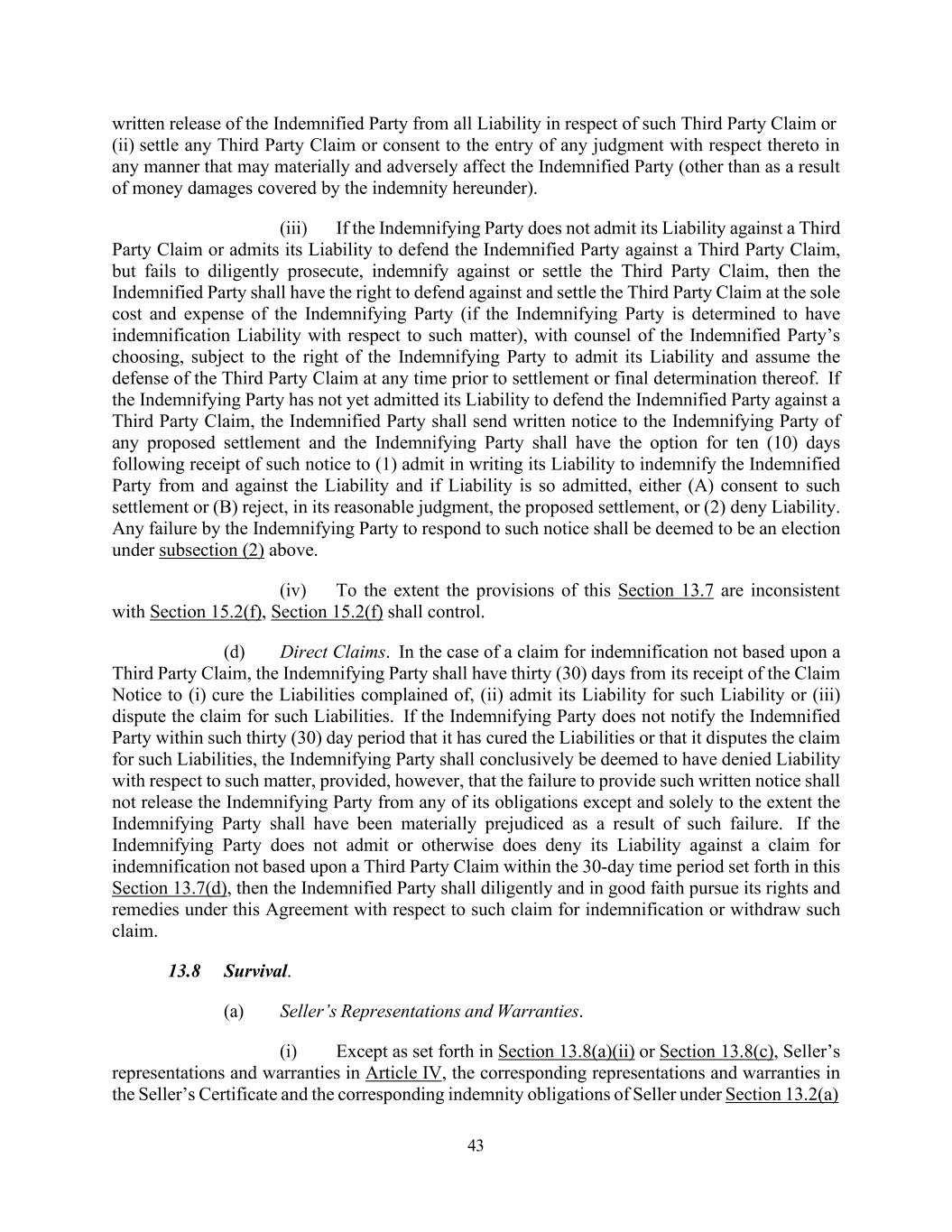 43 written release of the Indemnified Party from all Liability in respect of such Third Party Claim or (ii) settle any Third Party Claim or consent to the entry of any judgment with respect thereto in any manner that may materially and adversely affect the Indemnified Party (other than as a result of money damages covered by the indemnity hereunder). (iii) If the Indemnifying Party does not admit its Liability against a Third Party Claim or admits its Liability to defend the Indemnified Party against a Third Party Claim, but fails to diligently prosecute, indemnify against or settle the Third Party Claim, then the Indemnified Party shall have the right to defend against and settle the Third Party Claim at the sole cost and expense of the Indemnifying Party (if the Indemnifying Party is determined to have indemnification Liability with respect to such matter), with counsel of the Indemnified Party’s choosing, subject to the right of the Indemnifying Party to admit its Liability and assume the defense of the Third Party Claim at any time prior to settlement or final determination thereof. If the Indemnifying Party has not yet admitted its Liability to defend the Indemnified Party against a Third Party Claim, the Indemnified Party shall send written notice to the Indemnifying Party of any proposed settlement and the Indemnifying Party shall have the option for ten (10) days following receipt of such notice to (1) admit in writing its Liability to indemnify the Indemnified Party from and against the Liability and if Liability is so admitted, either (A) consent to such settlement or (B) reject, in its reasonable judgment, the proposed settlement, or (2) deny Liability. Any failure by the Indemnifying Party to respond to such notice shall be deemed to be an election under subsection (2) above. (iv) To the extent the provisions of this Section 13.7 are inconsistent with Section 15.2(f), Section 15.2(f) shall control. (d) Direct Claims. In the case of a claim for indemnification not based upon a Third Party Claim, the Indemnifying Party shall have thirty (30) days from its receipt of the Claim Notice to (i) cure the Liabilities complained of, (ii) admit its Liability for such Liability or (iii) dispute the claim for such Liabilities. If the Indemnifying Party does not notify the Indemnified Party within such thirty (30) day period that it has cured the Liabilities or that it disputes the claim for such Liabilities, the Indemnifying Party shall conclusively be deemed to have denied Liability with respect to such matter, provided, however, that the failure to provide such written notice shall not release the Indemnifying Party from any of its obligations except and solely to the extent the Indemnifying Party shall have been materially prejudiced as a result of such failure. If the Indemnifying Party does not admit or otherwise does deny its Liability against a claim for indemnification not based upon a Third Party Claim within the 30-day time period set forth in this Section 13.7(d), then the Indemnified Party shall diligently and in good faith pursue its rights and remedies under this Agreement with respect to such claim for indemnification or withdraw such claim. 13.8 Survival. (a) Seller’s Representations and Warranties. (i) Except as set forth in Section 13.8(a)(ii) or Section 13.8(c), Seller’s representations and warranties in Article IV, the corresponding representations and warranties in the Seller’s Certificate and the corresponding indemnity obligations of Seller under Section 13.2(a)