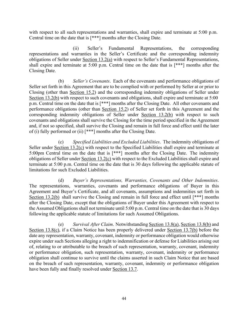 44 with respect to all such representations and warranties, shall expire and terminate at 5:00 p.m. Central time on the date that is [***] months after the Closing Date. (ii) Seller’s Fundamental Representations, the corresponding representations and warranties in the Seller’s Certificate and the corresponding indemnity obligations of Seller under Section 13.2(a) with respect to Seller’s Fundamental Representations, shall expire and terminate at 5:00 p.m. Central time on the date that is [***] months after the Closing Date. (b) Seller’s Covenants. Each of the covenants and performance obligations of Seller set forth in this Agreement that are to be complied with or performed by Seller at or prior to Closing (other than Section 15.2) and the corresponding indemnity obligations of Seller under Section 13.2(b) with respect to such covenants and obligations, shall expire and terminate at 5:00 p.m. Central time on the date that is [***] months after the Closing Date. All other covenants and performance obligations (other than Section 15.2) of Seller set forth in this Agreement and the corresponding indemnity obligations of Seller under Section 13.2(b) with respect to such covenants and obligations shall survive the Closing for the time period specified in the Agreement and, if not so specified, shall survive the Closing and remain in full force and effect until the later of (i) fully performed or (ii) [***] months after the Closing Date. (c) Specified Liabilities and Excluded Liabilities. The indemnity obligations of Seller under Section 13.2(c) with respect to the Specified Liabilities shall expire and terminate at 5:00pm Central time on the date that is [***] months after the Closing Date. The indemnity obligations of Seller under Section 13.2(c) with respect to the Excluded Liabilities shall expire and terminate at 5:00 p.m. Central time on the date that is 30 days following the applicable statute of limitations for such Excluded Liabilities. (d) Buyer’s Representations, Warranties, Covenants and Other Indemnities. The representations, warranties, covenants and performance obligations of Buyer in this Agreement and Buyer’s Certificate, and all covenants, assumptions and indemnities set forth in Section 13.2(b) shall survive the Closing and remain in full force and effect until [***] months after the Closing Date, except that the obligations of Buyer under this Agreement with respect to the Assumed Obligations shall not terminate until 5:00 p.m. Central time on the date that is 30 days following the applicable statute of limitations for such Assumed Obligations. (e) Survival After Claim. Notwithstanding Section 13.8(a), Section 13.8(b) and Section 13.8(c), if a Claim Notice has been properly delivered under Section 13.7(b) before the date any representation, warranty, covenant, indemnity or performance obligation would otherwise expire under such Sections alleging a right to indemnification or defense for Liabilities arising out of, relating to or attributable to the breach of such representation, warranty, covenant, indemnity or performance obligation, such representation, warranty, covenant, indemnity or performance obligation shall continue to survive until the claims asserted in such Claim Notice that are based on the breach of such representation, warranty, covenant, indemnity or performance obligation have been fully and finally resolved under Section 13.7.