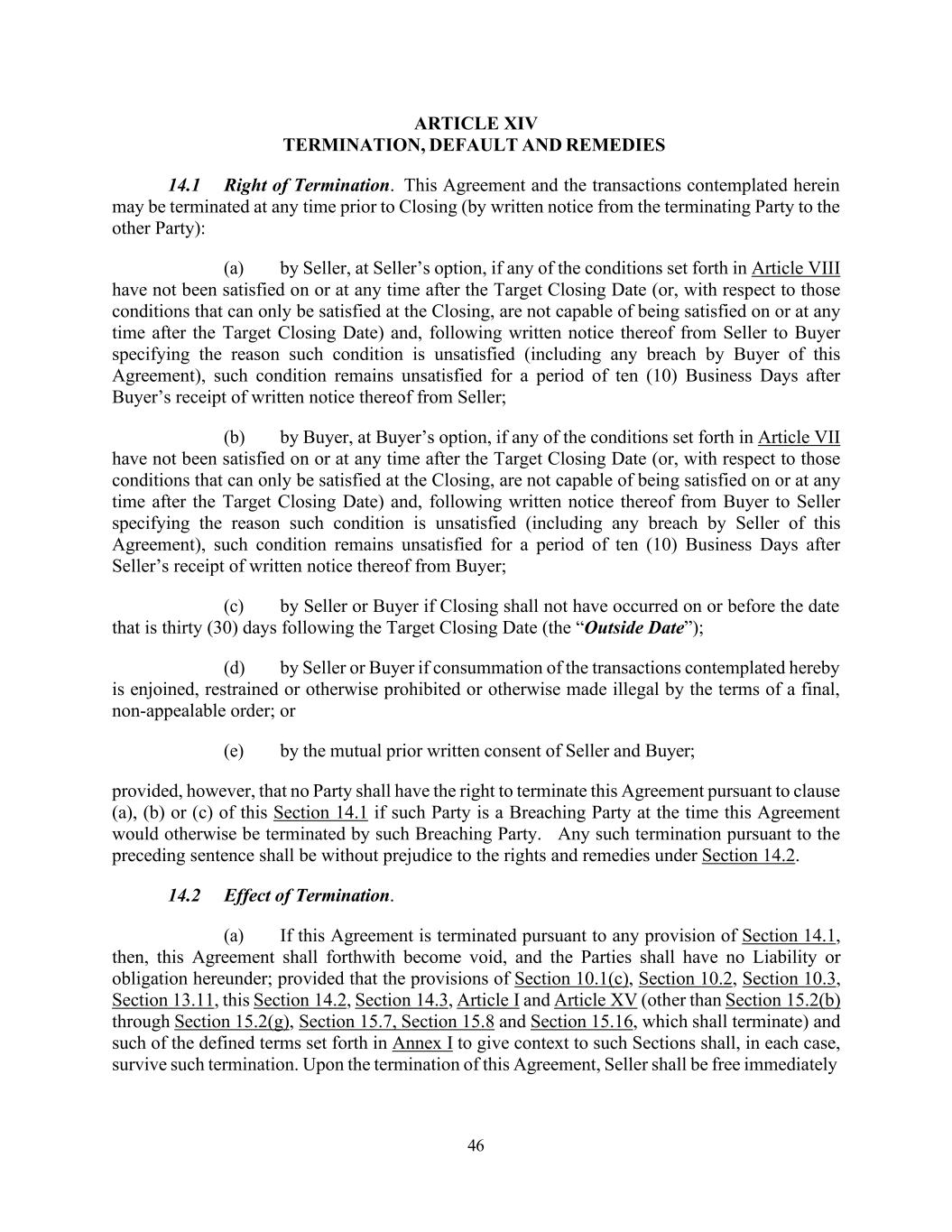 46 ARTICLE XIV TERMINATION, DEFAULT AND REMEDIES 14.1 Right of Termination. This Agreement and the transactions contemplated herein may be terminated at any time prior to Closing (by written notice from the terminating Party to the other Party): (a) by Seller, at Seller’s option, if any of the conditions set forth in Article VIII have not been satisfied on or at any time after the Target Closing Date (or, with respect to those conditions that can only be satisfied at the Closing, are not capable of being satisfied on or at any time after the Target Closing Date) and, following written notice thereof from Seller to Buyer specifying the reason such condition is unsatisfied (including any breach by Buyer of this Agreement), such condition remains unsatisfied for a period of ten (10) Business Days after Buyer’s receipt of written notice thereof from Seller; (b) by Buyer, at Buyer’s option, if any of the conditions set forth in Article VII have not been satisfied on or at any time after the Target Closing Date (or, with respect to those conditions that can only be satisfied at the Closing, are not capable of being satisfied on or at any time after the Target Closing Date) and, following written notice thereof from Buyer to Seller specifying the reason such condition is unsatisfied (including any breach by Seller of this Agreement), such condition remains unsatisfied for a period of ten (10) Business Days after Seller’s receipt of written notice thereof from Buyer; (c) by Seller or Buyer if Closing shall not have occurred on or before the date that is thirty (30) days following the Target Closing Date (the “Outside Date”); (d) by Seller or Buyer if consummation of the transactions contemplated hereby is enjoined, restrained or otherwise prohibited or otherwise made illegal by the terms of a final, non-appealable order; or (e) by the mutual prior written consent of Seller and Buyer; provided, however, that no Party shall have the right to terminate this Agreement pursuant to clause (a), (b) or (c) of this Section 14.1 if such Party is a Breaching Party at the time this Agreement would otherwise be terminated by such Breaching Party. Any such termination pursuant to the preceding sentence shall be without prejudice to the rights and remedies under Section 14.2. 14.2 Effect of Termination. (a) If this Agreement is terminated pursuant to any provision of Section 14.1, then, this Agreement shall forthwith become void, and the Parties shall have no Liability or obligation hereunder; provided that the provisions of Section 10.1(c), Section 10.2, Section 10.3, Section 13.11, this Section 14.2, Section 14.3, Article I and Article XV (other than Section 15.2(b) through Section 15.2(g), Section 15.7, Section 15.8 and Section 15.16, which shall terminate) and such of the defined terms set forth in Annex I to give context to such Sections shall, in each case, survive such termination. Upon the termination of this Agreement, Seller shall be free immediately