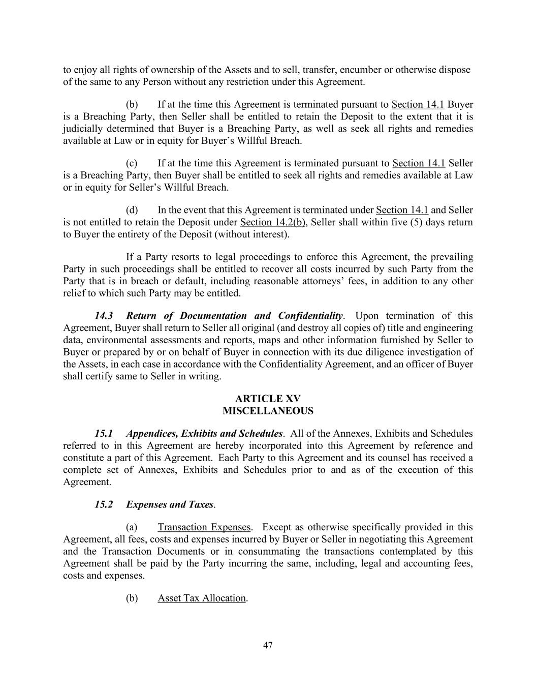 47 to enjoy all rights of ownership of the Assets and to sell, transfer, encumber or otherwise dispose of the same to any Person without any restriction under this Agreement. (b) If at the time this Agreement is terminated pursuant to Section 14.1 Buyer is a Breaching Party, then Seller shall be entitled to retain the Deposit to the extent that it is judicially determined that Buyer is a Breaching Party, as well as seek all rights and remedies available at Law or in equity for Buyer’s Willful Breach. (c) If at the time this Agreement is terminated pursuant to Section 14.1 Seller is a Breaching Party, then Buyer shall be entitled to seek all rights and remedies available at Law or in equity for Seller’s Willful Breach. (d) In the event that this Agreement is terminated under Section 14.1 and Seller is not entitled to retain the Deposit under Section 14.2(b), Seller shall within five (5) days return to Buyer the entirety of the Deposit (without interest). If a Party resorts to legal proceedings to enforce this Agreement, the prevailing Party in such proceedings shall be entitled to recover all costs incurred by such Party from the Party that is in breach or default, including reasonable attorneys’ fees, in addition to any other relief to which such Party may be entitled. 14.3 Return of Documentation and Confidentiality. Upon termination of this Agreement, Buyer shall return to Seller all original (and destroy all copies of) title and engineering data, environmental assessments and reports, maps and other information furnished by Seller to Buyer or prepared by or on behalf of Buyer in connection with its due diligence investigation of the Assets, in each case in accordance with the Confidentiality Agreement, and an officer of Buyer shall certify same to Seller in writing. ARTICLE XV MISCELLANEOUS 15.1 Appendices, Exhibits and Schedules. All of the Annexes, Exhibits and Schedules referred to in this Agreement are hereby incorporated into this Agreement by reference and constitute a part of this Agreement. Each Party to this Agreement and its counsel has received a complete set of Annexes, Exhibits and Schedules prior to and as of the execution of this Agreement. 15.2 Expenses and Taxes. (a) Transaction Expenses. Except as otherwise specifically provided in this Agreement, all fees, costs and expenses incurred by Buyer or Seller in negotiating this Agreement and the Transaction Documents or in consummating the transactions contemplated by this Agreement shall be paid by the Party incurring the same, including, legal and accounting fees, costs and expenses. (b) Asset Tax Allocation.
