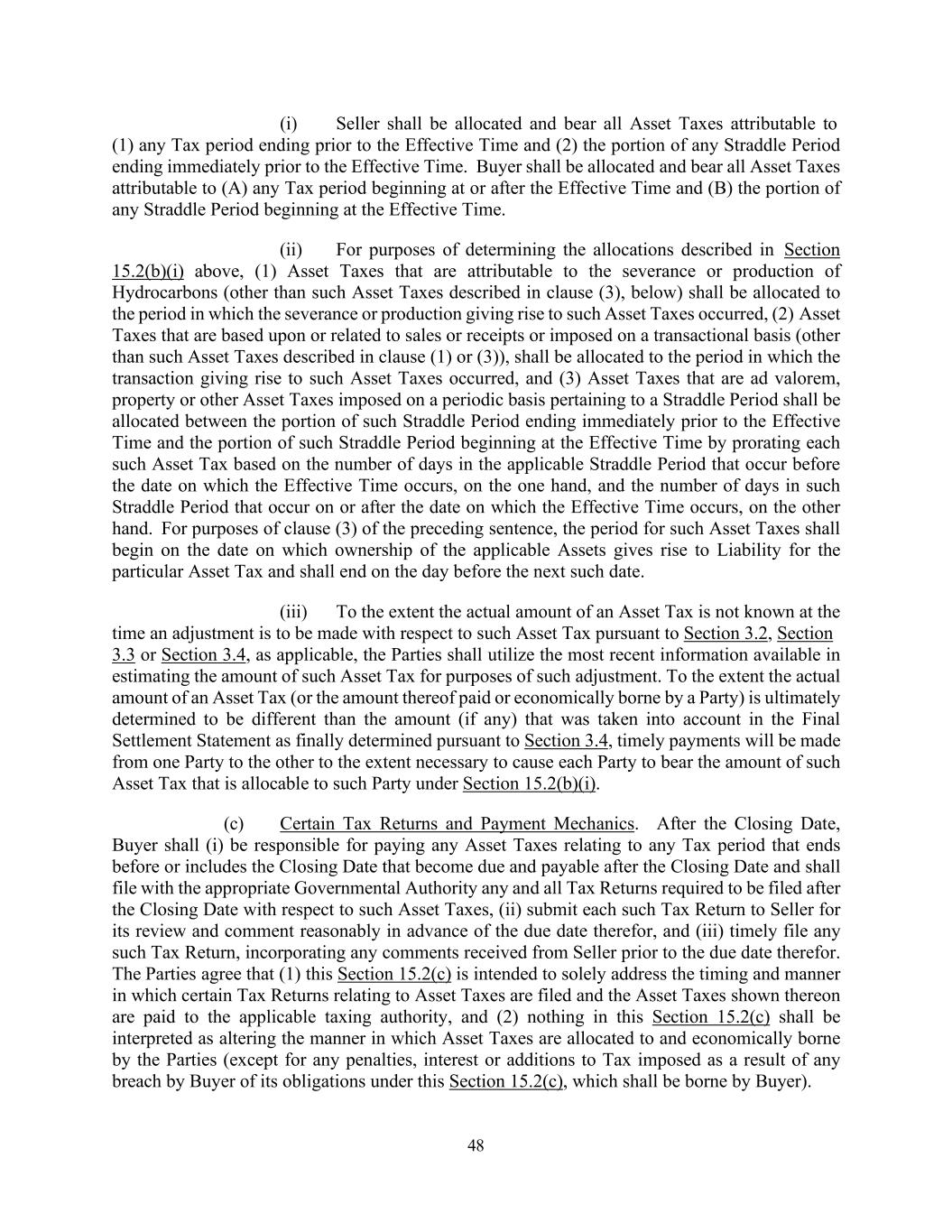 48 (i) Seller shall be allocated and bear all Asset Taxes attributable to (1) any Tax period ending prior to the Effective Time and (2) the portion of any Straddle Period ending immediately prior to the Effective Time. Buyer shall be allocated and bear all Asset Taxes attributable to (A) any Tax period beginning at or after the Effective Time and (B) the portion of any Straddle Period beginning at the Effective Time. (ii) For purposes of determining the allocations described in Section 15.2(b)(i) above, (1) Asset Taxes that are attributable to the severance or production of Hydrocarbons (other than such Asset Taxes described in clause (3), below) shall be allocated to the period in which the severance or production giving rise to such Asset Taxes occurred, (2) Asset Taxes that are based upon or related to sales or receipts or imposed on a transactional basis (other than such Asset Taxes described in clause (1) or (3)), shall be allocated to the period in which the transaction giving rise to such Asset Taxes occurred, and (3) Asset Taxes that are ad valorem, property or other Asset Taxes imposed on a periodic basis pertaining to a Straddle Period shall be allocated between the portion of such Straddle Period ending immediately prior to the Effective Time and the portion of such Straddle Period beginning at the Effective Time by prorating each such Asset Tax based on the number of days in the applicable Straddle Period that occur before the date on which the Effective Time occurs, on the one hand, and the number of days in such Straddle Period that occur on or after the date on which the Effective Time occurs, on the other hand. For purposes of clause (3) of the preceding sentence, the period for such Asset Taxes shall begin on the date on which ownership of the applicable Assets gives rise to Liability for the particular Asset Tax and shall end on the day before the next such date. (iii) To the extent the actual amount of an Asset Tax is not known at the time an adjustment is to be made with respect to such Asset Tax pursuant to Section 3.2, Section 3.3 or Section 3.4, as applicable, the Parties shall utilize the most recent information available in estimating the amount of such Asset Tax for purposes of such adjustment. To the extent the actual amount of an Asset Tax (or the amount thereof paid or economically borne by a Party) is ultimately determined to be different than the amount (if any) that was taken into account in the Final Settlement Statement as finally determined pursuant to Section 3.4, timely payments will be made from one Party to the other to the extent necessary to cause each Party to bear the amount of such Asset Tax that is allocable to such Party under Section 15.2(b)(i). (c) Certain Tax Returns and Payment Mechanics. After the Closing Date, Buyer shall (i) be responsible for paying any Asset Taxes relating to any Tax period that ends before or includes the Closing Date that become due and payable after the Closing Date and shall file with the appropriate Governmental Authority any and all Tax Returns required to be filed after the Closing Date with respect to such Asset Taxes, (ii) submit each such Tax Return to Seller for its review and comment reasonably in advance of the due date therefor, and (iii) timely file any such Tax Return, incorporating any comments received from Seller prior to the due date therefor. The Parties agree that (1) this Section 15.2(c) is intended to solely address the timing and manner in which certain Tax Returns relating to Asset Taxes are filed and the Asset Taxes shown thereon are paid to the applicable taxing authority, and (2) nothing in this Section 15.2(c) shall be interpreted as altering the manner in which Asset Taxes are allocated to and economically borne by the Parties (except for any penalties, interest or additions to Tax imposed as a result of any breach by Buyer of its obligations under this Section 15.2(c), which shall be borne by Buyer).