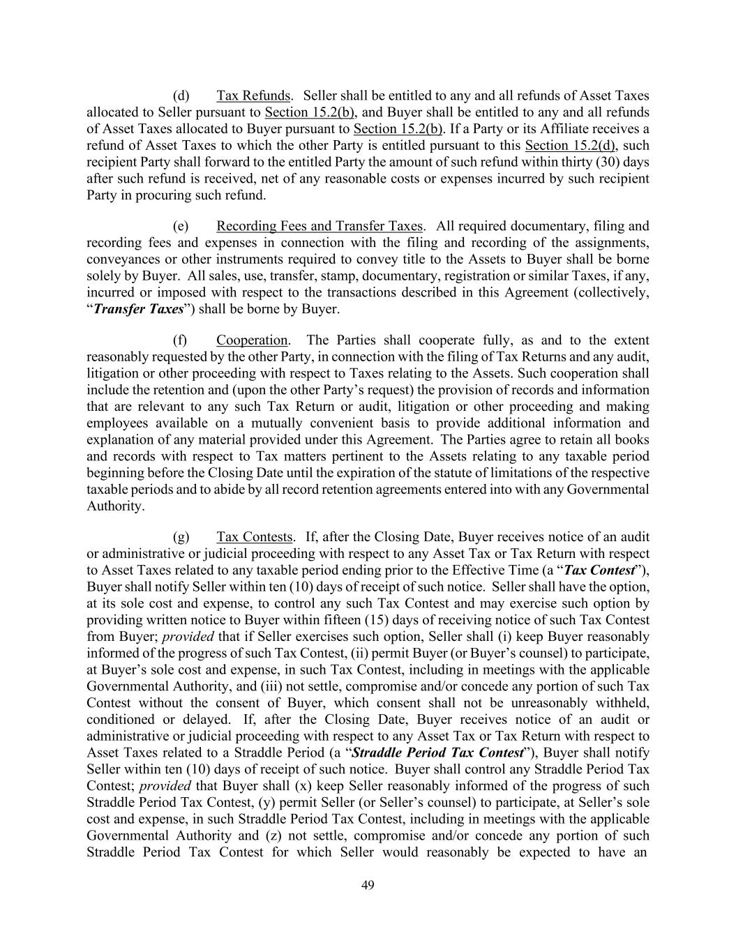 49 (d) Tax Refunds. Seller shall be entitled to any and all refunds of Asset Taxes allocated to Seller pursuant to Section 15.2(b), and Buyer shall be entitled to any and all refunds of Asset Taxes allocated to Buyer pursuant to Section 15.2(b). If a Party or its Affiliate receives a refund of Asset Taxes to which the other Party is entitled pursuant to this Section 15.2(d), such recipient Party shall forward to the entitled Party the amount of such refund within thirty (30) days after such refund is received, net of any reasonable costs or expenses incurred by such recipient Party in procuring such refund. (e) Recording Fees and Transfer Taxes. All required documentary, filing and recording fees and expenses in connection with the filing and recording of the assignments, conveyances or other instruments required to convey title to the Assets to Buyer shall be borne solely by Buyer. All sales, use, transfer, stamp, documentary, registration or similar Taxes, if any, incurred or imposed with respect to the transactions described in this Agreement (collectively, “Transfer Taxes”) shall be borne by Buyer. (f) Cooperation. The Parties shall cooperate fully, as and to the extent reasonably requested by the other Party, in connection with the filing of Tax Returns and any audit, litigation or other proceeding with respect to Taxes relating to the Assets. Such cooperation shall include the retention and (upon the other Party’s request) the provision of records and information that are relevant to any such Tax Return or audit, litigation or other proceeding and making employees available on a mutually convenient basis to provide additional information and explanation of any material provided under this Agreement. The Parties agree to retain all books and records with respect to Tax matters pertinent to the Assets relating to any taxable period beginning before the Closing Date until the expiration of the statute of limitations of the respective taxable periods and to abide by all record retention agreements entered into with any Governmental Authority. (g) Tax Contests. If, after the Closing Date, Buyer receives notice of an audit or administrative or judicial proceeding with respect to any Asset Tax or Tax Return with respect to Asset Taxes related to any taxable period ending prior to the Effective Time (a “Tax Contest”), Buyer shall notify Seller within ten (10) days of receipt of such notice. Seller shall have the option, at its sole cost and expense, to control any such Tax Contest and may exercise such option by providing written notice to Buyer within fifteen (15) days of receiving notice of such Tax Contest from Buyer; provided that if Seller exercises such option, Seller shall (i) keep Buyer reasonably informed of the progress of such Tax Contest, (ii) permit Buyer (or Buyer’s counsel) to participate, at Buyer’s sole cost and expense, in such Tax Contest, including in meetings with the applicable Governmental Authority, and (iii) not settle, compromise and/or concede any portion of such Tax Contest without the consent of Buyer, which consent shall not be unreasonably withheld, conditioned or delayed. If, after the Closing Date, Buyer receives notice of an audit or administrative or judicial proceeding with respect to any Asset Tax or Tax Return with respect to Asset Taxes related to a Straddle Period (a “Straddle Period Tax Contest”), Buyer shall notify Seller within ten (10) days of receipt of such notice. Buyer shall control any Straddle Period Tax Contest; provided that Buyer shall (x) keep Seller reasonably informed of the progress of such Straddle Period Tax Contest, (y) permit Seller (or Seller’s counsel) to participate, at Seller’s sole cost and expense, in such Straddle Period Tax Contest, including in meetings with the applicable Governmental Authority and (z) not settle, compromise and/or concede any portion of such Straddle Period Tax Contest for which Seller would reasonably be expected to have an