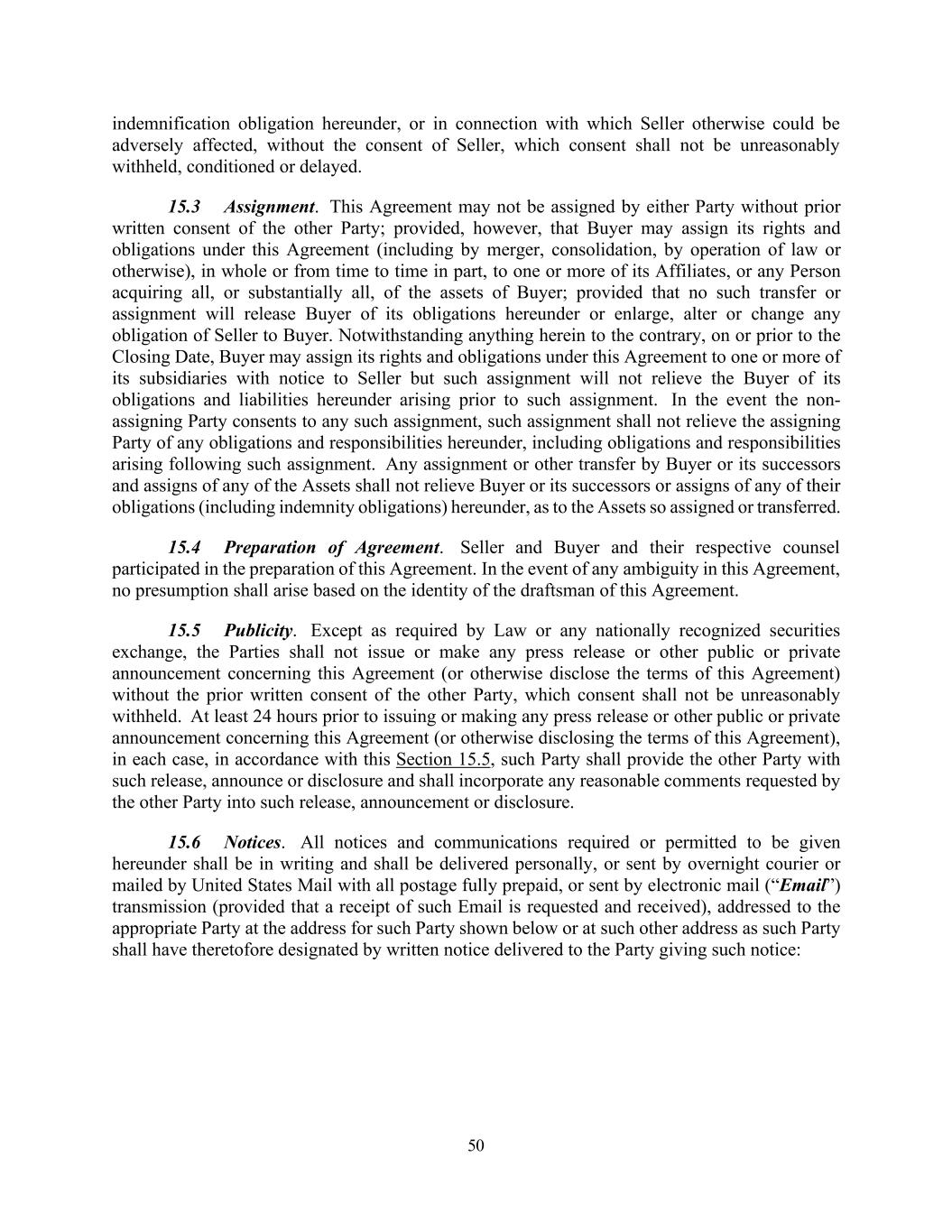 50 indemnification obligation hereunder, or in connection with which Seller otherwise could be adversely affected, without the consent of Seller, which consent shall not be unreasonably withheld, conditioned or delayed. 15.3 Assignment. This Agreement may not be assigned by either Party without prior written consent of the other Party; provided, however, that Buyer may assign its rights and obligations under this Agreement (including by merger, consolidation, by operation of law or otherwise), in whole or from time to time in part, to one or more of its Affiliates, or any Person acquiring all, or substantially all, of the assets of Buyer; provided that no such transfer or assignment will release Buyer of its obligations hereunder or enlarge, alter or change any obligation of Seller to Buyer. Notwithstanding anything herein to the contrary, on or prior to the Closing Date, Buyer may assign its rights and obligations under this Agreement to one or more of its subsidiaries with notice to Seller but such assignment will not relieve the Buyer of its obligations and liabilities hereunder arising prior to such assignment. In the event the non- assigning Party consents to any such assignment, such assignment shall not relieve the assigning Party of any obligations and responsibilities hereunder, including obligations and responsibilities arising following such assignment. Any assignment or other transfer by Buyer or its successors and assigns of any of the Assets shall not relieve Buyer or its successors or assigns of any of their obligations (including indemnity obligations) hereunder, as to the Assets so assigned or transferred. 15.4 Preparation of Agreement. Seller and Buyer and their respective counsel participated in the preparation of this Agreement. In the event of any ambiguity in this Agreement, no presumption shall arise based on the identity of the draftsman of this Agreement. 15.5 Publicity. Except as required by Law or any nationally recognized securities exchange, the Parties shall not issue or make any press release or other public or private announcement concerning this Agreement (or otherwise disclose the terms of this Agreement) without the prior written consent of the other Party, which consent shall not be unreasonably withheld. At least 24 hours prior to issuing or making any press release or other public or private announcement concerning this Agreement (or otherwise disclosing the terms of this Agreement), in each case, in accordance with this Section 15.5, such Party shall provide the other Party with such release, announce or disclosure and shall incorporate any reasonable comments requested by the other Party into such release, announcement or disclosure. 15.6 Notices. All notices and communications required or permitted to be given hereunder shall be in writing and shall be delivered personally, or sent by overnight courier or mailed by United States Mail with all postage fully prepaid, or sent by electronic mail (“Email”) transmission (provided that a receipt of such Email is requested and received), addressed to the appropriate Party at the address for such Party shown below or at such other address as such Party shall have theretofore designated by written notice delivered to the Party giving such notice: