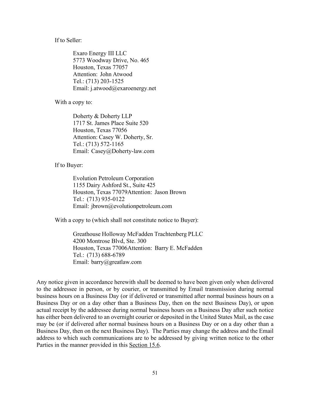 51 If to Seller: Exaro Energy III LLC 5773 Woodway Drive, No. 465 Houston, Texas 77057 Attention: John Atwood Tel.: (713) 203-1525 Email: j.atwood@exaroenergy.net With a copy to: Doherty & Doherty LLP 1717 St. James Place Suite 520 Houston, Texas 77056 Attention: Casey W. Doherty, Sr. Tel.: (713) 572-1165 Email: Casey@Doherty-law.com If to Buyer: Evolution Petroleum Corporation 1155 Dairy Ashford St., Suite 425 Houston, Texas 77079Attention: Jason Brown Tel.: (713) 935-0122 Email: jbrown@evolutionpetroleum.com With a copy to (which shall not constitute notice to Buyer): Greathouse Holloway McFadden Trachtenberg PLLC 4200 Montrose Blvd, Ste. 300 Houston, Texas 77006Attention: Barry E. McFadden Tel.: (713) 688-6789 Email: barry@greatlaw.com Any notice given in accordance herewith shall be deemed to have been given only when delivered to the addressee in person, or by courier, or transmitted by Email transmission during normal business hours on a Business Day (or if delivered or transmitted after normal business hours on a Business Day or on a day other than a Business Day, then on the next Business Day), or upon actual receipt by the addressee during normal business hours on a Business Day after such notice has either been delivered to an overnight courier or deposited in the United States Mail, as the case may be (or if delivered after normal business hours on a Business Day or on a day other than a Business Day, then on the next Business Day). The Parties may change the address and the Email address to which such communications are to be addressed by giving written notice to the other Parties in the manner provided in this Section 15.6.