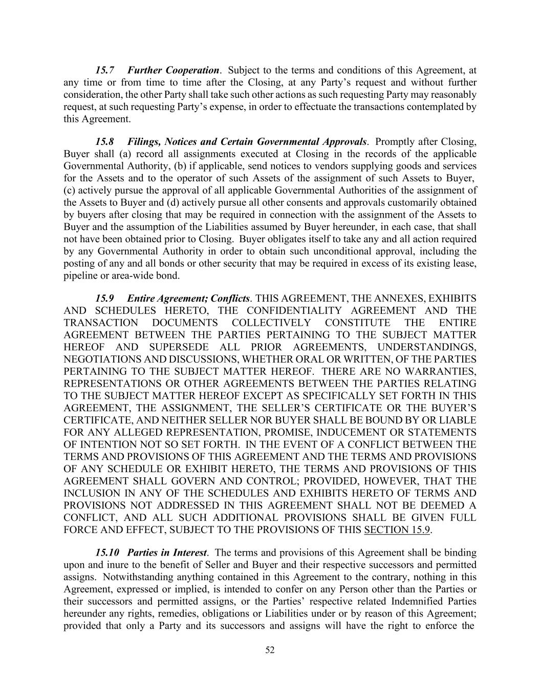 52 15.7 Further Cooperation. Subject to the terms and conditions of this Agreement, at any time or from time to time after the Closing, at any Party’s request and without further consideration, the other Party shall take such other actions as such requesting Party may reasonably request, at such requesting Party’s expense, in order to effectuate the transactions contemplated by this Agreement. 15.8 Filings, Notices and Certain Governmental Approvals. Promptly after Closing, Buyer shall (a) record all assignments executed at Closing in the records of the applicable Governmental Authority, (b) if applicable, send notices to vendors supplying goods and services for the Assets and to the operator of such Assets of the assignment of such Assets to Buyer, (c) actively pursue the approval of all applicable Governmental Authorities of the assignment of the Assets to Buyer and (d) actively pursue all other consents and approvals customarily obtained by buyers after closing that may be required in connection with the assignment of the Assets to Buyer and the assumption of the Liabilities assumed by Buyer hereunder, in each case, that shall not have been obtained prior to Closing. Buyer obligates itself to take any and all action required by any Governmental Authority in order to obtain such unconditional approval, including the posting of any and all bonds or other security that may be required in excess of its existing lease, pipeline or area-wide bond. 15.9 Entire Agreement; Conflicts. THIS AGREEMENT, THE ANNEXES, EXHIBITS AND SCHEDULES HERETO, THE CONFIDENTIALITY AGREEMENT AND THE TRANSACTION DOCUMENTS COLLECTIVELY CONSTITUTE THE ENTIRE AGREEMENT BETWEEN THE PARTIES PERTAINING TO THE SUBJECT MATTER HEREOF AND SUPERSEDE ALL PRIOR AGREEMENTS, UNDERSTANDINGS, NEGOTIATIONS AND DISCUSSIONS, WHETHER ORAL OR WRITTEN, OF THE PARTIES PERTAINING TO THE SUBJECT MATTER HEREOF. THERE ARE NO WARRANTIES, REPRESENTATIONS OR OTHER AGREEMENTS BETWEEN THE PARTIES RELATING TO THE SUBJECT MATTER HEREOF EXCEPT AS SPECIFICALLY SET FORTH IN THIS AGREEMENT, THE ASSIGNMENT, THE SELLER’S CERTIFICATE OR THE BUYER’S CERTIFICATE, AND NEITHER SELLER NOR BUYER SHALL BE BOUND BY OR LIABLE FOR ANY ALLEGED REPRESENTATION, PROMISE, INDUCEMENT OR STATEMENTS OF INTENTION NOT SO SET FORTH. IN THE EVENT OF A CONFLICT BETWEEN THE TERMS AND PROVISIONS OF THIS AGREEMENT AND THE TERMS AND PROVISIONS OF ANY SCHEDULE OR EXHIBIT HERETO, THE TERMS AND PROVISIONS OF THIS AGREEMENT SHALL GOVERN AND CONTROL; PROVIDED, HOWEVER, THAT THE INCLUSION IN ANY OF THE SCHEDULES AND EXHIBITS HERETO OF TERMS AND PROVISIONS NOT ADDRESSED IN THIS AGREEMENT SHALL NOT BE DEEMED A CONFLICT, AND ALL SUCH ADDITIONAL PROVISIONS SHALL BE GIVEN FULL FORCE AND EFFECT, SUBJECT TO THE PROVISIONS OF THIS SECTION 15.9. 15.10 Parties in Interest. The terms and provisions of this Agreement shall be binding upon and inure to the benefit of Seller and Buyer and their respective successors and permitted assigns. Notwithstanding anything contained in this Agreement to the contrary, nothing in this Agreement, expressed or implied, is intended to confer on any Person other than the Parties or their successors and permitted assigns, or the Parties’ respective related Indemnified Parties hereunder any rights, remedies, obligations or Liabilities under or by reason of this Agreement; provided that only a Party and its successors and assigns will have the right to enforce the