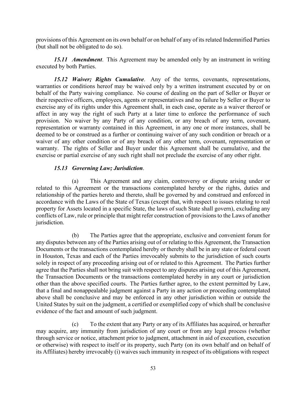 53 provisions of this Agreement on its own behalf or on behalf of any of its related Indemnified Parties (but shall not be obligated to do so). 15.11 Amendment. This Agreement may be amended only by an instrument in writing executed by both Parties. 15.12 Waiver; Rights Cumulative. Any of the terms, covenants, representations, warranties or conditions hereof may be waived only by a written instrument executed by or on behalf of the Party waiving compliance. No course of dealing on the part of Seller or Buyer or their respective officers, employees, agents or representatives and no failure by Seller or Buyer to exercise any of its rights under this Agreement shall, in each case, operate as a waiver thereof or affect in any way the right of such Party at a later time to enforce the performance of such provision. No waiver by any Party of any condition, or any breach of any term, covenant, representation or warranty contained in this Agreement, in any one or more instances, shall be deemed to be or construed as a further or continuing waiver of any such condition or breach or a waiver of any other condition or of any breach of any other term, covenant, representation or warranty. The rights of Seller and Buyer under this Agreement shall be cumulative, and the exercise or partial exercise of any such right shall not preclude the exercise of any other right. 15.13 Governing Law; Jurisdiction. (a) This Agreement and any claim, controversy or dispute arising under or related to this Agreement or the transactions contemplated hereby or the rights, duties and relationship of the parties hereto and thereto, shall be governed by and construed and enforced in accordance with the Laws of the State of Texas (except that, with respect to issues relating to real property for Assets located in a specific State, the laws of such State shall govern), excluding any conflicts of Law, rule or principle that might refer construction of provisions to the Laws of another jurisdiction. (b) The Parties agree that the appropriate, exclusive and convenient forum for any disputes between any of the Parties arising out of or relating to this Agreement, the Transaction Documents or the transactions contemplated hereby or thereby shall be in any state or federal court in Houston, Texas and each of the Parties irrevocably submits to the jurisdiction of such courts solely in respect of any proceeding arising out of or related to this Agreement. The Parties further agree that the Parties shall not bring suit with respect to any disputes arising out of this Agreement, the Transaction Documents or the transactions contemplated hereby in any court or jurisdiction other than the above specified courts. The Parties further agree, to the extent permitted by Law, that a final and nonappealable judgment against a Party in any action or proceeding contemplated above shall be conclusive and may be enforced in any other jurisdiction within or outside the United States by suit on the judgment, a certified or exemplified copy of which shall be conclusive evidence of the fact and amount of such judgment. (c) To the extent that any Party or any of its Affiliates has acquired, or hereafter may acquire, any immunity from jurisdiction of any court or from any legal process (whether through service or notice, attachment prior to judgment, attachment in aid of execution, execution or otherwise) with respect to itself or its property, such Party (on its own behalf and on behalf of its Affiliates) hereby irrevocably (i) waives such immunity in respect of its obligations with respect