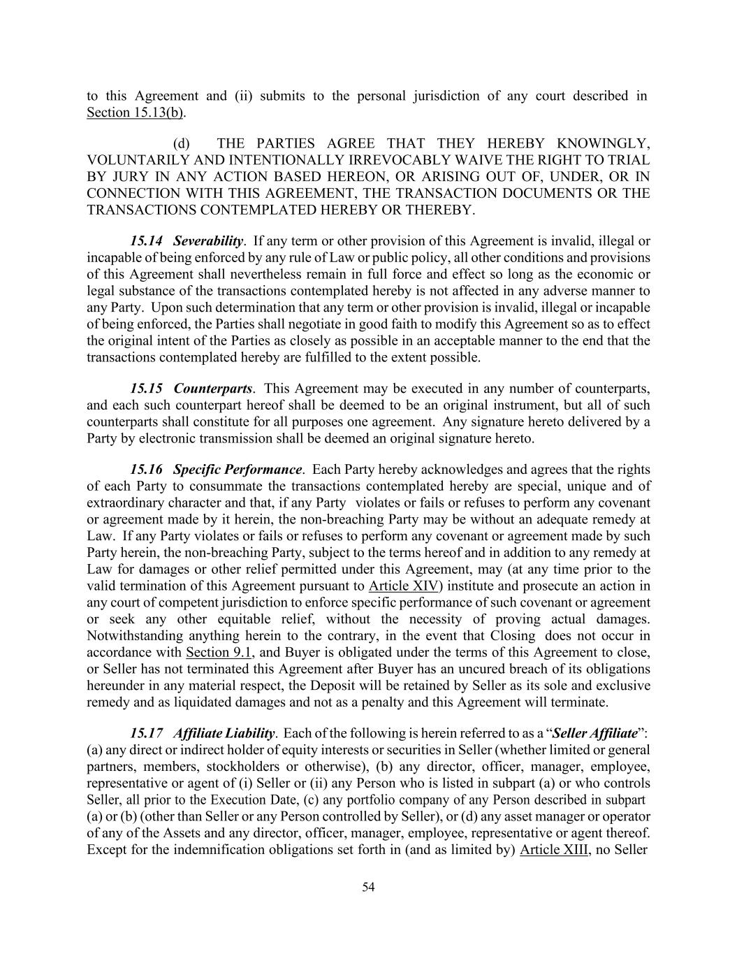 54 to this Agreement and (ii) submits to the personal jurisdiction of any court described in Section 15.13(b). (d) THE PARTIES AGREE THAT THEY HEREBY KNOWINGLY, VOLUNTARILY AND INTENTIONALLY IRREVOCABLY WAIVE THE RIGHT TO TRIAL BY JURY IN ANY ACTION BASED HEREON, OR ARISING OUT OF, UNDER, OR IN CONNECTION WITH THIS AGREEMENT, THE TRANSACTION DOCUMENTS OR THE TRANSACTIONS CONTEMPLATED HEREBY OR THEREBY. 15.14 Severability. If any term or other provision of this Agreement is invalid, illegal or incapable of being enforced by any rule of Law or public policy, all other conditions and provisions of this Agreement shall nevertheless remain in full force and effect so long as the economic or legal substance of the transactions contemplated hereby is not affected in any adverse manner to any Party. Upon such determination that any term or other provision is invalid, illegal or incapable of being enforced, the Parties shall negotiate in good faith to modify this Agreement so as to effect the original intent of the Parties as closely as possible in an acceptable manner to the end that the transactions contemplated hereby are fulfilled to the extent possible. 15.15 Counterparts. This Agreement may be executed in any number of counterparts, and each such counterpart hereof shall be deemed to be an original instrument, but all of such counterparts shall constitute for all purposes one agreement. Any signature hereto delivered by a Party by electronic transmission shall be deemed an original signature hereto. 15.16 Specific Performance. Each Party hereby acknowledges and agrees that the rights of each Party to consummate the transactions contemplated hereby are special, unique and of extraordinary character and that, if any Party violates or fails or refuses to perform any covenant or agreement made by it herein, the non-breaching Party may be without an adequate remedy at Law. If any Party violates or fails or refuses to perform any covenant or agreement made by such Party herein, the non-breaching Party, subject to the terms hereof and in addition to any remedy at Law for damages or other relief permitted under this Agreement, may (at any time prior to the valid termination of this Agreement pursuant to Article XIV) institute and prosecute an action in any court of competent jurisdiction to enforce specific performance of such covenant or agreement or seek any other equitable relief, without the necessity of proving actual damages. Notwithstanding anything herein to the contrary, in the event that Closing does not occur in accordance with Section 9.1, and Buyer is obligated under the terms of this Agreement to close, or Seller has not terminated this Agreement after Buyer has an uncured breach of its obligations hereunder in any material respect, the Deposit will be retained by Seller as its sole and exclusive remedy and as liquidated damages and not as a penalty and this Agreement will terminate. 15.17 Affiliate Liability. Each of the following is herein referred to as a “Seller Affiliate”: (a) any direct or indirect holder of equity interests or securities in Seller (whether limited or general partners, members, stockholders or otherwise), (b) any director, officer, manager, employee, representative or agent of (i) Seller or (ii) any Person who is listed in subpart (a) or who controls Seller, all prior to the Execution Date, (c) any portfolio company of any Person described in subpart (a) or (b) (other than Seller or any Person controlled by Seller), or (d) any asset manager or operator of any of the Assets and any director, officer, manager, employee, representative or agent thereof. Except for the indemnification obligations set forth in (and as limited by) Article XIII, no Seller