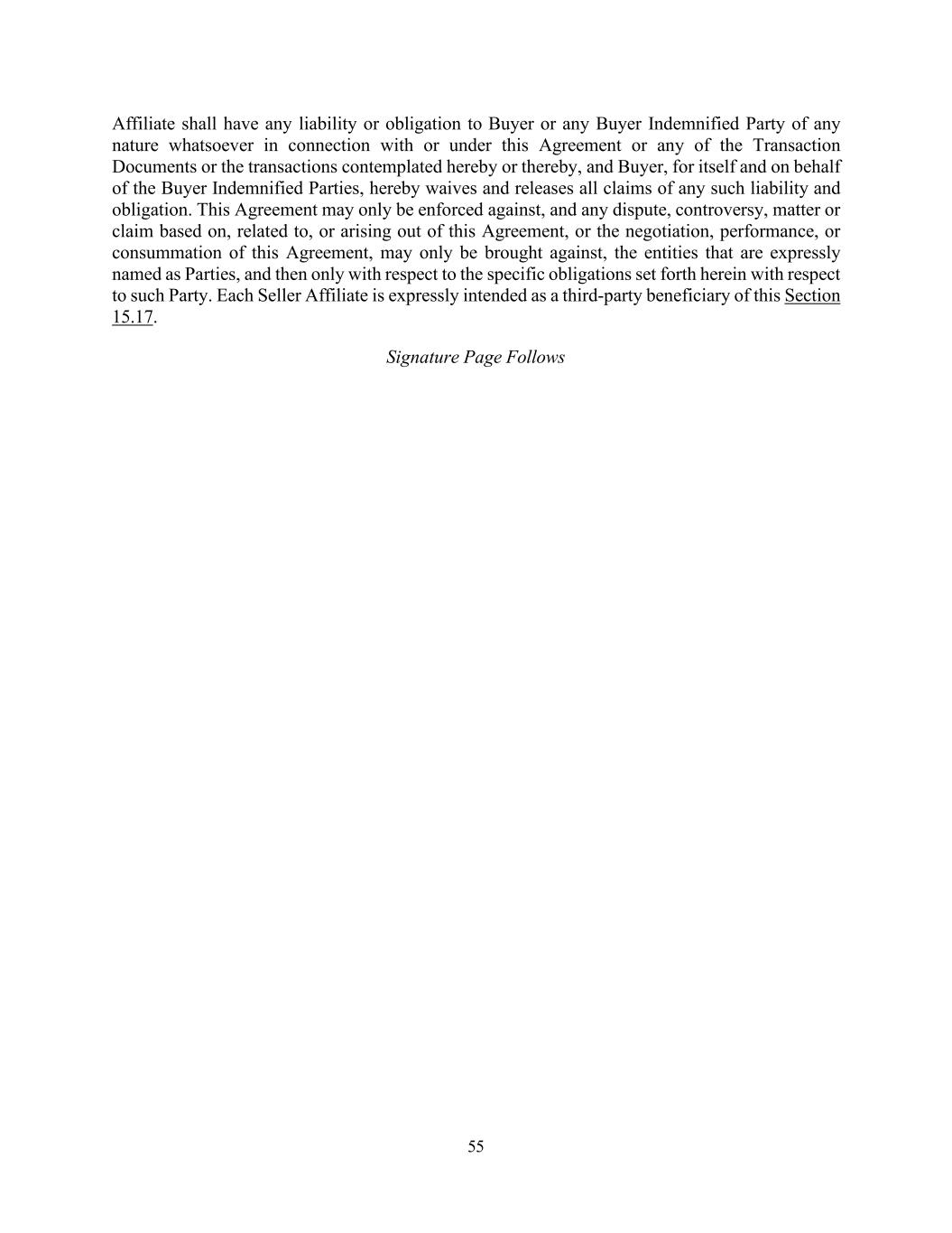 55 Affiliate shall have any liability or obligation to Buyer or any Buyer Indemnified Party of any nature whatsoever in connection with or under this Agreement or any of the Transaction Documents or the transactions contemplated hereby or thereby, and Buyer, for itself and on behalf of the Buyer Indemnified Parties, hereby waives and releases all claims of any such liability and obligation. This Agreement may only be enforced against, and any dispute, controversy, matter or claim based on, related to, or arising out of this Agreement, or the negotiation, performance, or consummation of this Agreement, may only be brought against, the entities that are expressly named as Parties, and then only with respect to the specific obligations set forth herein with respect to such Party. Each Seller Affiliate is expressly intended as a third-party beneficiary of this Section 15.17. Signature Page Follows