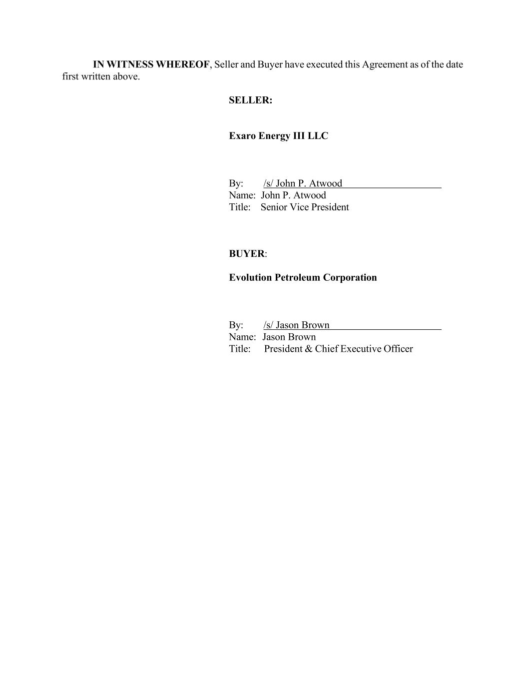 IN WITNESS WHEREOF, Seller and Buyer have executed this Agreement as of the date first written above. SELLER: Exaro Energy III LLC By: /s/ John P. Atwood Name: John P. Atwood Title: Senior Vice President BUYER: Evolution Petroleum Corporation By: /s/ Jason Brown Name: Jason Brown Title: President & Chief Executive Officer
