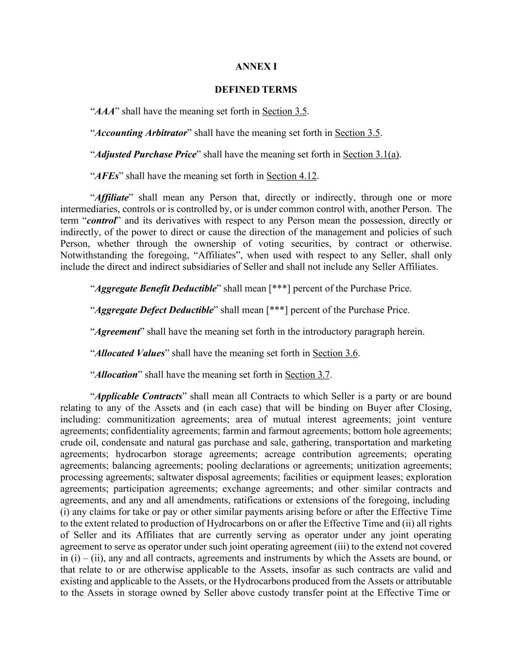 ANNEX I DEFINED TERMS “AAA” shall have the meaning set forth in Section 3.5. “Accounting Arbitrator” shall have the meaning set forth in Section 3.5. “Adjusted Purchase Price” shall have the meaning set forth in Section 3.1(a). “AFEs” shall have the meaning set forth in Section 4.12. “Affiliate” shall mean any Person that, directly or indirectly, through one or more intermediaries, controls or is controlled by, or is under common control with, another Person. The term “control” and its derivatives with respect to any Person mean the possession, directly or indirectly, of the power to direct or cause the direction of the management and policies of such Person, whether through the ownership of voting securities, by contract or otherwise. Notwithstanding the foregoing, “Affiliates”, when used with respect to any Seller, shall only include the direct and indirect subsidiaries of Seller and shall not include any Seller Affiliates. “Aggregate Benefit Deductible” shall mean [***] percent of the Purchase Price. “Aggregate Defect Deductible” shall mean [***] percent of the Purchase Price. “Agreement” shall have the meaning set forth in the introductory paragraph herein. “Allocated Values” shall have the meaning set forth in Section 3.6. “Allocation” shall have the meaning set forth in Section 3.7. “Applicable Contracts” shall mean all Contracts to which Seller is a party or are bound relating to any of the Assets and (in each case) that will be binding on Buyer after Closing, including: communitization agreements; area of mutual interest agreements; joint venture agreements; confidentiality agreements; farmin and farmout agreements; bottom hole agreements; crude oil, condensate and natural gas purchase and sale, gathering, transportation and marketing agreements; hydrocarbon storage agreements; acreage contribution agreements; operating agreements; balancing agreements; pooling declarations or agreements; unitization agreements; processing agreements; saltwater disposal agreements; facilities or equipment leases; exploration agreements; participation agreements; exchange agreements; and other similar contracts and agreements, and any and all amendments, ratifications or extensions of the foregoing, including (i) any claims for take or pay or other similar payments arising before or after the Effective Time to the extent related to production of Hydrocarbons on or after the Effective Time and (ii) all rights of Seller and its Affiliates that are currently serving as operator under any joint operating agreement to serve as operator under such joint operating agreement (iii) to the extend not covered in (i) – (ii), any and all contracts, agreements and instruments by which the Assets are bound, or that relate to or are otherwise applicable to the Assets, insofar as such contracts are valid and existing and applicable to the Assets, or the Hydrocarbons produced from the Assets or attributable to the Assets in storage owned by Seller above custody transfer point at the Effective Time or