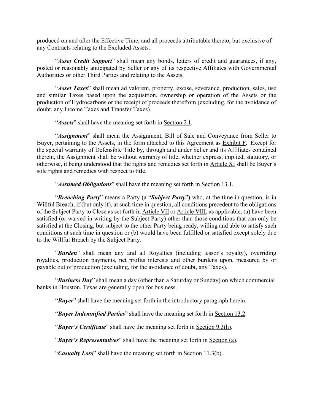 produced on and after the Effective Time, and all proceeds attributable thereto, but exclusive of any Contracts relating to the Excluded Assets. “Asset Credit Support” shall mean any bonds, letters of credit and guarantees, if any, posted or reasonably anticipated by Seller or any of its respective Affiliates with Governmental Authorities or other Third Parties and relating to the Assets. “Asset Taxes” shall mean ad valorem, property, excise, severance, production, sales, use and similar Taxes based upon the acquisition, ownership or operation of the Assets or the production of Hydrocarbons or the receipt of proceeds therefrom (excluding, for the avoidance of doubt, any Income Taxes and Transfer Taxes). “Assets” shall have the meaning set forth in Section 2.1. “Assignment” shall mean the Assignment, Bill of Sale and Conveyance from Seller to Buyer, pertaining to the Assets, in the form attached to this Agreement as Exhibit F. Except for the special warranty of Defensible Title by, through and under Seller and its Affiliates contained therein, the Assignment shall be without warranty of title, whether express, implied, statutory, or otherwise, it being understood that the rights and remedies set forth in Article XI shall be Buyer’s sole rights and remedies with respect to title. “Assumed Obligations” shall have the meaning set forth in Section 13.1. “Breaching Party” means a Party (a “Subject Party”) who, at the time in question, is in Willful Breach, if (but only if), at such time in question, all conditions precedent to the obligations of the Subject Party to Close as set forth in Article VII or Article VIII, as applicable, (a) have been satisfied (or waived in writing by the Subject Party) other than those conditions that can only be satisfied at the Closing, but subject to the other Party being ready, willing and able to satisfy such conditions at such time in question or (b) would have been fulfilled or satisfied except solely due to the Willful Breach by the Subject Party. “Burden” shall mean any and all Royalties (including lessor’s royalty), overriding royalties, production payments, net profits interests and other burdens upon, measured by or payable out of production (excluding, for the avoidance of doubt, any Taxes). “Business Day” shall mean a day (other than a Saturday or Sunday) on which commercial banks in Houston, Texas are generally open for business. “Buyer” shall have the meaning set forth in the introductory paragraph herein. “Buyer Indemnified Parties” shall have the meaning set forth in Section 13.2. “Buyer’s Certificate” shall have the meaning set forth in Section 9.3(h). “Buyer’s Representatives” shall have the meaning set forth in Section (a). “Casualty Loss” shall have the meaning set forth in Section 11.3(b).