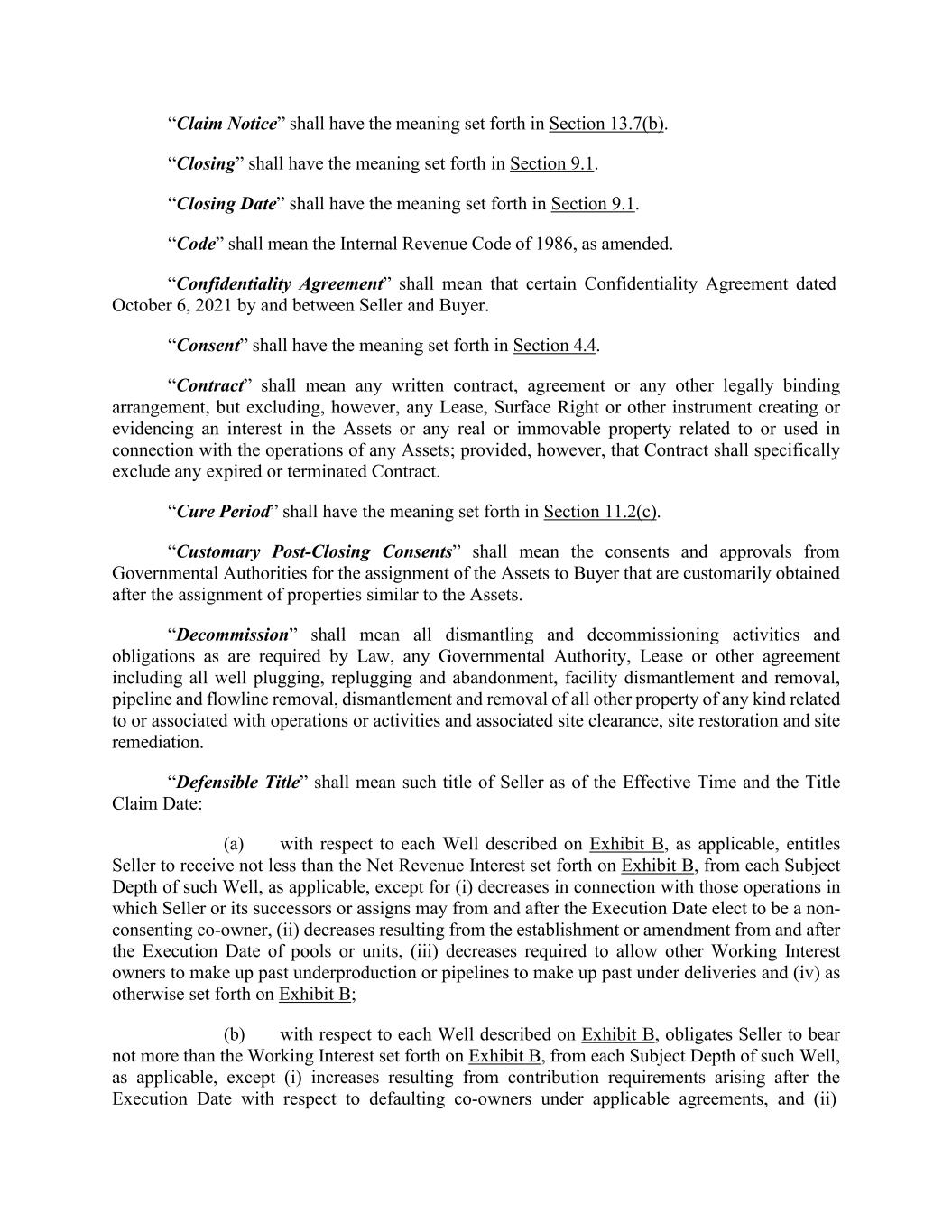 “Claim Notice” shall have the meaning set forth in Section 13.7(b). “Closing” shall have the meaning set forth in Section 9.1. “Closing Date” shall have the meaning set forth in Section 9.1. “Code” shall mean the Internal Revenue Code of 1986, as amended. “Confidentiality Agreement” shall mean that certain Confidentiality Agreement dated October 6, 2021 by and between Seller and Buyer. “Consent” shall have the meaning set forth in Section 4.4. “Contract” shall mean any written contract, agreement or any other legally binding arrangement, but excluding, however, any Lease, Surface Right or other instrument creating or evidencing an interest in the Assets or any real or immovable property related to or used in connection with the operations of any Assets; provided, however, that Contract shall specifically exclude any expired or terminated Contract. “Cure Period” shall have the meaning set forth in Section 11.2(c). “Customary Post-Closing Consents” shall mean the consents and approvals from Governmental Authorities for the assignment of the Assets to Buyer that are customarily obtained after the assignment of properties similar to the Assets. “Decommission” shall mean all dismantling and decommissioning activities and obligations as are required by Law, any Governmental Authority, Lease or other agreement including all well plugging, replugging and abandonment, facility dismantlement and removal, pipeline and flowline removal, dismantlement and removal of all other property of any kind related to or associated with operations or activities and associated site clearance, site restoration and site remediation. “Defensible Title” shall mean such title of Seller as of the Effective Time and the Title Claim Date: (a) with respect to each Well described on Exhibit B, as applicable, entitles Seller to receive not less than the Net Revenue Interest set forth on Exhibit B, from each Subject Depth of such Well, as applicable, except for (i) decreases in connection with those operations in which Seller or its successors or assigns may from and after the Execution Date elect to be a non- consenting co-owner, (ii) decreases resulting from the establishment or amendment from and after the Execution Date of pools or units, (iii) decreases required to allow other Working Interest owners to make up past underproduction or pipelines to make up past under deliveries and (iv) as otherwise set forth on Exhibit B; (b) with respect to each Well described on Exhibit B, obligates Seller to bear not more than the Working Interest set forth on Exhibit B, from each Subject Depth of such Well, as applicable, except (i) increases resulting from contribution requirements arising after the Execution Date with respect to defaulting co-owners under applicable agreements, and (ii)