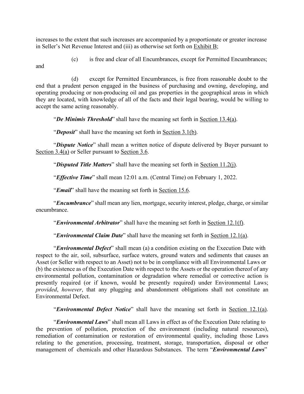 increases to the extent that such increases are accompanied by a proportionate or greater increase in Seller’s Net Revenue Interest and (iii) as otherwise set forth on Exhibit B; (c) is free and clear of all Encumbrances, except for Permitted Encumbrances; and (d) except for Permitted Encumbrances, is free from reasonable doubt to the end that a prudent person engaged in the business of purchasing and owning, developing, and operating producing or non-producing oil and gas properties in the geographical areas in which they are located, with knowledge of all of the facts and their legal bearing, would be willing to accept the same acting reasonably. “De Minimis Threshold” shall have the meaning set forth in Section 13.4(a). “Deposit” shall have the meaning set forth in Section 3.1(b). “Dispute Notice” shall mean a written notice of dispute delivered by Buyer pursuant to Section 3.4(a) or Seller pursuant to Section 3.6. “Disputed Title Matters” shall have the meaning set forth in Section 11.2(j). “Effective Time” shall mean 12:01 a.m. (Central Time) on February 1, 2022. “Email” shall have the meaning set forth in Section 15.6. “Encumbrance” shall mean any lien, mortgage, security interest, pledge, charge, or similar encumbrance. “Environmental Arbitrator” shall have the meaning set forth in Section 12.1(f). “Environmental Claim Date” shall have the meaning set forth in Section 12.1(a). “Environmental Defect” shall mean (a) a condition existing on the Execution Date with respect to the air, soil, subsurface, surface waters, ground waters and sediments that causes an Asset (or Seller with respect to an Asset) not to be in compliance with all Environmental Laws or (b) the existence as of the Execution Date with respect to the Assets or the operation thereof of any environmental pollution, contamination or degradation where remedial or corrective action is presently required (or if known, would be presently required) under Environmental Laws; provided, however, that any plugging and abandonment obligations shall not constitute an Environmental Defect. “Environmental Defect Notice” shall have the meaning set forth in Section 12.1(a). “Environmental Laws” shall mean all Laws in effect as of the Execution Date relating to the prevention of pollution, protection of the environment (including natural resources), remediation of contamination or restoration of environmental quality, including those Laws relating to the generation, processing, treatment, storage, transportation, disposal or other management of chemicals and other Hazardous Substances. The term “Environmental Laws”