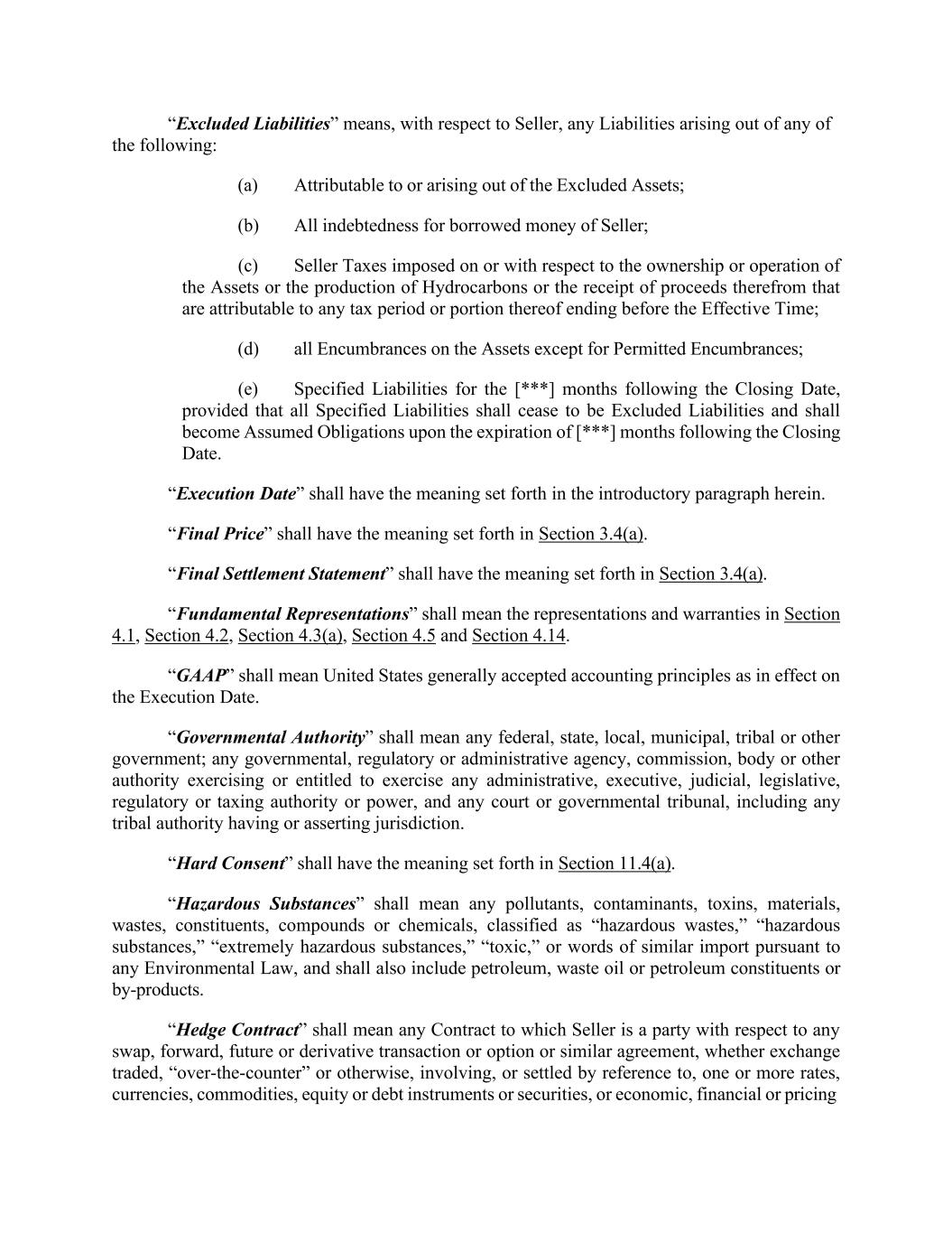 “Excluded Liabilities” means, with respect to Seller, any Liabilities arising out of any of the following: (a) Attributable to or arising out of the Excluded Assets; (b) All indebtedness for borrowed money of Seller; (c) Seller Taxes imposed on or with respect to the ownership or operation of the Assets or the production of Hydrocarbons or the receipt of proceeds therefrom that are attributable to any tax period or portion thereof ending before the Effective Time; (d) all Encumbrances on the Assets except for Permitted Encumbrances; (e) Specified Liabilities for the [***] months following the Closing Date, provided that all Specified Liabilities shall cease to be Excluded Liabilities and shall become Assumed Obligations upon the expiration of [***] months following the Closing Date. “Execution Date” shall have the meaning set forth in the introductory paragraph herein. “Final Price” shall have the meaning set forth in Section 3.4(a). “Final Settlement Statement” shall have the meaning set forth in Section 3.4(a). “Fundamental Representations” shall mean the representations and warranties in Section 4.1, Section 4.2, Section 4.3(a), Section 4.5 and Section 4.14. “GAAP” shall mean United States generally accepted accounting principles as in effect on the Execution Date. “Governmental Authority” shall mean any federal, state, local, municipal, tribal or other government; any governmental, regulatory or administrative agency, commission, body or other authority exercising or entitled to exercise any administrative, executive, judicial, legislative, regulatory or taxing authority or power, and any court or governmental tribunal, including any tribal authority having or asserting jurisdiction. “Hard Consent” shall have the meaning set forth in Section 11.4(a). “Hazardous Substances” shall mean any pollutants, contaminants, toxins, materials, wastes, constituents, compounds or chemicals, classified as “hazardous wastes,” “hazardous substances,” “extremely hazardous substances,” “toxic,” or words of similar import pursuant to any Environmental Law, and shall also include petroleum, waste oil or petroleum constituents or by-products. “Hedge Contract” shall mean any Contract to which Seller is a party with respect to any swap, forward, future or derivative transaction or option or similar agreement, whether exchange traded, “over-the-counter” or otherwise, involving, or settled by reference to, one or more rates, currencies, commodities, equity or debt instruments or securities, or economic, financial or pricing