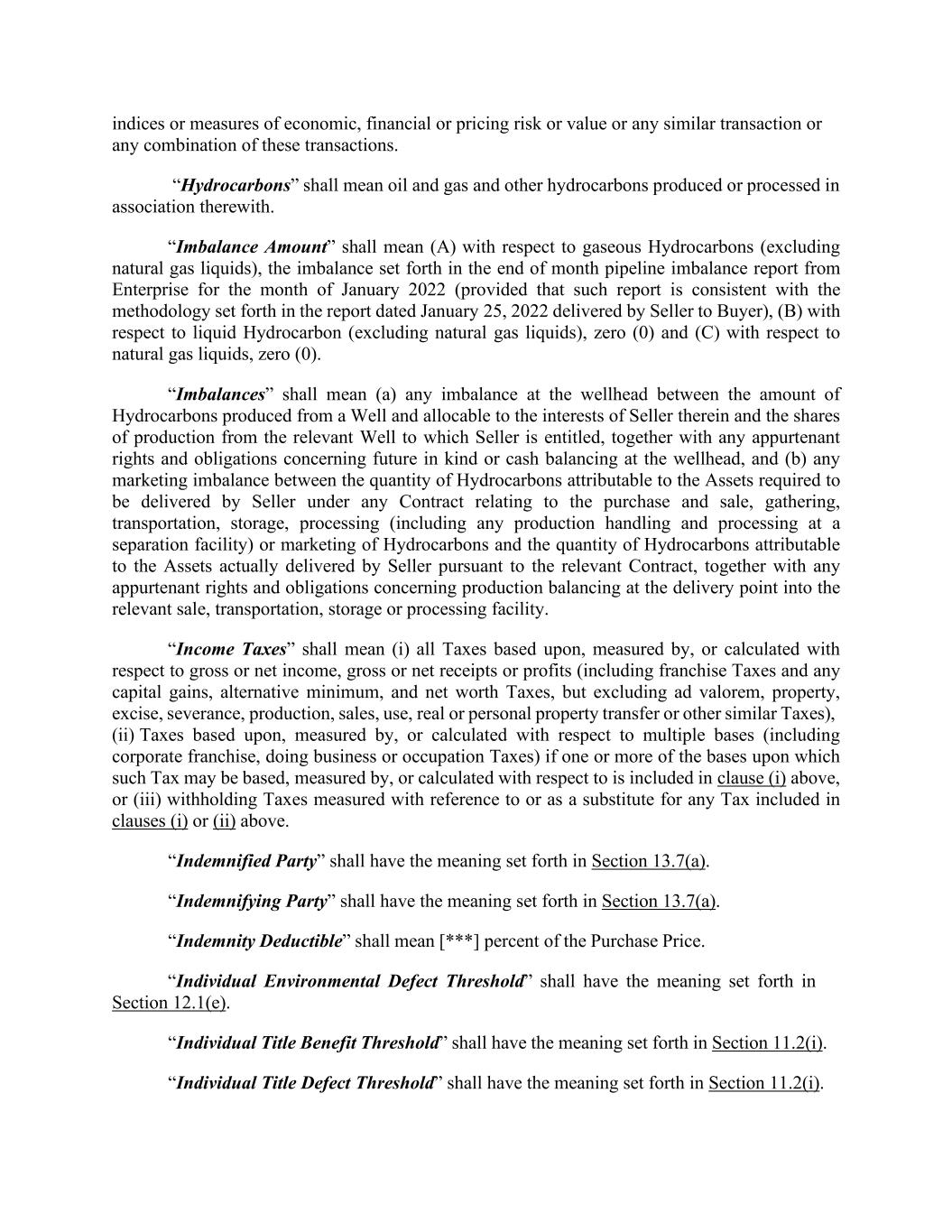 indices or measures of economic, financial or pricing risk or value or any similar transaction or any combination of these transactions. “Hydrocarbons” shall mean oil and gas and other hydrocarbons produced or processed in association therewith. “Imbalance Amount” shall mean (A) with respect to gaseous Hydrocarbons (excluding natural gas liquids), the imbalance set forth in the end of month pipeline imbalance report from Enterprise for the month of January 2022 (provided that such report is consistent with the methodology set forth in the report dated January 25, 2022 delivered by Seller to Buyer), (B) with respect to liquid Hydrocarbon (excluding natural gas liquids), zero (0) and (C) with respect to natural gas liquids, zero (0). “Imbalances” shall mean (a) any imbalance at the wellhead between the amount of Hydrocarbons produced from a Well and allocable to the interests of Seller therein and the shares of production from the relevant Well to which Seller is entitled, together with any appurtenant rights and obligations concerning future in kind or cash balancing at the wellhead, and (b) any marketing imbalance between the quantity of Hydrocarbons attributable to the Assets required to be delivered by Seller under any Contract relating to the purchase and sale, gathering, transportation, storage, processing (including any production handling and processing at a separation facility) or marketing of Hydrocarbons and the quantity of Hydrocarbons attributable to the Assets actually delivered by Seller pursuant to the relevant Contract, together with any appurtenant rights and obligations concerning production balancing at the delivery point into the relevant sale, transportation, storage or processing facility. “Income Taxes” shall mean (i) all Taxes based upon, measured by, or calculated with respect to gross or net income, gross or net receipts or profits (including franchise Taxes and any capital gains, alternative minimum, and net worth Taxes, but excluding ad valorem, property, excise, severance, production, sales, use, real or personal property transfer or other similar Taxes), (ii) Taxes based upon, measured by, or calculated with respect to multiple bases (including corporate franchise, doing business or occupation Taxes) if one or more of the bases upon which such Tax may be based, measured by, or calculated with respect to is included in clause (i) above, or (iii) withholding Taxes measured with reference to or as a substitute for any Tax included in clauses (i) or (ii) above. “Indemnified Party” shall have the meaning set forth in Section 13.7(a). “Indemnifying Party” shall have the meaning set forth in Section 13.7(a). “Indemnity Deductible” shall mean [***] percent of the Purchase Price. “Individual Environmental Defect Threshold” shall have the meaning set forth in Section 12.1(e). “Individual Title Benefit Threshold” shall have the meaning set forth in Section 11.2(i). “Individual Title Defect Threshold” shall have the meaning set forth in Section 11.2(i).