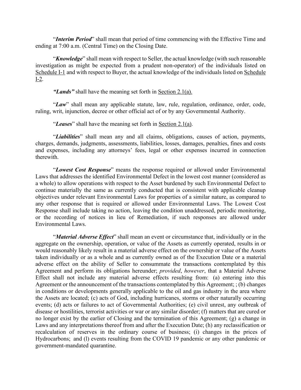 “Interim Period” shall mean that period of time commencing with the Effective Time and ending at 7:00 a.m. (Central Time) on the Closing Date. “Knowledge” shall mean with respect to Seller, the actual knowledge (with such reasonable investigation as might be expected from a prudent non-operator) of the individuals listed on Schedule I-1 and with respect to Buyer, the actual knowledge of the individuals listed on Schedule I-2. “Lands” shall have the meaning set forth in Section 2.1(a). “Law” shall mean any applicable statute, law, rule, regulation, ordinance, order, code, ruling, writ, injunction, decree or other official act of or by any Governmental Authority. “Leases” shall have the meaning set forth in Section 2.1(a). “Liabilities” shall mean any and all claims, obligations, causes of action, payments, charges, demands, judgments, assessments, liabilities, losses, damages, penalties, fines and costs and expenses, including any attorneys’ fees, legal or other expenses incurred in connection therewith. “Lowest Cost Response” means the response required or allowed under Environmental Laws that addresses the identified Environmental Defect in the lowest cost manner (considered as a whole) to allow operations with respect to the Asset burdened by such Environmental Defect to continue materially the same as currently conducted that is consistent with applicable cleanup objectives under relevant Environmental Laws for properties of a similar nature, as compared to any other response that is required or allowed under Environmental Laws. The Lowest Cost Response shall include taking no action, leaving the condition unaddressed, periodic monitoring, or the recording of notices in lieu of Remediation, if such responses are allowed under Environmental Laws. “Material Adverse Effect” shall mean an event or circumstance that, individually or in the aggregate on the ownership, operation, or value of the Assets as currently operated, results in or would reasonably likely result in a material adverse effect on the ownership or value of the Assets taken individually or as a whole and as currently owned as of the Execution Date or a material adverse effect on the ability of Seller to consummate the transactions contemplated by this Agreement and perform its obligations hereunder; provided, however, that a Material Adverse Effect shall not include any material adverse effects resulting from: (a) entering into this Agreement or the announcement of the transactions contemplated by this Agreement; ; (b) changes in conditions or developments generally applicable to the oil and gas industry in the area where the Assets are located; (c) acts of God, including hurricanes, storms or other naturally occurring events; (d) acts or failures to act of Governmental Authorities; (e) civil unrest, any outbreak of disease or hostilities, terrorist activities or war or any similar disorder; (f) matters that are cured or no longer exist by the earlier of Closing and the termination of this Agreement; (g) a change in Laws and any interpretations thereof from and after the Execution Date; (h) any reclassification or recalculation of reserves in the ordinary course of business; (i) changes in the prices of Hydrocarbons; and (l) events resulting from the COVID 19 pandemic or any other pandemic or government-mandated quarantine.