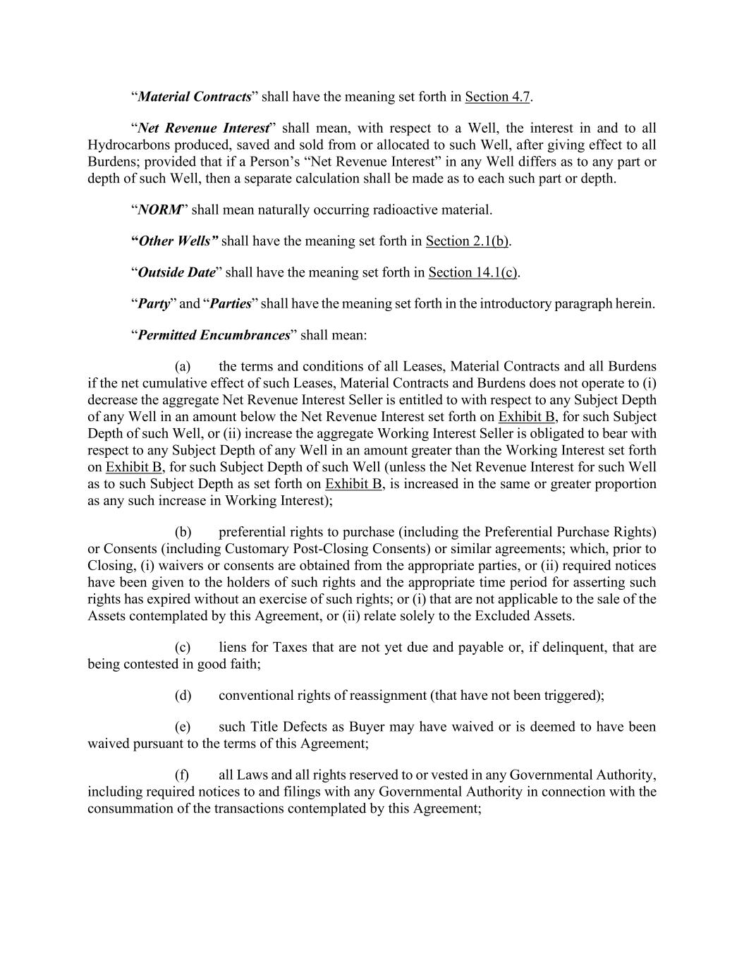 “Material Contracts” shall have the meaning set forth in Section 4.7. “Net Revenue Interest” shall mean, with respect to a Well, the interest in and to all Hydrocarbons produced, saved and sold from or allocated to such Well, after giving effect to all Burdens; provided that if a Person’s “Net Revenue Interest” in any Well differs as to any part or depth of such Well, then a separate calculation shall be made as to each such part or depth. “NORM” shall mean naturally occurring radioactive material. “Other Wells” shall have the meaning set forth in Section 2.1(b). “Outside Date” shall have the meaning set forth in Section 14.1(c). “Party” and “Parties” shall have the meaning set forth in the introductory paragraph herein. “Permitted Encumbrances” shall mean: (a) the terms and conditions of all Leases, Material Contracts and all Burdens if the net cumulative effect of such Leases, Material Contracts and Burdens does not operate to (i) decrease the aggregate Net Revenue Interest Seller is entitled to with respect to any Subject Depth of any Well in an amount below the Net Revenue Interest set forth on Exhibit B, for such Subject Depth of such Well, or (ii) increase the aggregate Working Interest Seller is obligated to bear with respect to any Subject Depth of any Well in an amount greater than the Working Interest set forth on Exhibit B, for such Subject Depth of such Well (unless the Net Revenue Interest for such Well as to such Subject Depth as set forth on Exhibit B, is increased in the same or greater proportion as any such increase in Working Interest); (b) preferential rights to purchase (including the Preferential Purchase Rights) or Consents (including Customary Post-Closing Consents) or similar agreements; which, prior to Closing, (i) waivers or consents are obtained from the appropriate parties, or (ii) required notices have been given to the holders of such rights and the appropriate time period for asserting such rights has expired without an exercise of such rights; or (i) that are not applicable to the sale of the Assets contemplated by this Agreement, or (ii) relate solely to the Excluded Assets. (c) liens for Taxes that are not yet due and payable or, if delinquent, that are being contested in good faith; (d) conventional rights of reassignment (that have not been triggered); (e) such Title Defects as Buyer may have waived or is deemed to have been waived pursuant to the terms of this Agreement; (f) all Laws and all rights reserved to or vested in any Governmental Authority, including required notices to and filings with any Governmental Authority in connection with the consummation of the transactions contemplated by this Agreement;