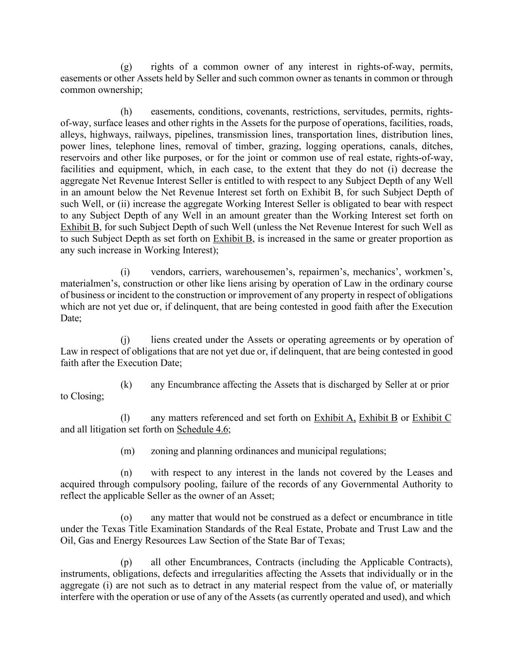(g) rights of a common owner of any interest in rights-of-way, permits, easements or other Assets held by Seller and such common owner as tenants in common or through common ownership; (h) easements, conditions, covenants, restrictions, servitudes, permits, rights- of-way, surface leases and other rights in the Assets for the purpose of operations, facilities, roads, alleys, highways, railways, pipelines, transmission lines, transportation lines, distribution lines, power lines, telephone lines, removal of timber, grazing, logging operations, canals, ditches, reservoirs and other like purposes, or for the joint or common use of real estate, rights-of-way, facilities and equipment, which, in each case, to the extent that they do not (i) decrease the aggregate Net Revenue Interest Seller is entitled to with respect to any Subject Depth of any Well in an amount below the Net Revenue Interest set forth on Exhibit B, for such Subject Depth of such Well, or (ii) increase the aggregate Working Interest Seller is obligated to bear with respect to any Subject Depth of any Well in an amount greater than the Working Interest set forth on Exhibit B, for such Subject Depth of such Well (unless the Net Revenue Interest for such Well as to such Subject Depth as set forth on Exhibit B, is increased in the same or greater proportion as any such increase in Working Interest); (i) vendors, carriers, warehousemen’s, repairmen’s, mechanics’, workmen’s, materialmen’s, construction or other like liens arising by operation of Law in the ordinary course of business or incident to the construction or improvement of any property in respect of obligations which are not yet due or, if delinquent, that are being contested in good faith after the Execution Date; (j) liens created under the Assets or operating agreements or by operation of Law in respect of obligations that are not yet due or, if delinquent, that are being contested in good faith after the Execution Date; (k) any Encumbrance affecting the Assets that is discharged by Seller at or prior to Closing; (l) any matters referenced and set forth on Exhibit A, Exhibit B or Exhibit C and all litigation set forth on Schedule 4.6; (m) zoning and planning ordinances and municipal regulations; (n) with respect to any interest in the lands not covered by the Leases and acquired through compulsory pooling, failure of the records of any Governmental Authority to reflect the applicable Seller as the owner of an Asset; (o) any matter that would not be construed as a defect or encumbrance in title under the Texas Title Examination Standards of the Real Estate, Probate and Trust Law and the Oil, Gas and Energy Resources Law Section of the State Bar of Texas; (p) all other Encumbrances, Contracts (including the Applicable Contracts), instruments, obligations, defects and irregularities affecting the Assets that individually or in the aggregate (i) are not such as to detract in any material respect from the value of, or materially interfere with the operation or use of any of the Assets (as currently operated and used), and which