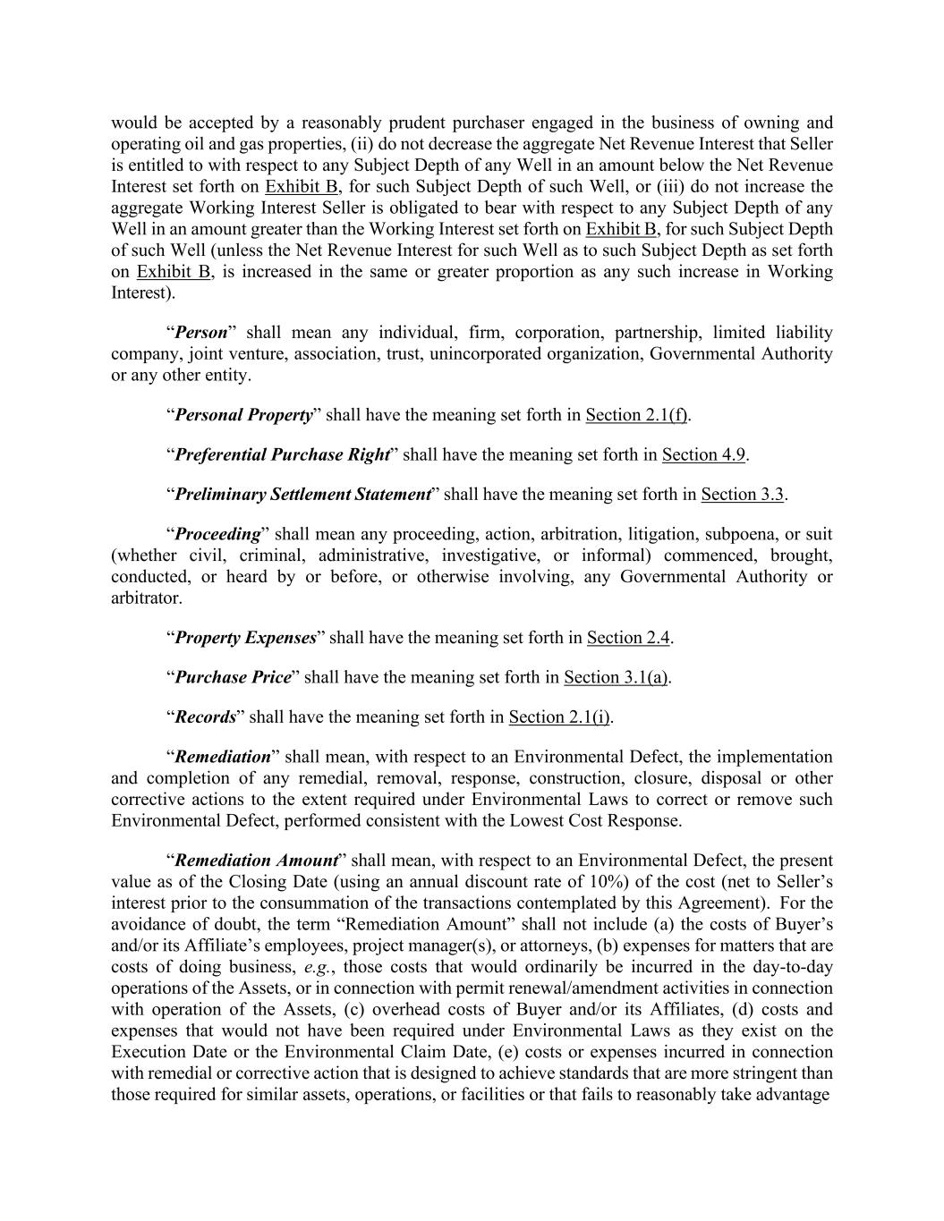 would be accepted by a reasonably prudent purchaser engaged in the business of owning and operating oil and gas properties, (ii) do not decrease the aggregate Net Revenue Interest that Seller is entitled to with respect to any Subject Depth of any Well in an amount below the Net Revenue Interest set forth on Exhibit B, for such Subject Depth of such Well, or (iii) do not increase the aggregate Working Interest Seller is obligated to bear with respect to any Subject Depth of any Well in an amount greater than the Working Interest set forth on Exhibit B, for such Subject Depth of such Well (unless the Net Revenue Interest for such Well as to such Subject Depth as set forth on Exhibit B, is increased in the same or greater proportion as any such increase in Working Interest). “Person” shall mean any individual, firm, corporation, partnership, limited liability company, joint venture, association, trust, unincorporated organization, Governmental Authority or any other entity. “Personal Property” shall have the meaning set forth in Section 2.1(f). “Preferential Purchase Right” shall have the meaning set forth in Section 4.9. “Preliminary Settlement Statement” shall have the meaning set forth in Section 3.3. “Proceeding” shall mean any proceeding, action, arbitration, litigation, subpoena, or suit (whether civil, criminal, administrative, investigative, or informal) commenced, brought, conducted, or heard by or before, or otherwise involving, any Governmental Authority or arbitrator. “Property Expenses” shall have the meaning set forth in Section 2.4. “Purchase Price” shall have the meaning set forth in Section 3.1(a). “Records” shall have the meaning set forth in Section 2.1(i). “Remediation” shall mean, with respect to an Environmental Defect, the implementation and completion of any remedial, removal, response, construction, closure, disposal or other corrective actions to the extent required under Environmental Laws to correct or remove such Environmental Defect, performed consistent with the Lowest Cost Response. “Remediation Amount” shall mean, with respect to an Environmental Defect, the present value as of the Closing Date (using an annual discount rate of 10%) of the cost (net to Seller’s interest prior to the consummation of the transactions contemplated by this Agreement). For the avoidance of doubt, the term “Remediation Amount” shall not include (a) the costs of Buyer’s and/or its Affiliate’s employees, project manager(s), or attorneys, (b) expenses for matters that are costs of doing business, e.g., those costs that would ordinarily be incurred in the day-to-day operations of the Assets, or in connection with permit renewal/amendment activities in connection with operation of the Assets, (c) overhead costs of Buyer and/or its Affiliates, (d) costs and expenses that would not have been required under Environmental Laws as they exist on the Execution Date or the Environmental Claim Date, (e) costs or expenses incurred in connection with remedial or corrective action that is designed to achieve standards that are more stringent than those required for similar assets, operations, or facilities or that fails to reasonably take advantage