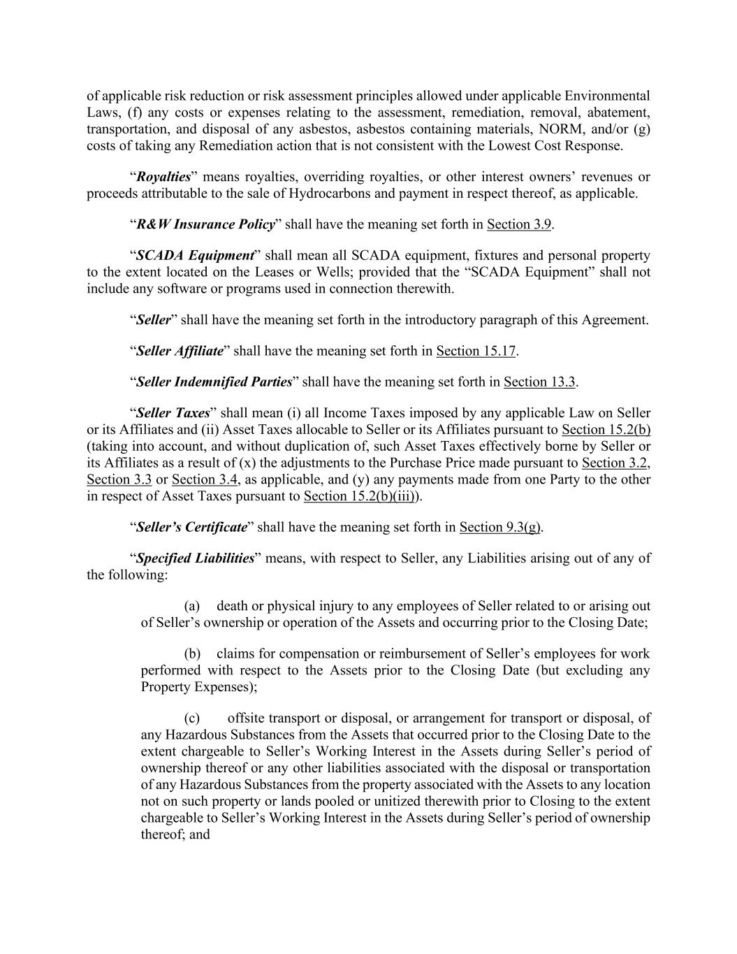 of applicable risk reduction or risk assessment principles allowed under applicable Environmental Laws, (f) any costs or expenses relating to the assessment, remediation, removal, abatement, transportation, and disposal of any asbestos, asbestos containing materials, NORM, and/or (g) costs of taking any Remediation action that is not consistent with the Lowest Cost Response. “Royalties” means royalties, overriding royalties, or other interest owners’ revenues or proceeds attributable to the sale of Hydrocarbons and payment in respect thereof, as applicable. “R&W Insurance Policy” shall have the meaning set forth in Section 3.9. “SCADA Equipment” shall mean all SCADA equipment, fixtures and personal property to the extent located on the Leases or Wells; provided that the “SCADA Equipment” shall not include any software or programs used in connection therewith. “Seller” shall have the meaning set forth in the introductory paragraph of this Agreement. “Seller Affiliate” shall have the meaning set forth in Section 15.17. “Seller Indemnified Parties” shall have the meaning set forth in Section 13.3. “Seller Taxes” shall mean (i) all Income Taxes imposed by any applicable Law on Seller or its Affiliates and (ii) Asset Taxes allocable to Seller or its Affiliates pursuant to Section 15.2(b) (taking into account, and without duplication of, such Asset Taxes effectively borne by Seller or its Affiliates as a result of (x) the adjustments to the Purchase Price made pursuant to Section 3.2, Section 3.3 or Section 3.4, as applicable, and (y) any payments made from one Party to the other in respect of Asset Taxes pursuant to Section 15.2(b)(iii)). “Seller’s Certificate” shall have the meaning set forth in Section 9.3(g). “Specified Liabilities” means, with respect to Seller, any Liabilities arising out of any of the following: (a) death or physical injury to any employees of Seller related to or arising out of Seller’s ownership or operation of the Assets and occurring prior to the Closing Date; (b) claims for compensation or reimbursement of Seller’s employees for work performed with respect to the Assets prior to the Closing Date (but excluding any Property Expenses); (c) offsite transport or disposal, or arrangement for transport or disposal, of any Hazardous Substances from the Assets that occurred prior to the Closing Date to the extent chargeable to Seller’s Working Interest in the Assets during Seller’s period of ownership thereof or any other liabilities associated with the disposal or transportation of any Hazardous Substances from the property associated with the Assets to any location not on such property or lands pooled or unitized therewith prior to Closing to the extent chargeable to Seller’s Working Interest in the Assets during Seller’s period of ownership thereof; and